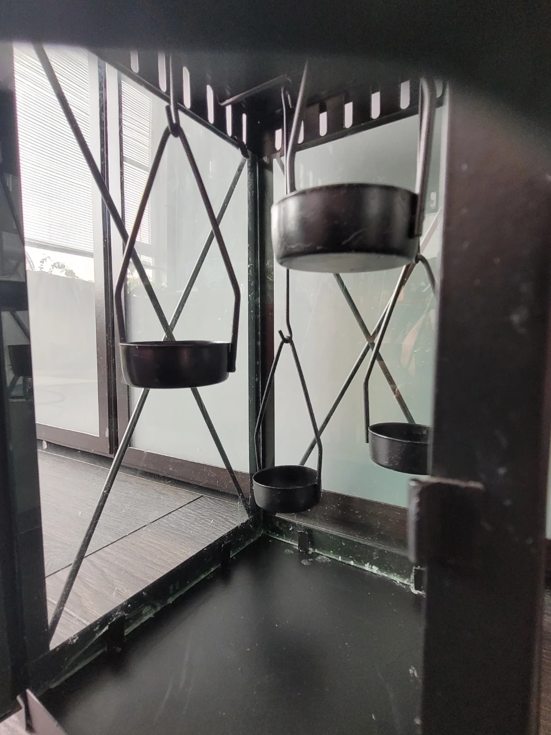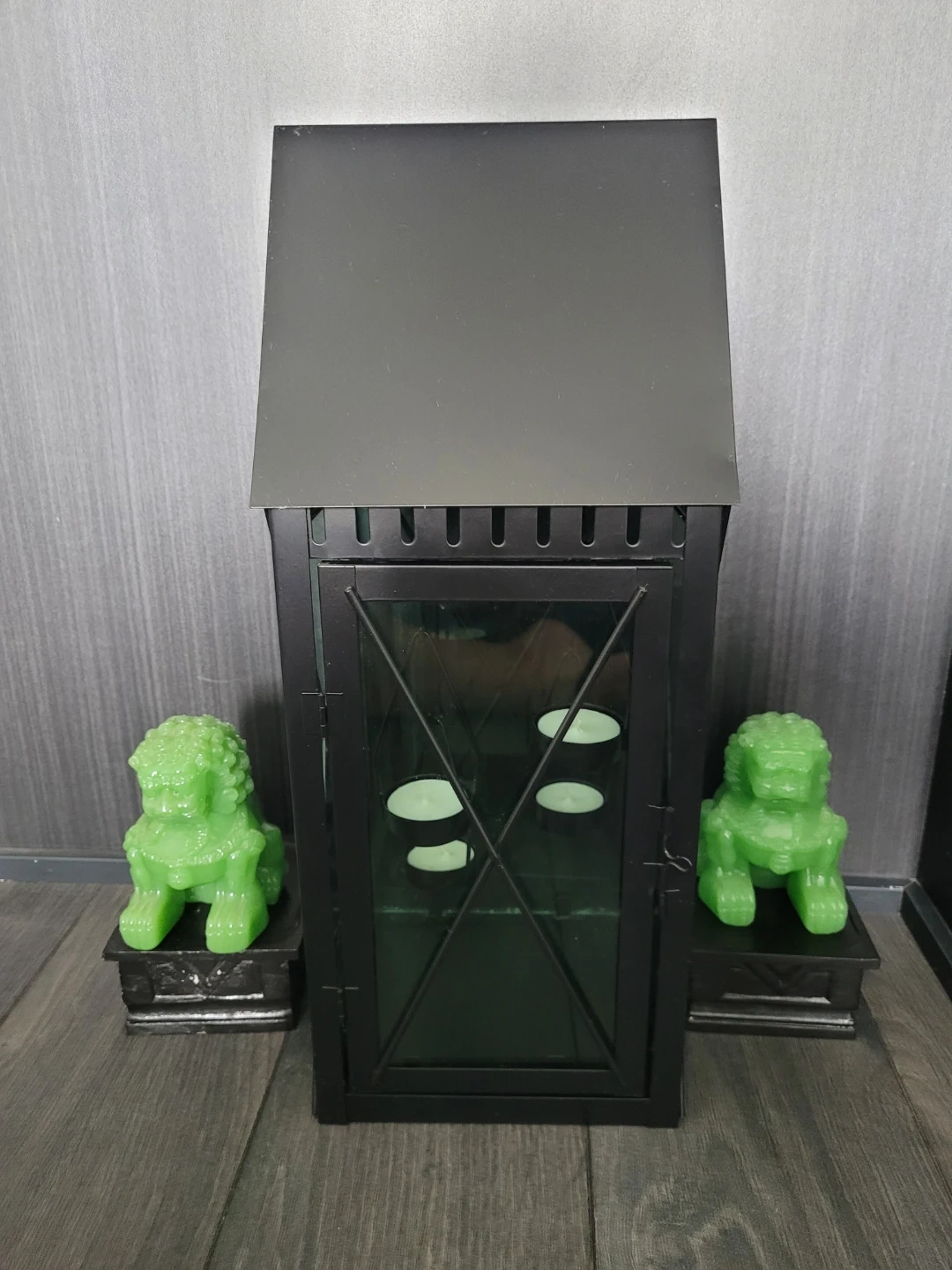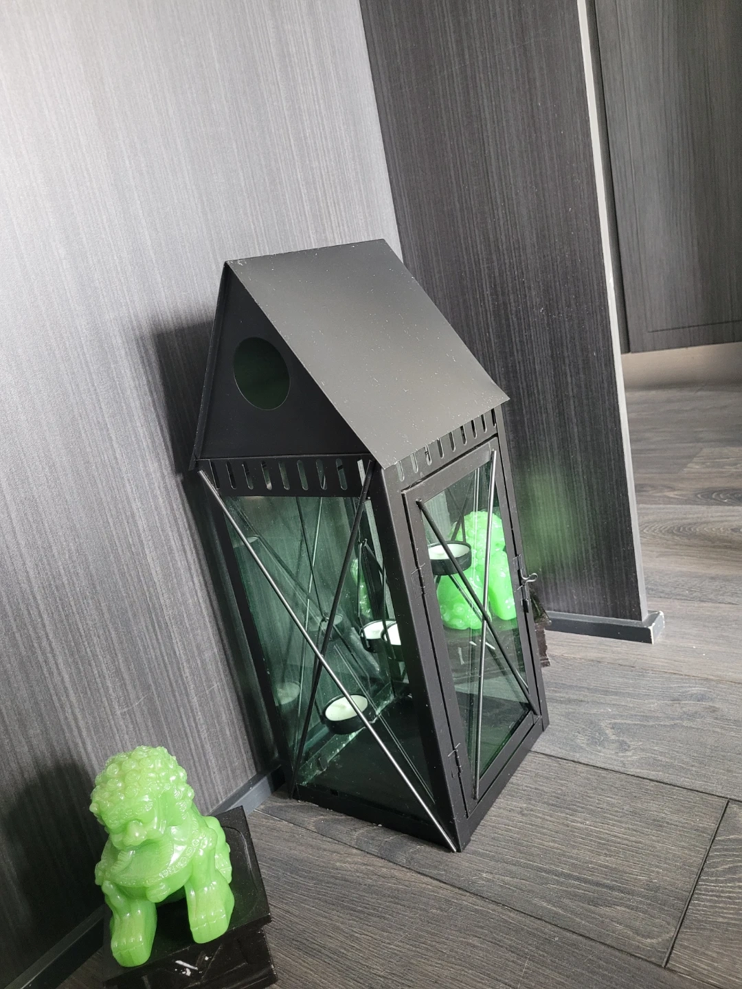 Selling a black metal candle lantern! It's in great shape and ready to add a cozy touch to your home. Perfect for creating a warm and inviting atmosphere, glass is small Crack in it on one side.