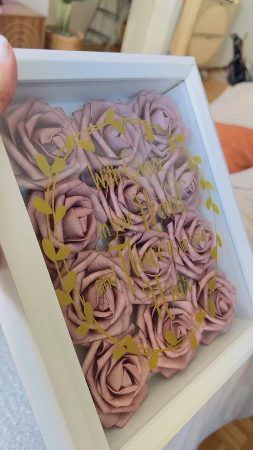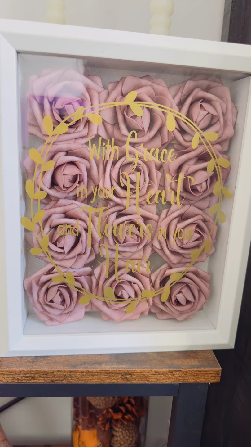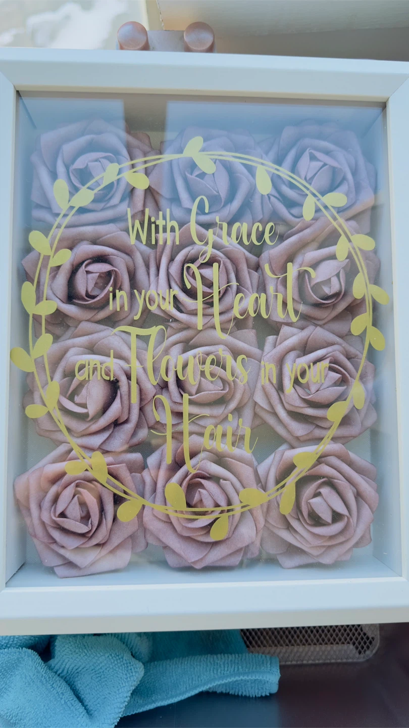 Handmade shadowbox frame featuring beautiful roses and the words "With Grace in your Heart and Flowers in your Hair". Size 8x10