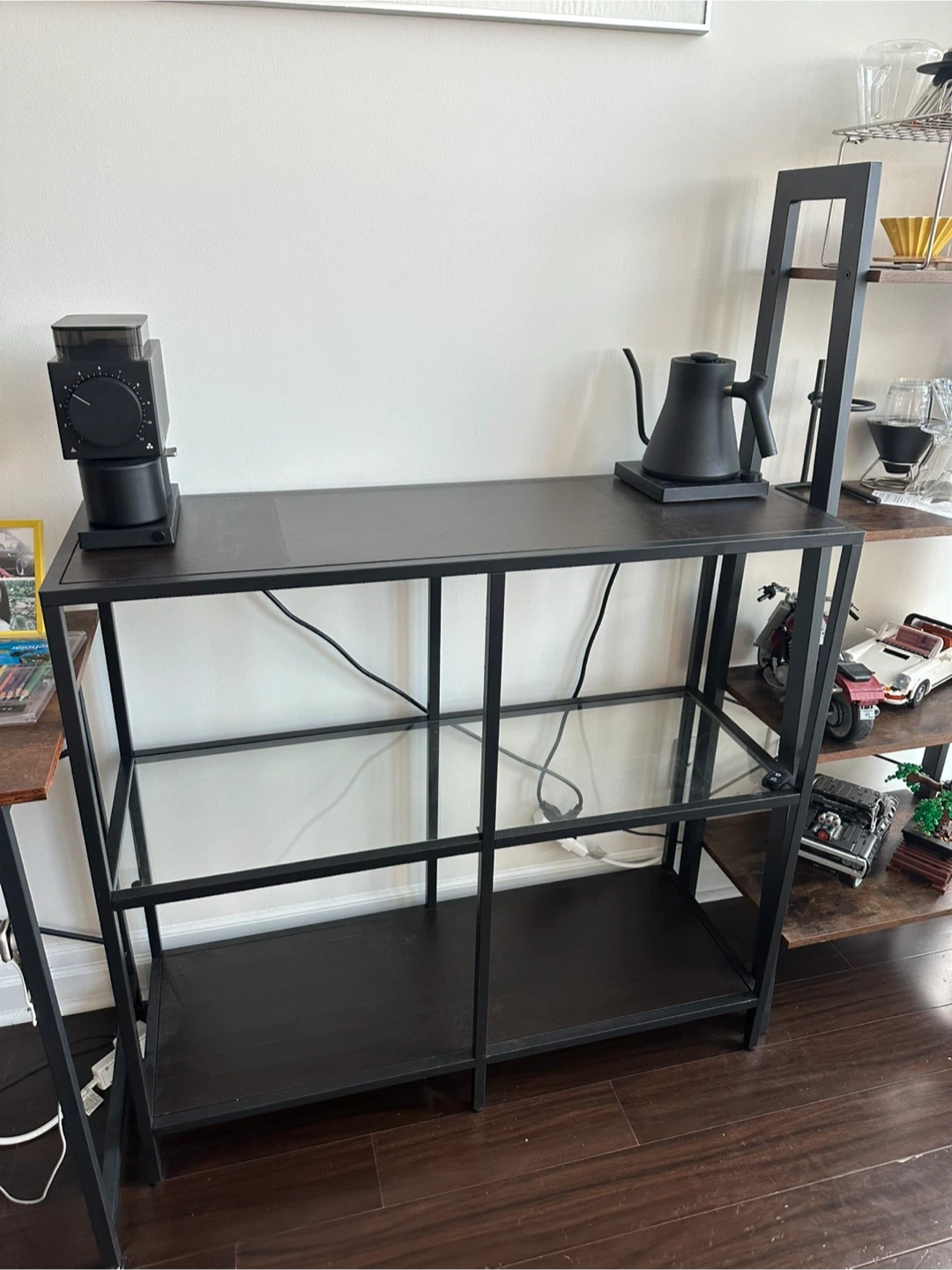 Here's a stylish black metal frame shelf unit that's perfect for adding some storage and display space to your home. It features a sturdy metal frame with glass shelves, offering a modern and minimalist look. It's in great condition and ready to use!