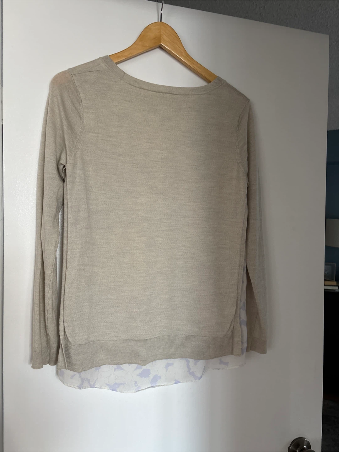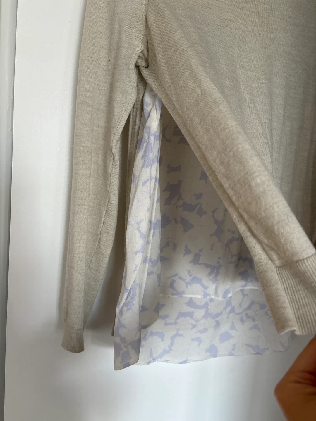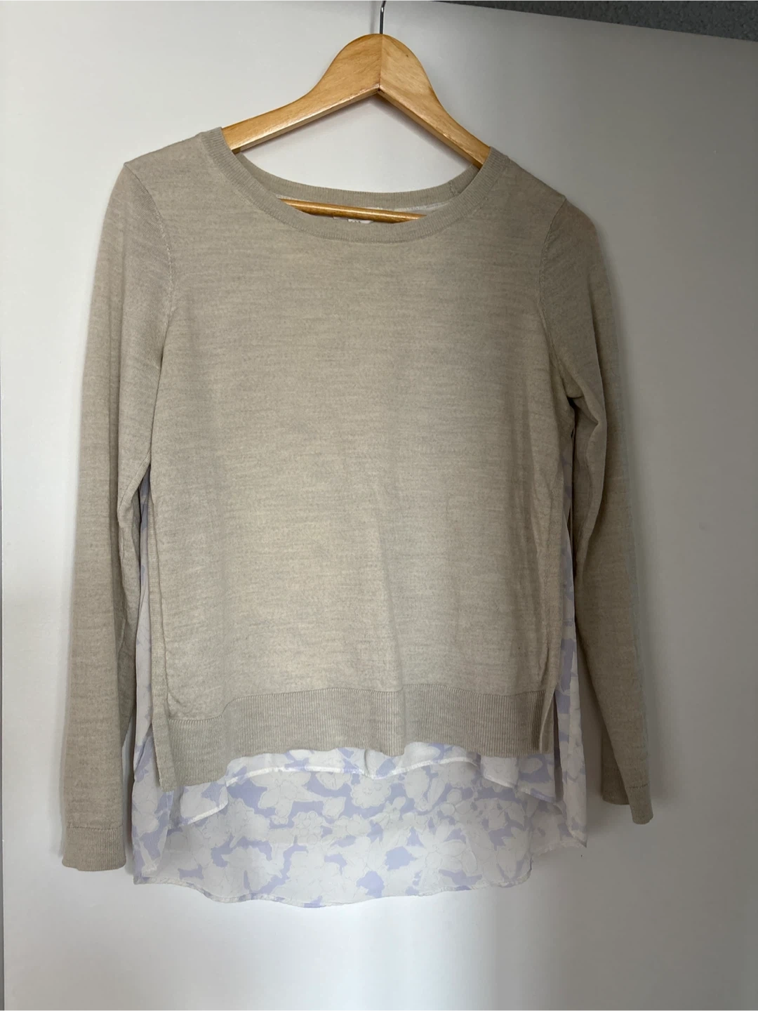 Selling a Club Monaco wool sweater in a lovely warm grey colour. It's a size M/M and features a stylish design with a floral patterned silk as lining. Perfect for layering or wearing on its own!