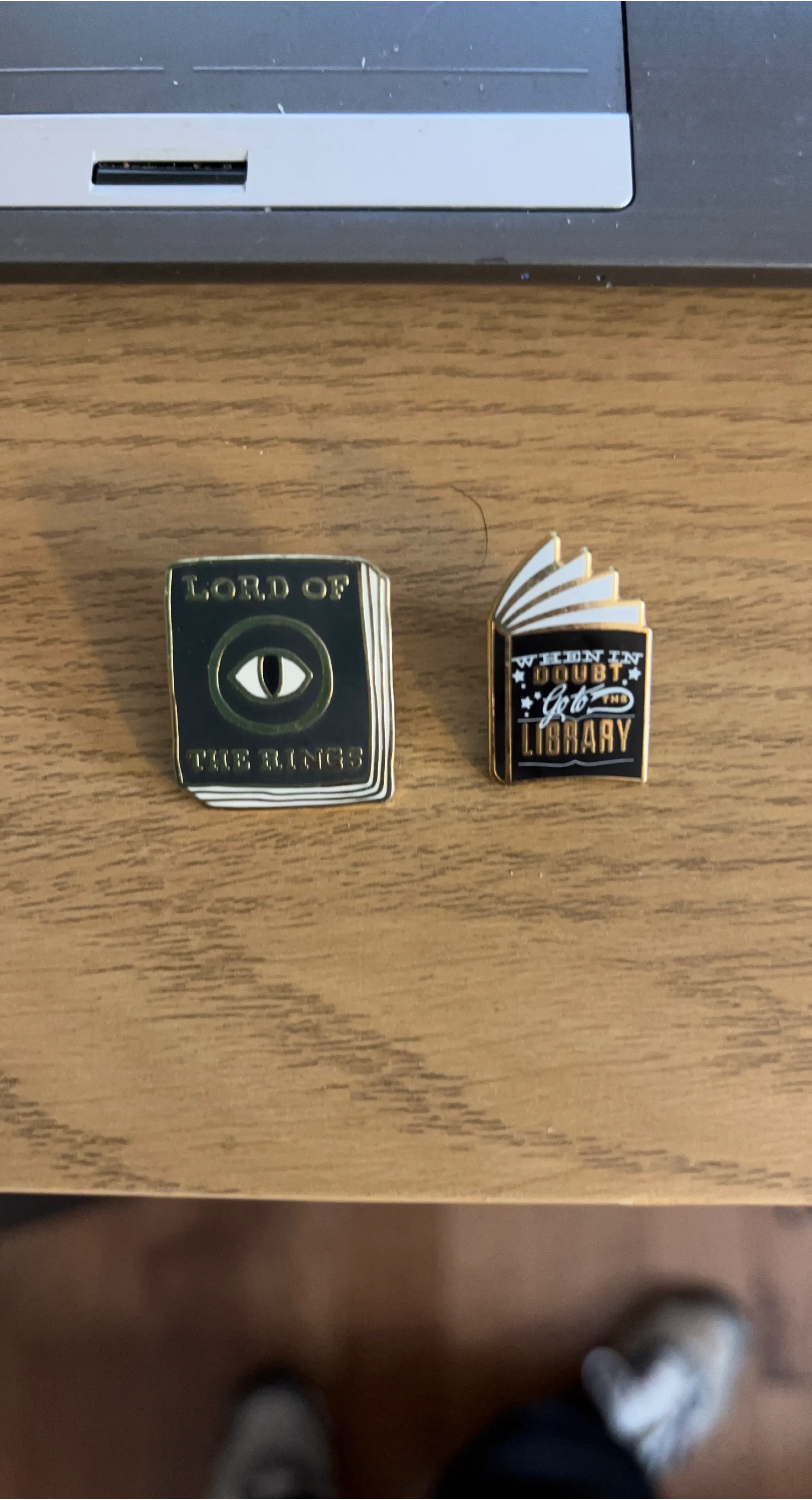 Selling two cute enamel pins! One is Lord of the Rings themed and the other says 'When in doubt, go to the library'. They're in great condition and perfect for any book lover or Tolkien fan