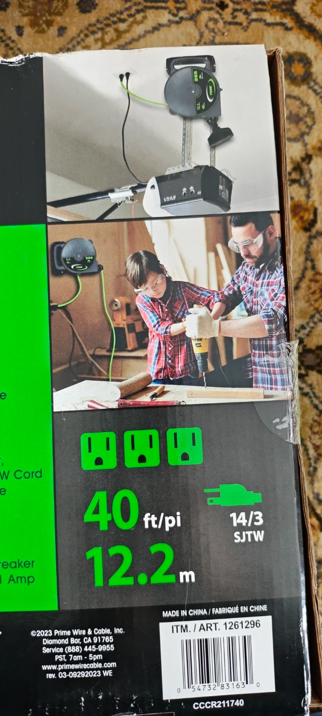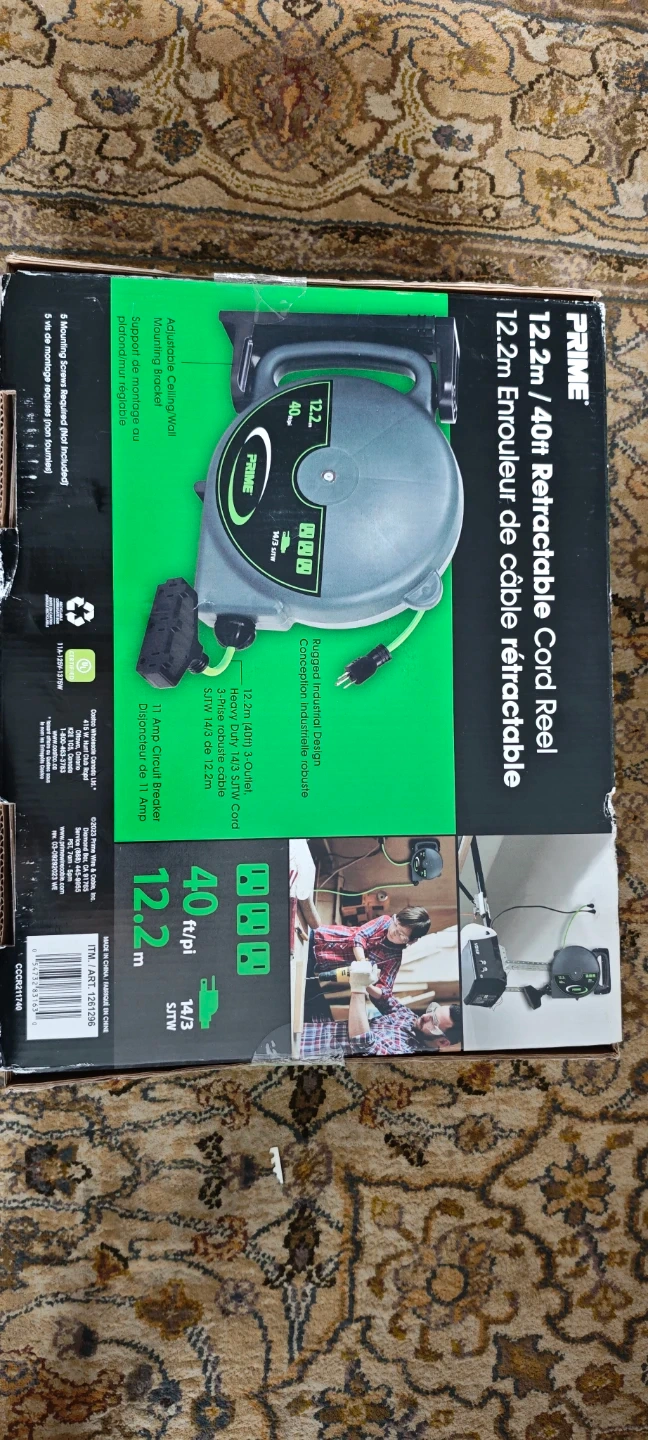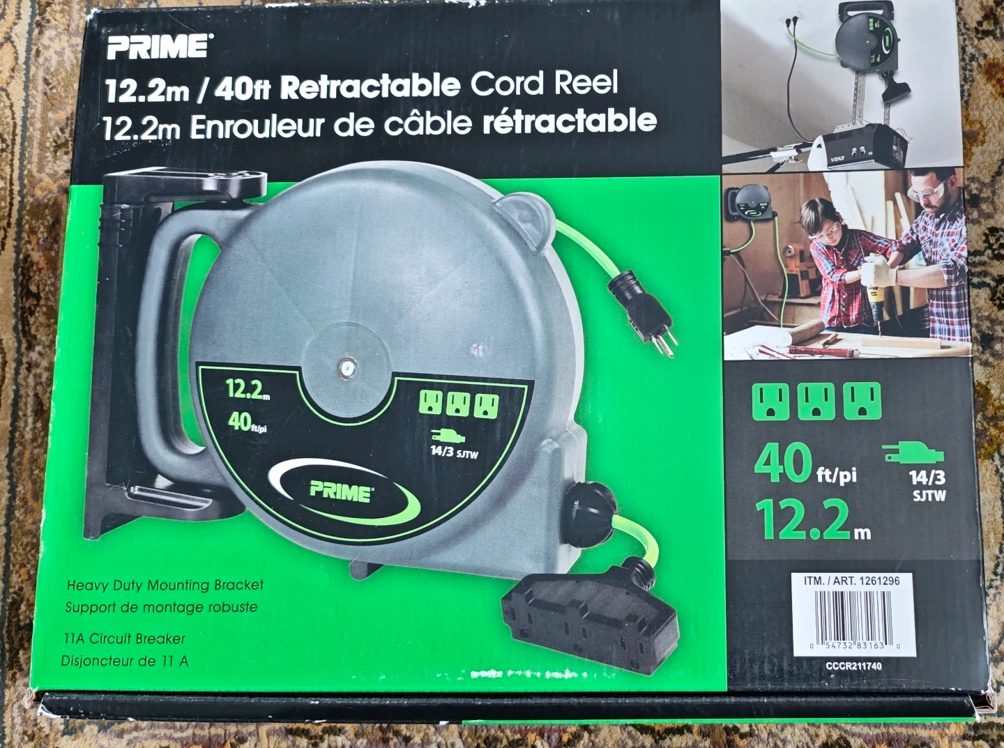 Selling a brand new PRIME 12.2m/40ft Retractable Cord Reel, still in its original packaging! It features a heavy-duty mounting bracket and an 11A circuit breaker. The cord is 14/3 SJTW.