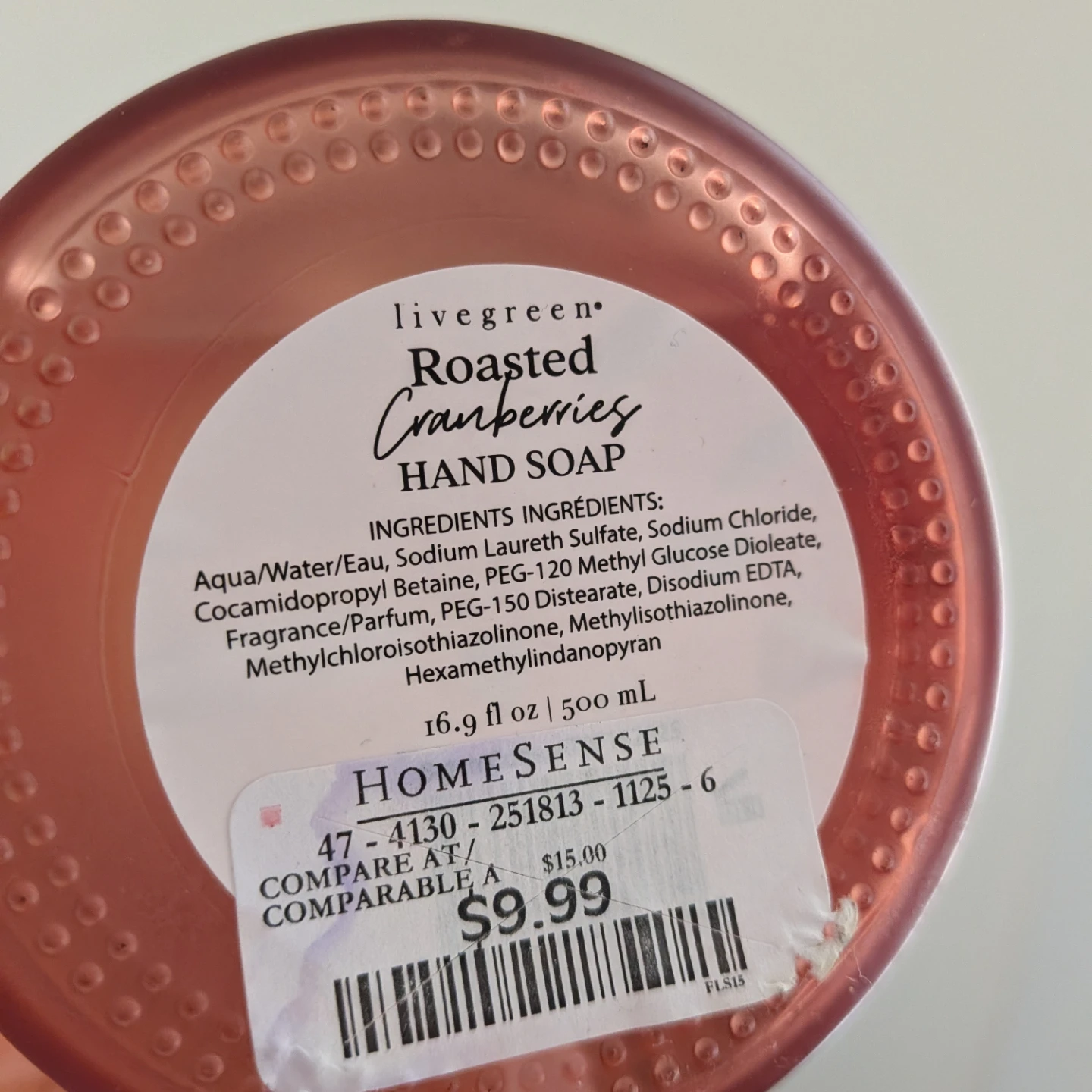 I'm selling a bottle of Live Green Roasted Cranberries hand soap! It's a 16.9 fl oz (500 mL) bottle.