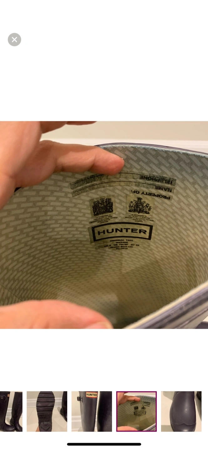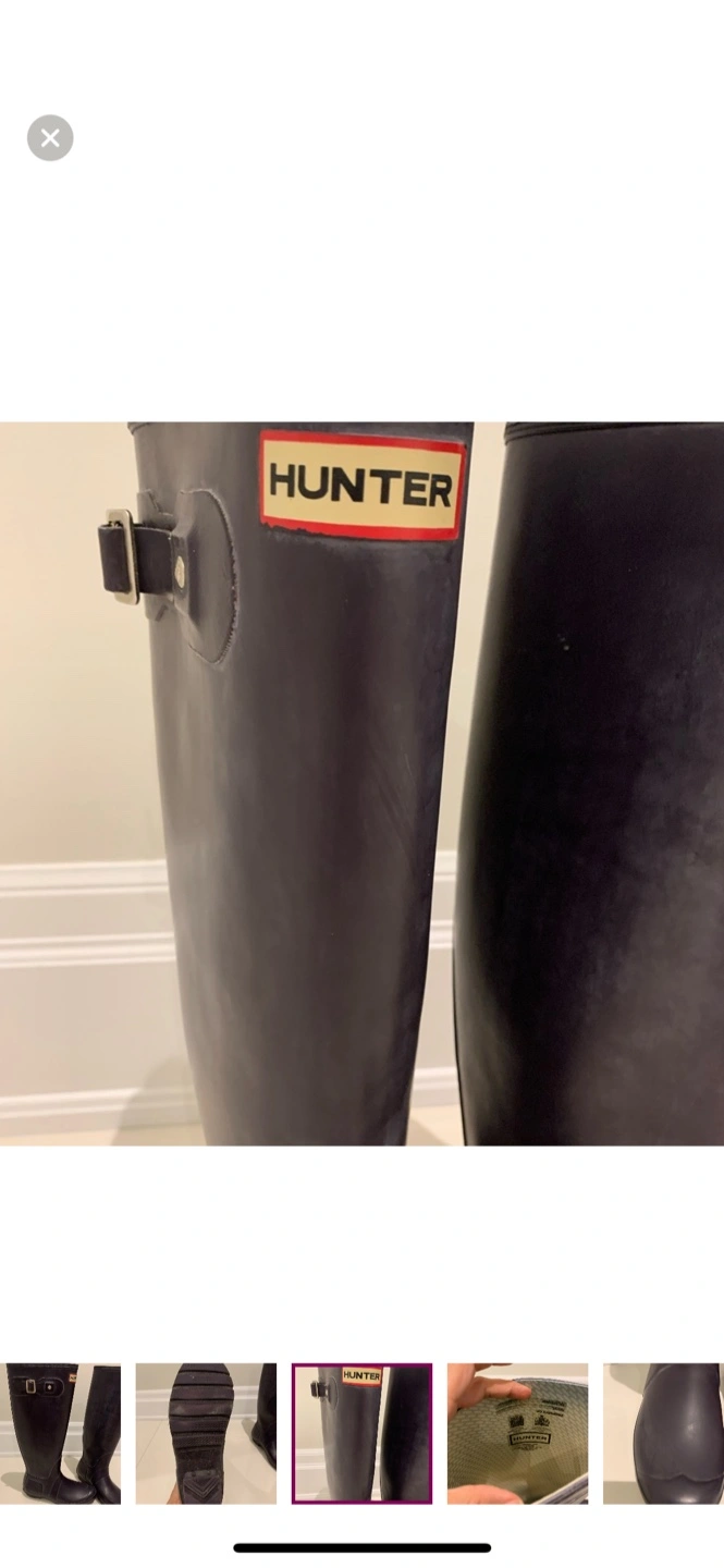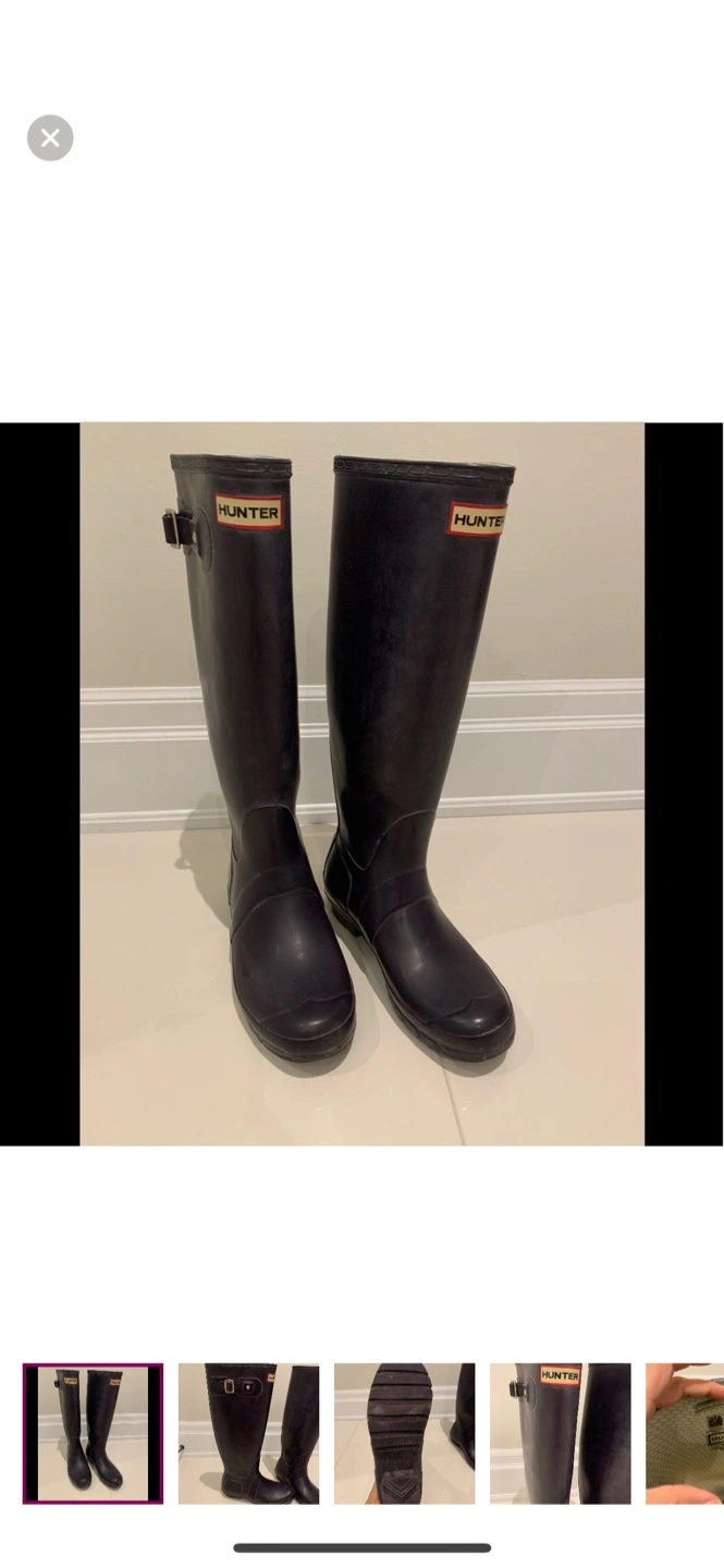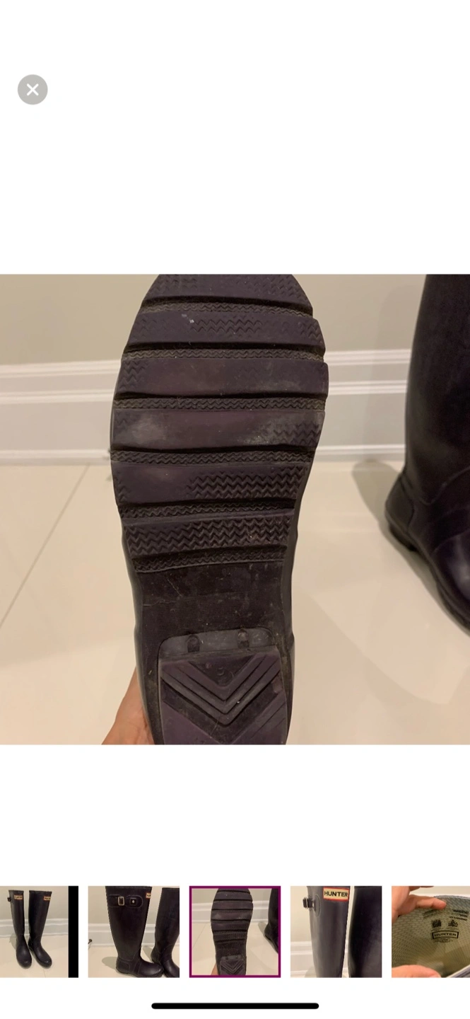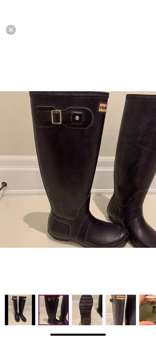 Selling a pair of Hunter women's tall rain boots in a dark purple /gray colour. They are in excellent condition and ready for those rainy days!