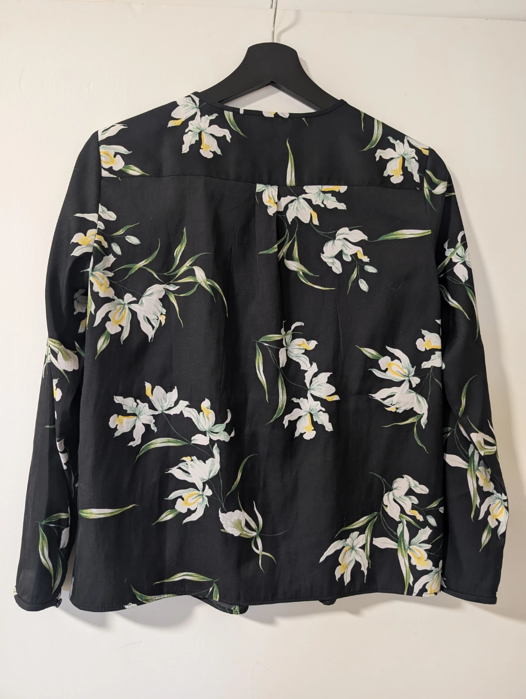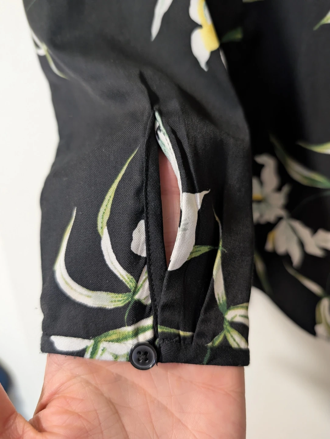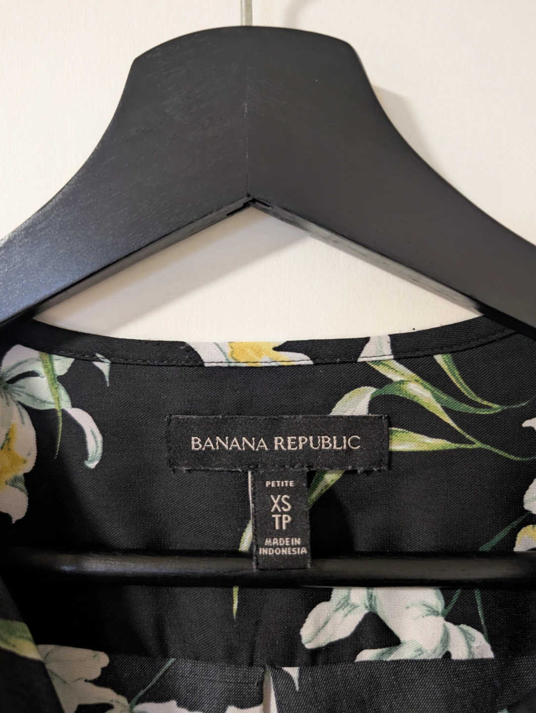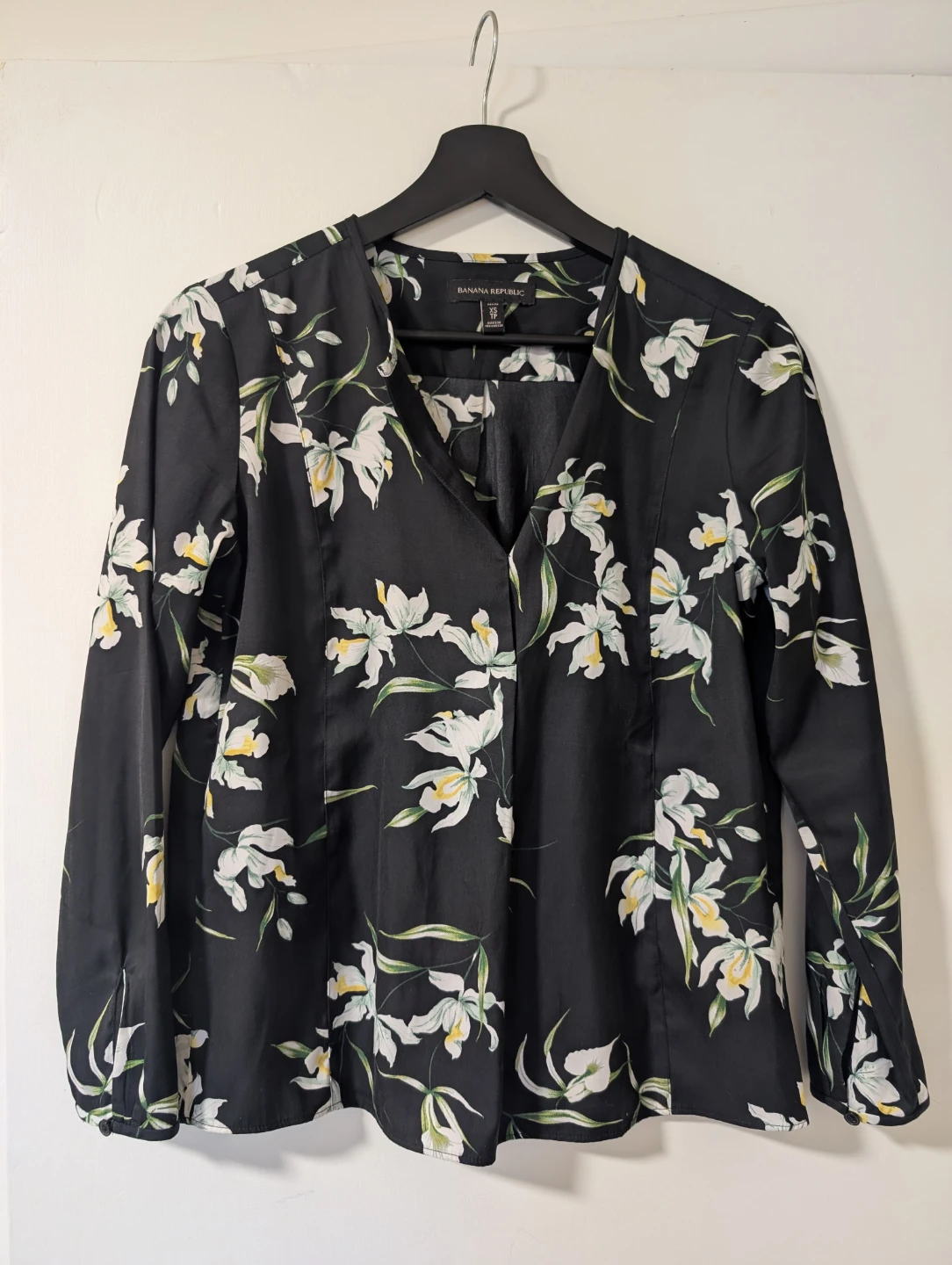 Here's a lovely Banana Republic blouse with a beautiful floral pattern! Super soft and comfortable fabric. It's a size XS Petite, perfect for a smaller frame. The blouse features long sleeves and a button detail on the cuff. It's in great condition and ready for a new home!