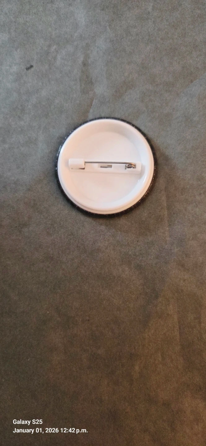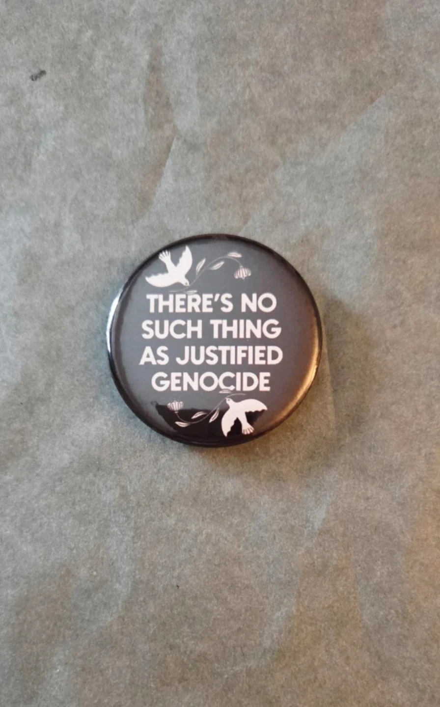 Selling a button with the text 'There's No Such Thing As Justified Genocide' .