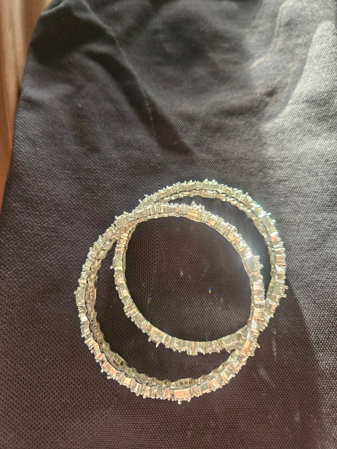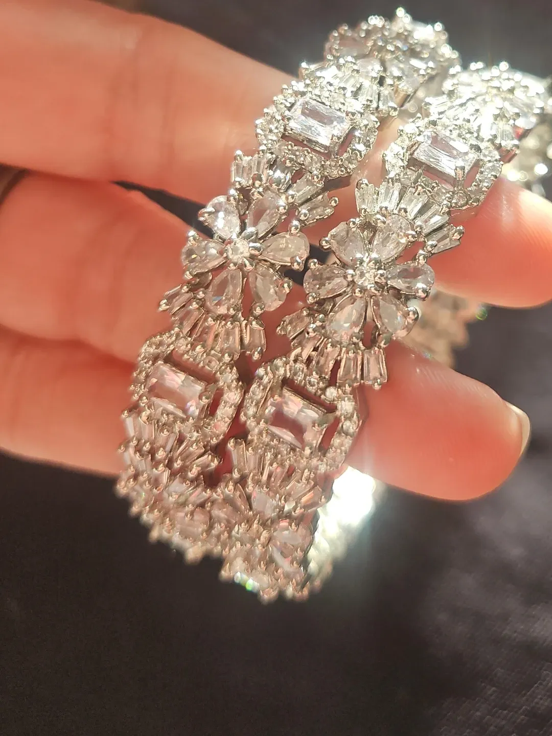 Selling a beautiful sparkly silver bracelet! The design features a mix of floral and geometric shapes, giving it a unique and eye-catching look. Very versatile.