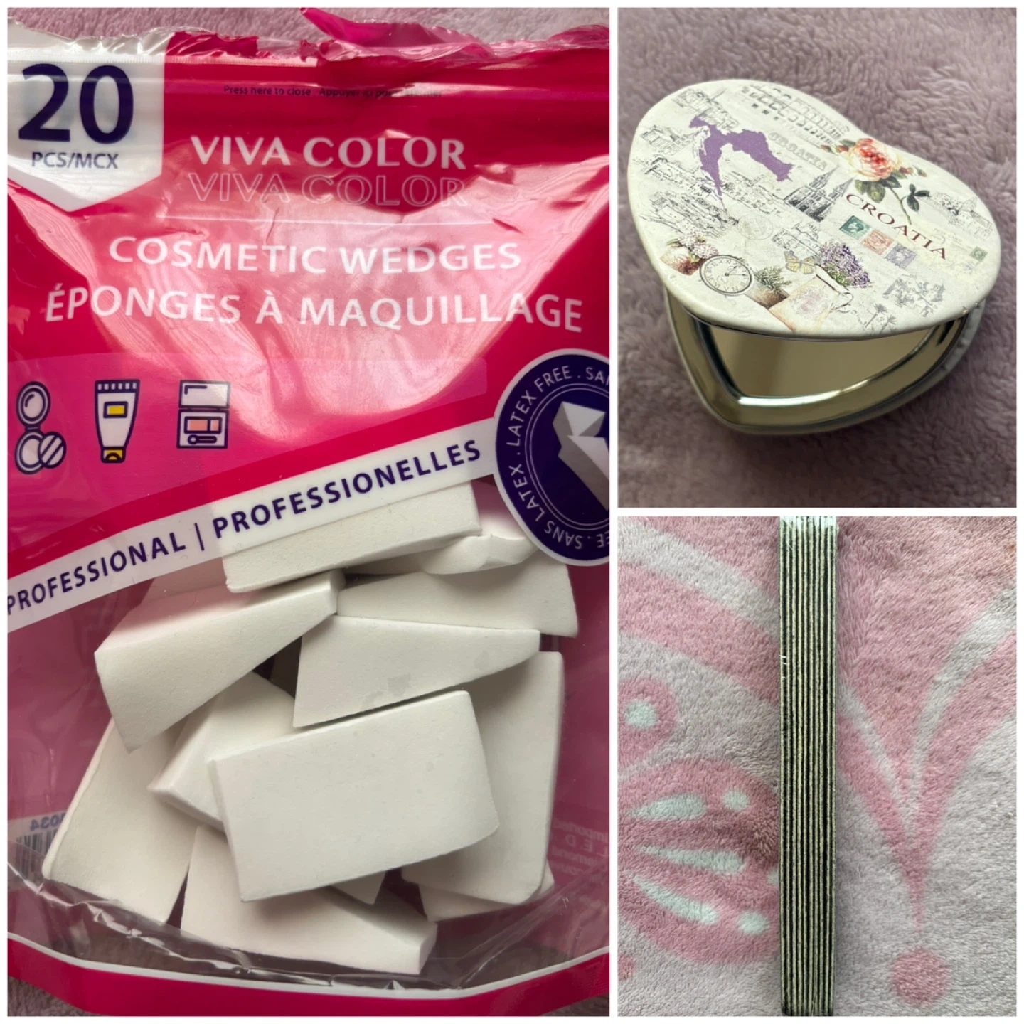 For free is a pack of cosmetic wedges, a cute heart-shaped Croatia mirror, and a pack of nail filers.