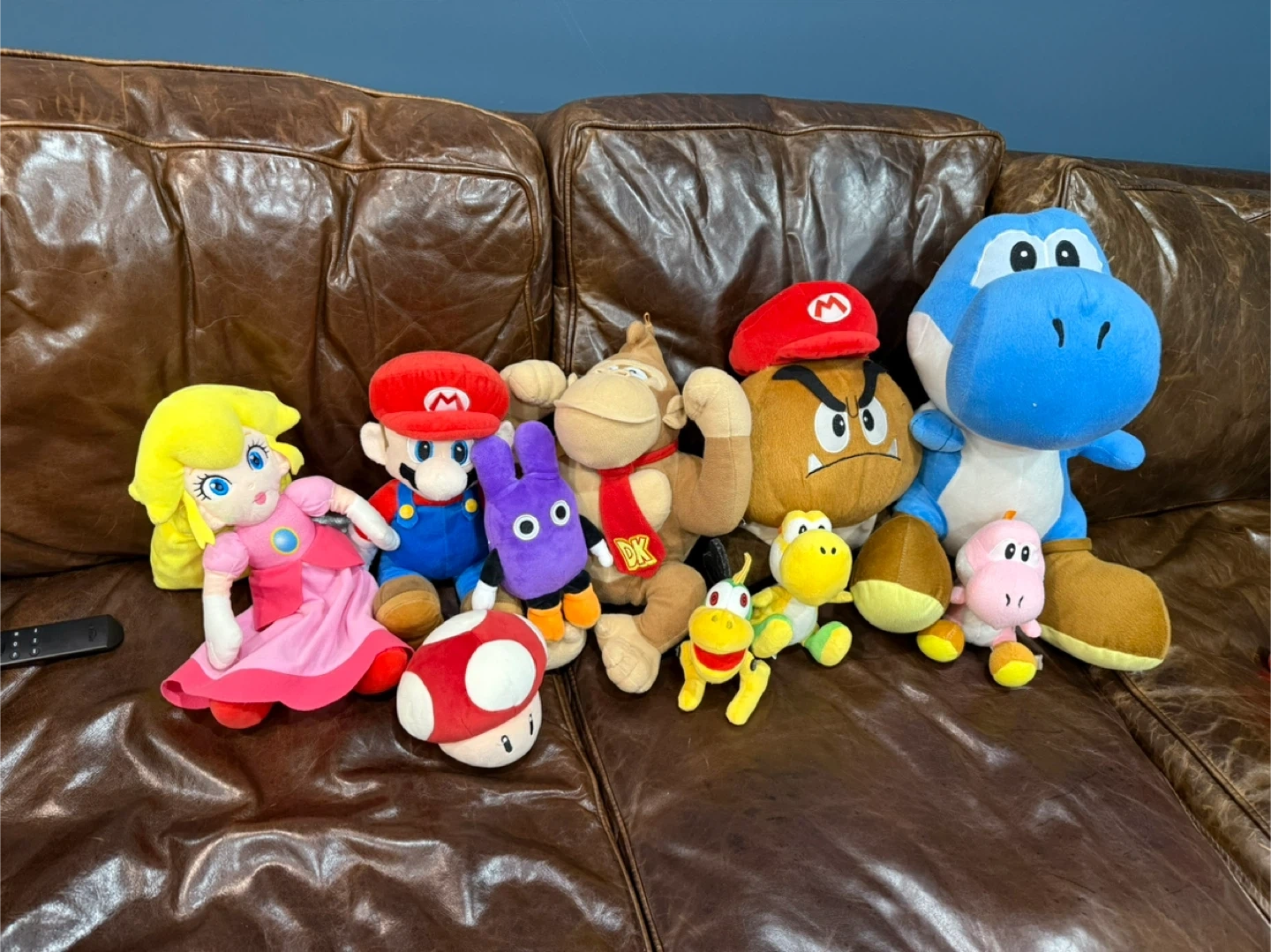 Selling a collection of Nintendo Super Mario plush toys! Includes Mario, Princess Peach, Donkey Kong, Goomba, Yoshi (blue and pink), a mushroom, and more. They're in great condition and ready for a new home!