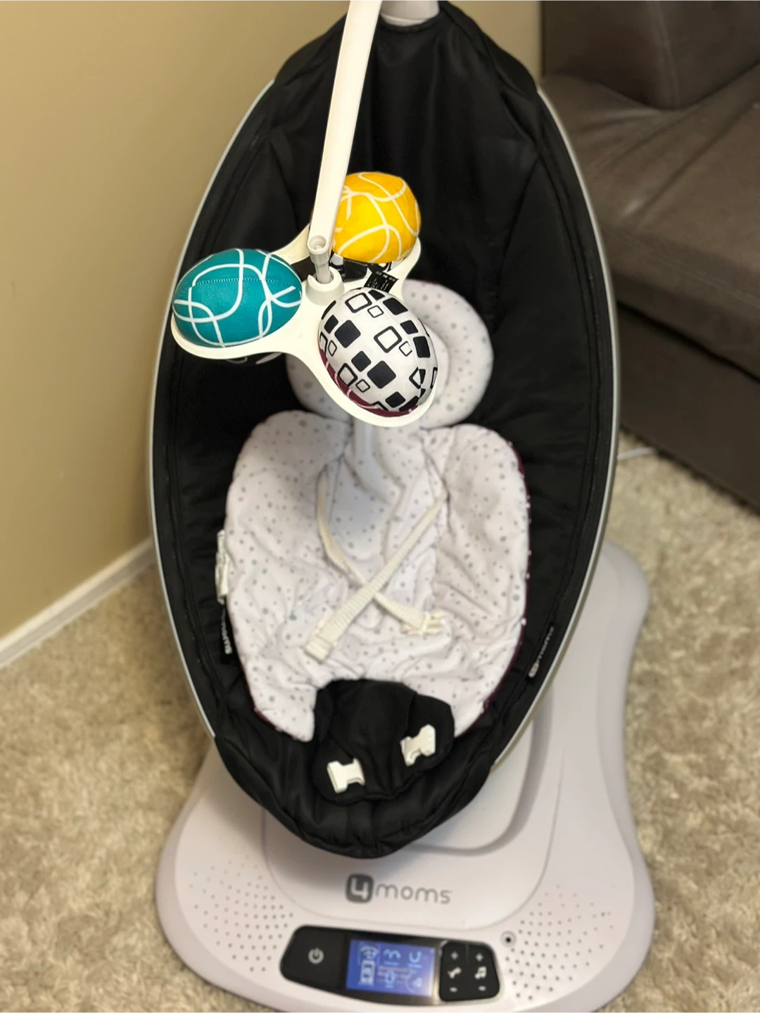 Selling a 4moms mamaRoo baby swing. It's in great condition and ready for a new little one! This swing has multiple motions and speeds to soothe your baby. The seat is black with a patterned purple insert. It also has an overhead mobile with colourful balls to entertain your baby