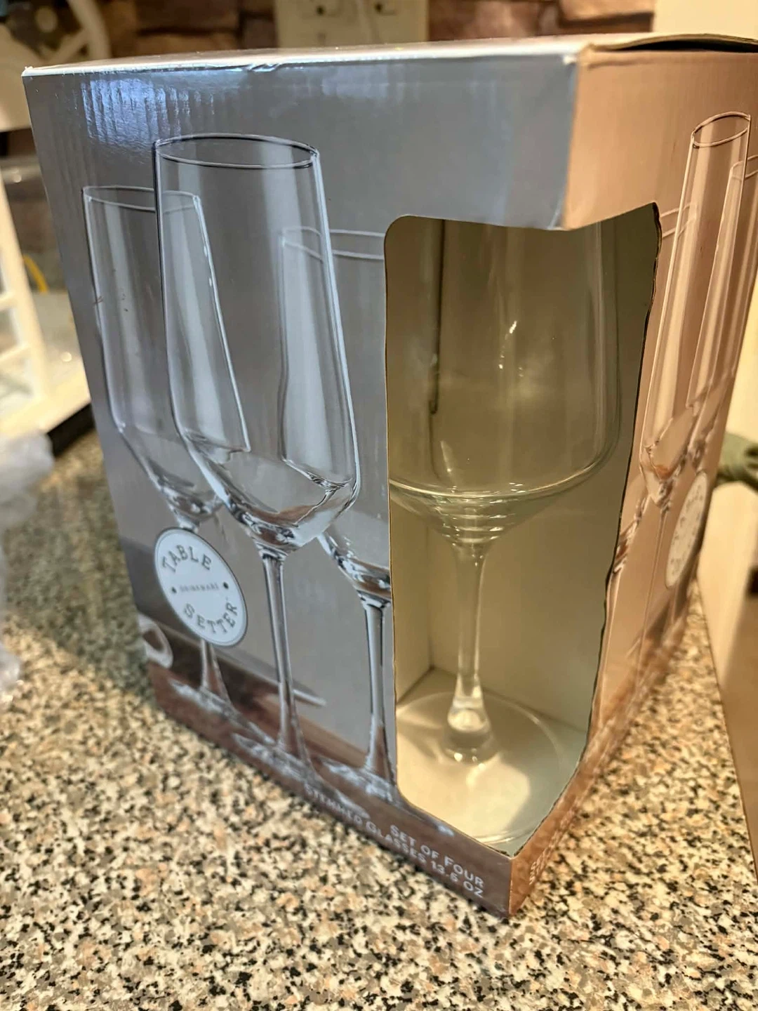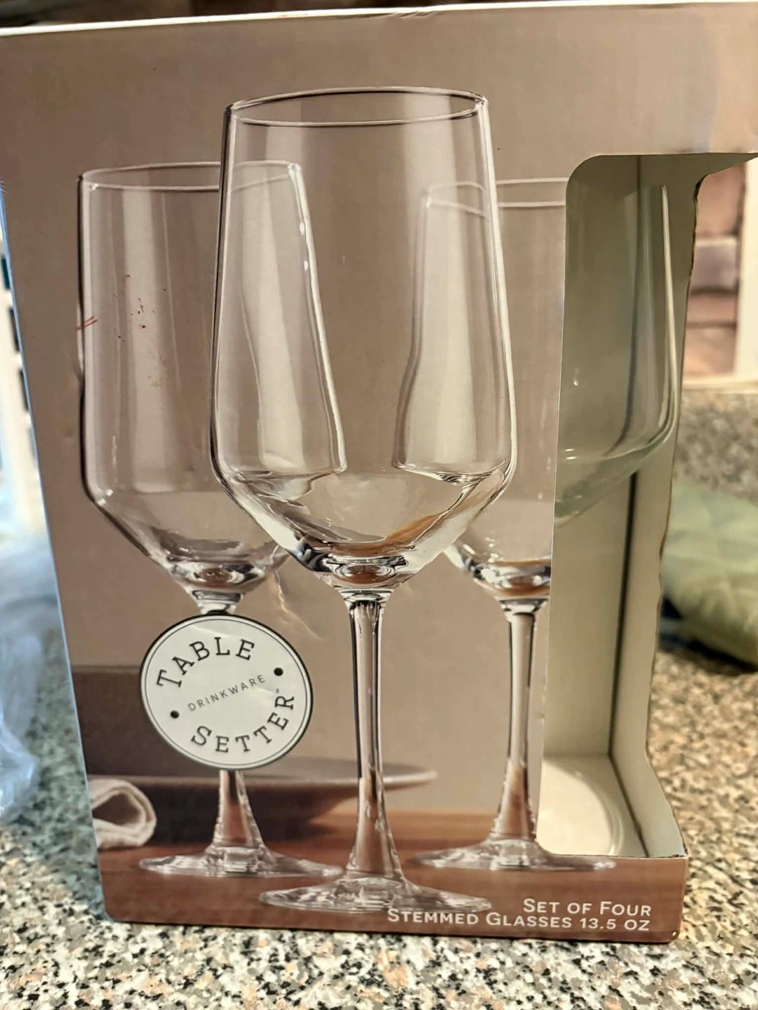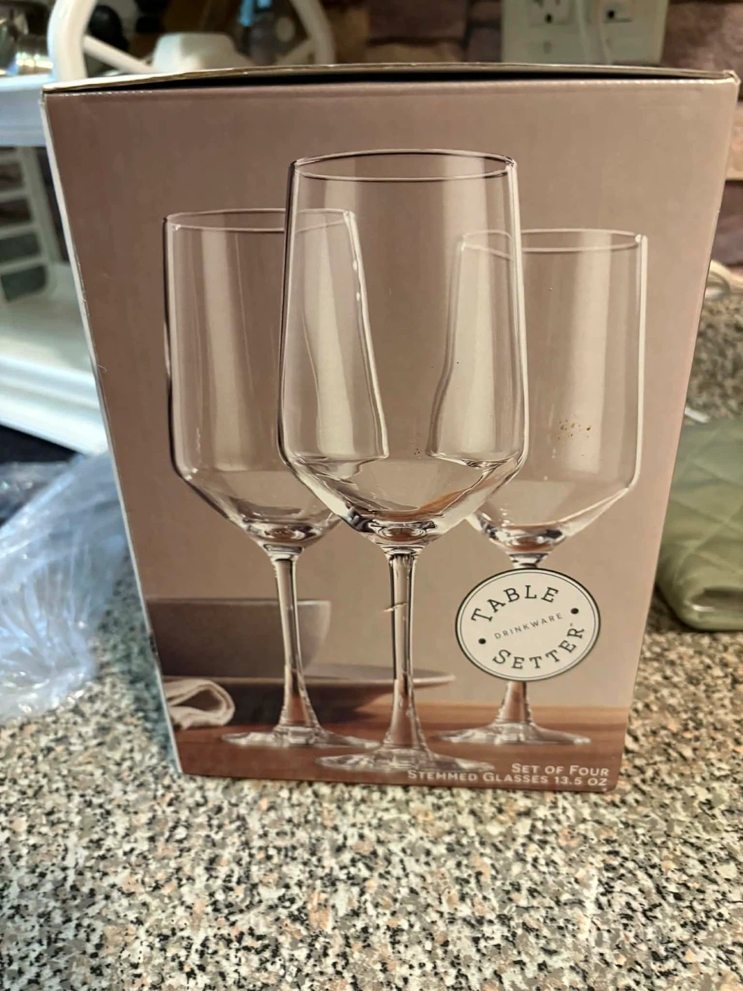 Selling a set of four stemmed glasses from Table Setter. They are 13.5 oz each and come in the original box. Perfect for any occasion!