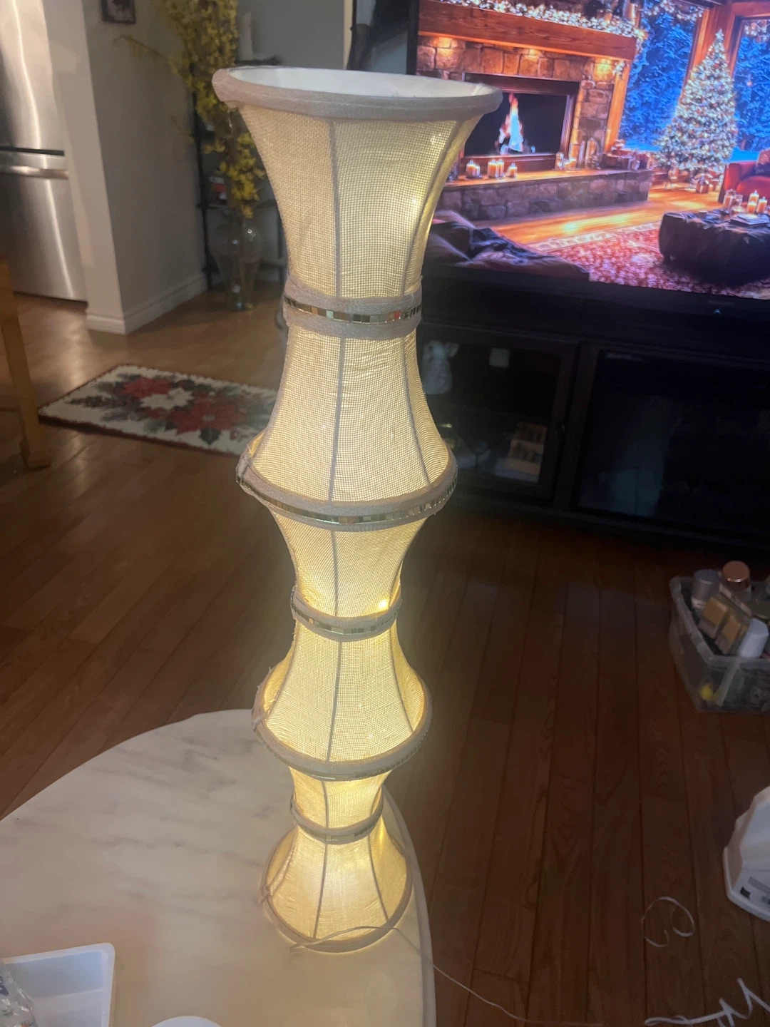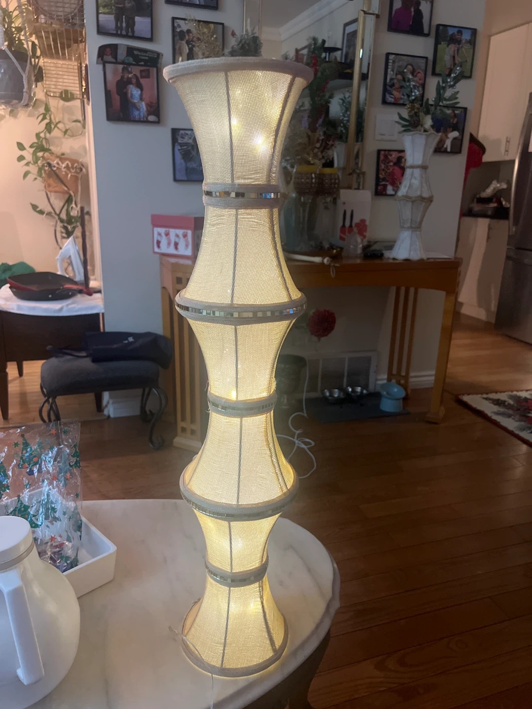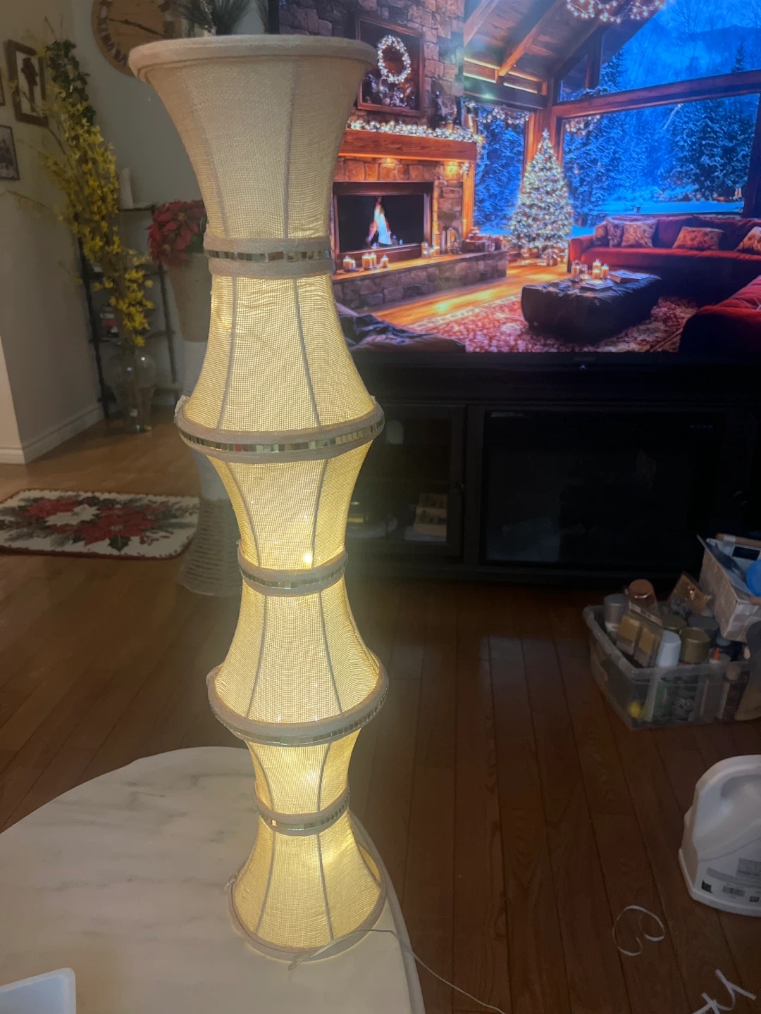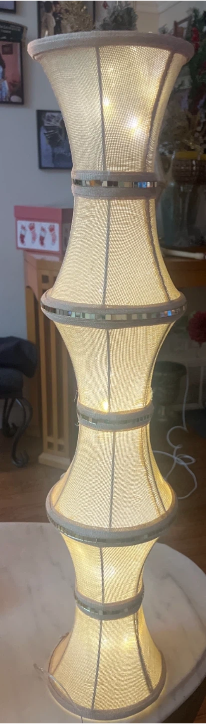 Selling a unique floor lamp! It has a beige shade and a distinctive design. It would look great in any living room or bedroom.