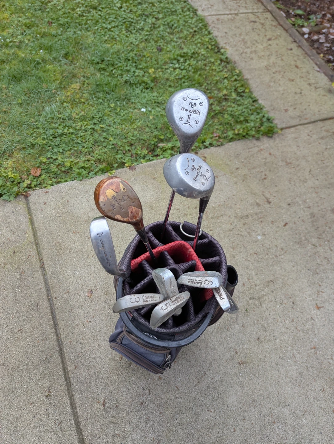 Selling a used golf club set, complete with a golf bag. The set includes a variety of clubs for different shots and distances. Perfect for someone looking to get into golf or upgrade their current set!