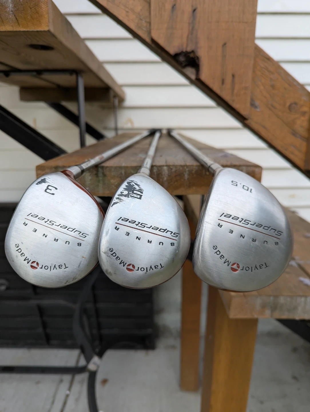Selling a set of TaylorMade Burner SuperSteel golf clubs. They show some signs of use, but are still in good condition for their age. Includes a 3 wood, 5 wood, and 10.5 degree driver.