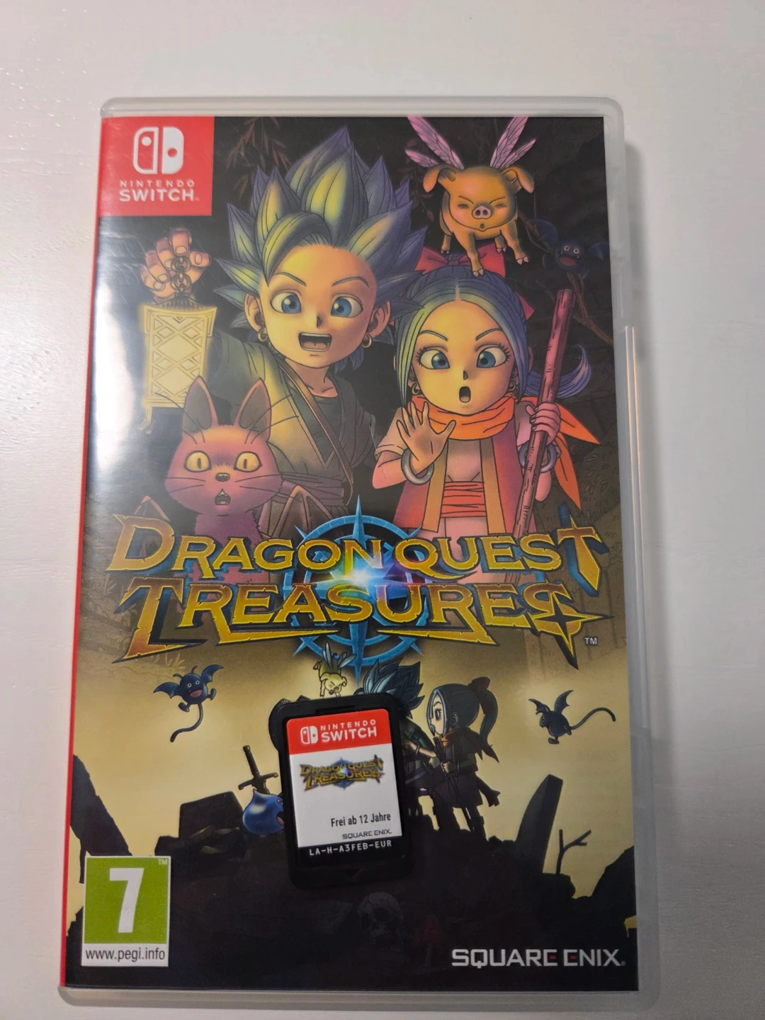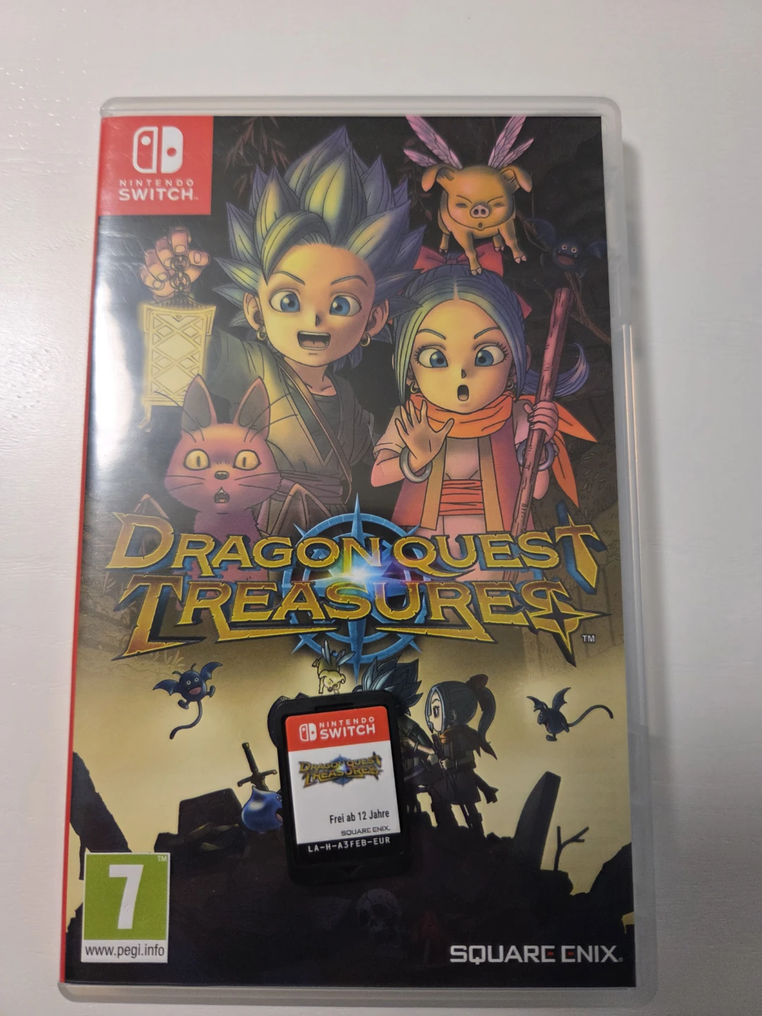 Selling Dragon Quest Treasures for the Nintendo Switch! It's rated for ages 7 and up, according to the PEGI rating on the cover. The game card is also included inside the case.