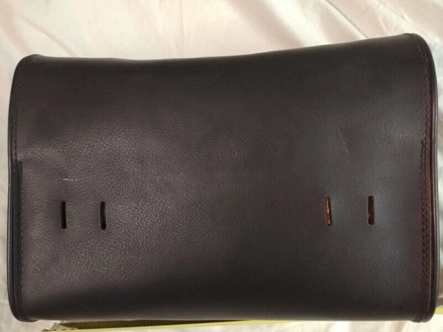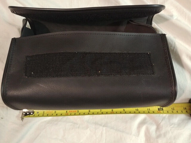 Up for sale we have this NEW Handle Bar LEATHER Velcro SADDLE BAG. It is 12 inches long by 4 inches wide by 7 inches high. It could be use as a Sassy Bar Bag or a Tool Pouch. No back belt with it but in new mint condition.