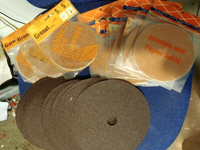 Up for sale we have this lot of round drill or other electric tool sand paper we have 3 package of 5 sheet of coarse , 10 package of 5 sheet of medium and 19 heavy gauge sheet of 7 “ coarse 60 grit sand paper 84 round sheet coarse 60 grit & medium Drill sand paper 5, 51/4, 7 inches