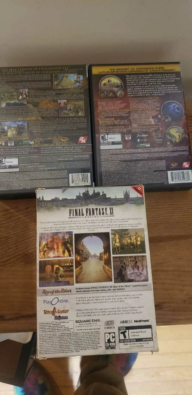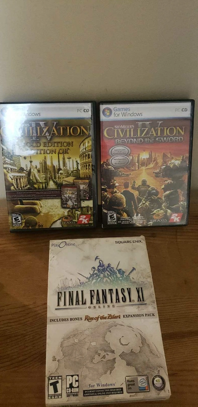 CIVILIZATION FINAL FANTASY WINDOWS 3 GAME UP FOR SELL WE HAVE THESE 3 GAMES FOR WINDOWS WE HAVE CIVILIZATION GOLD EDITION, CIVILIZATION BEYOND THE SWORD AND FINAL FANTASY XI.. ALL IN LIKE NEW CONDITION . ASKING $30 FOR THE LOT PICK UP ON BEAVERBROOK LANE IN KANATA THANK YOU