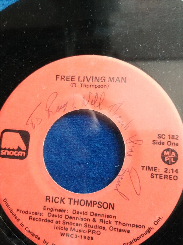 Up for sale we have A 1982 Sign Autograph Framed with Brass Plaque Rick Thomson 45 rp Record in New condition Rick Thomson American drummer, songwriter and producer born in Cincinnati, Ohio. Rick Michael Thomson shelter sound studios.com, repertoire.bmi.com The Sweet Comfort Band Asking $ 50 pick up on old Richmond road in Nepean Thank you