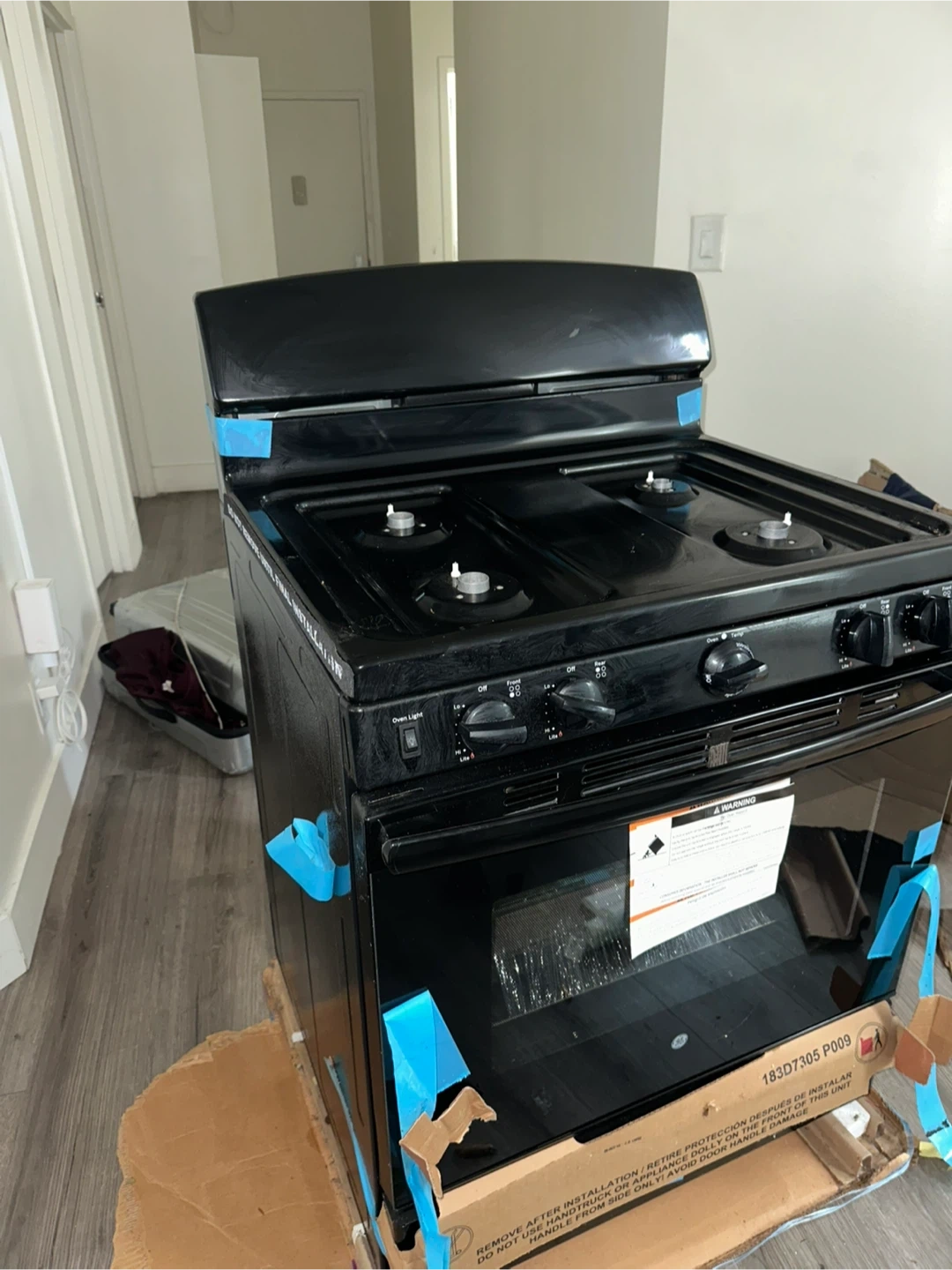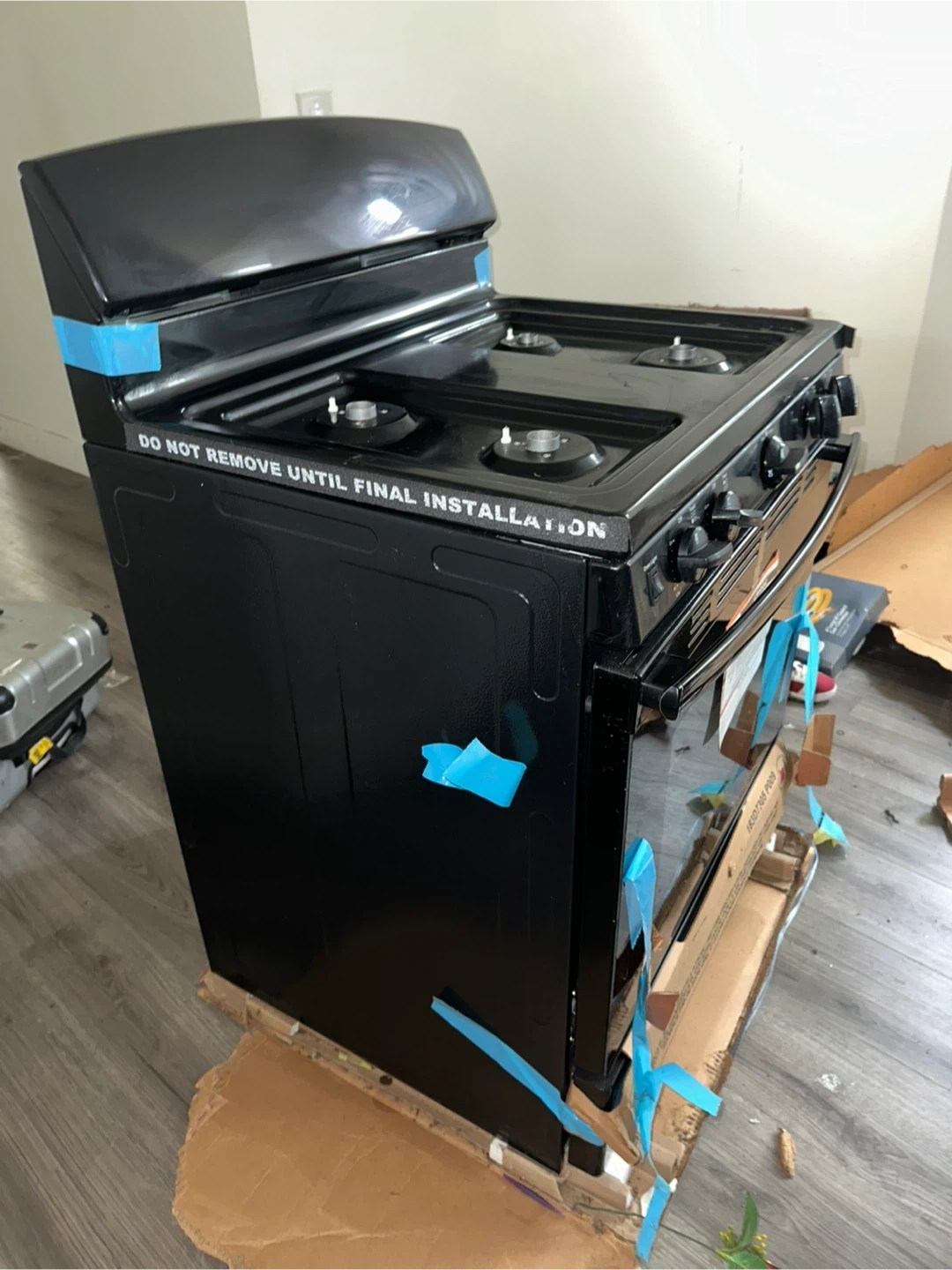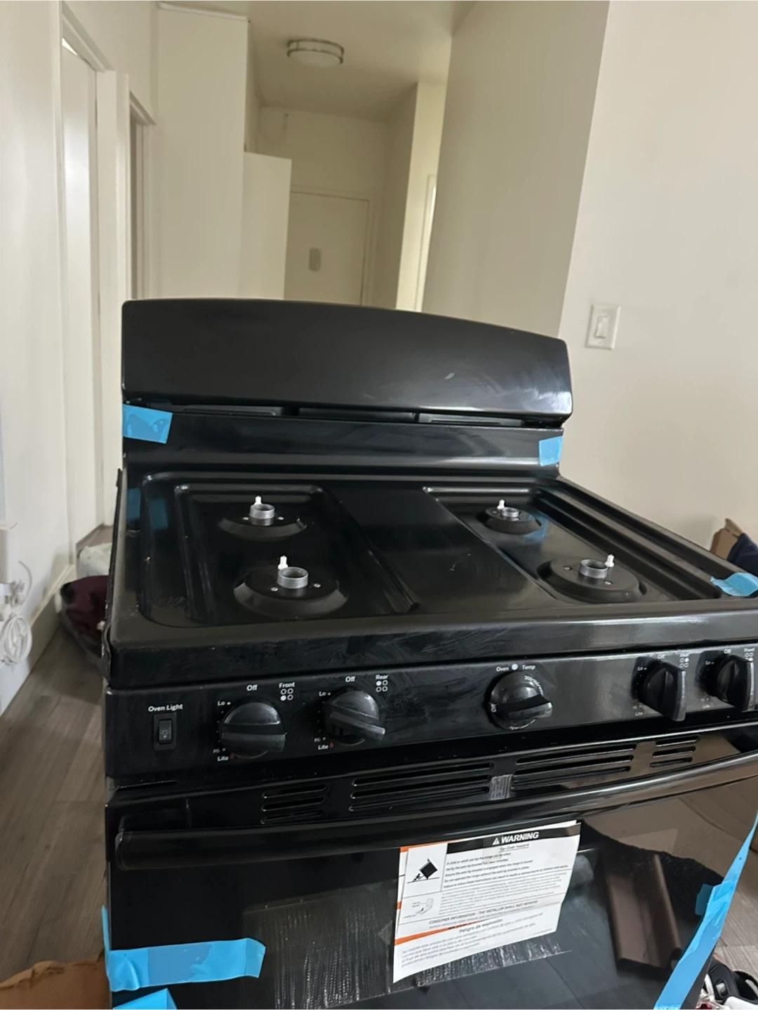 Selling a black gas range stove! It's still wrapped in its protective blue film and is ready for a new kitchen. Great for cooking up your favorite meals!