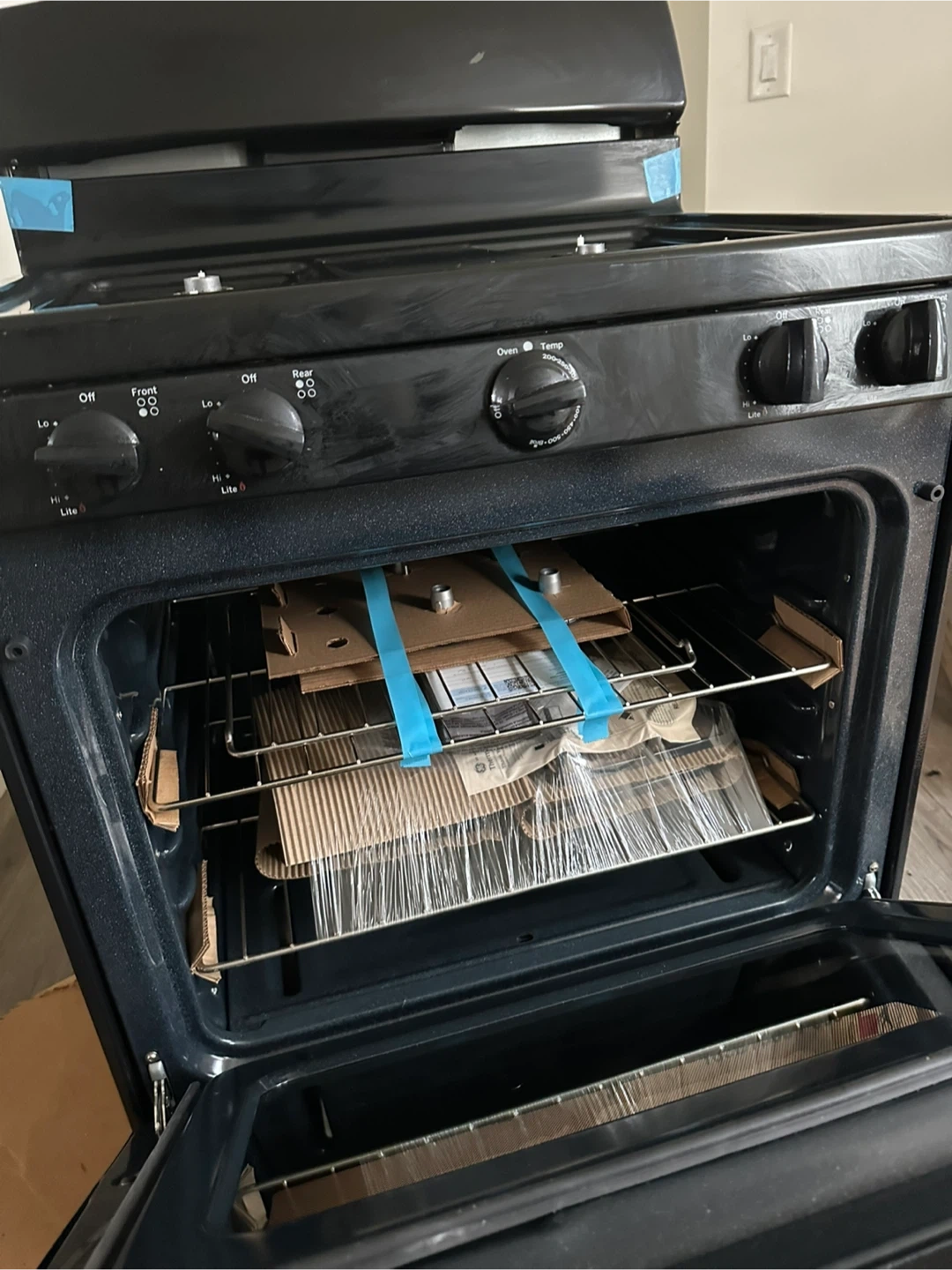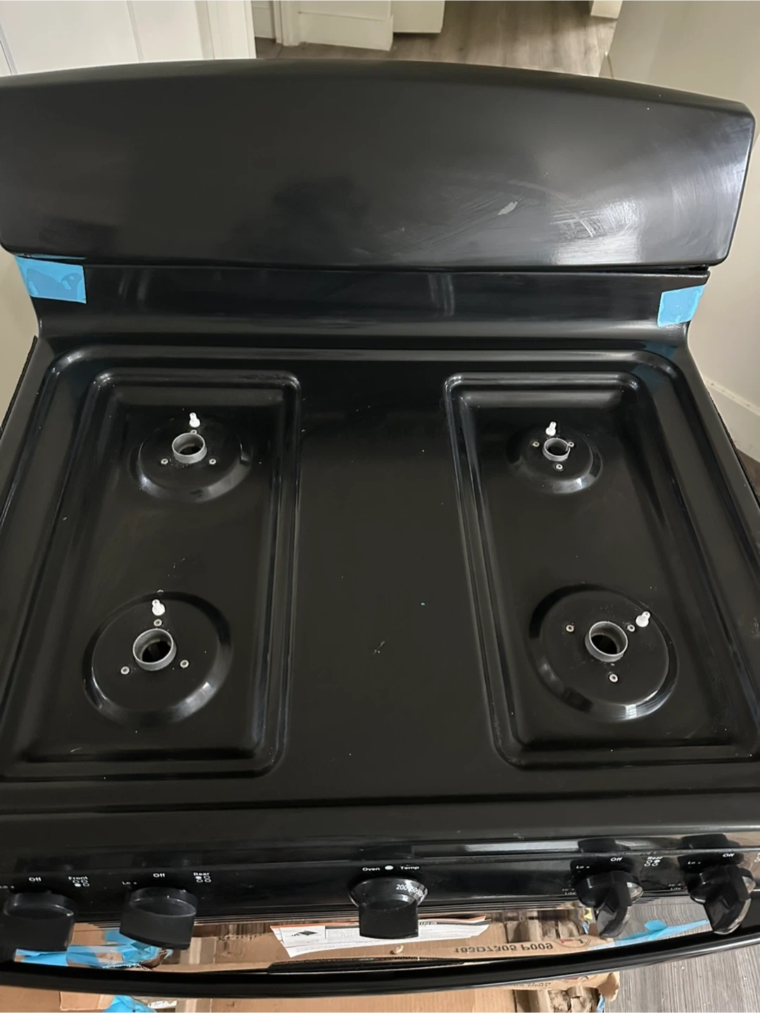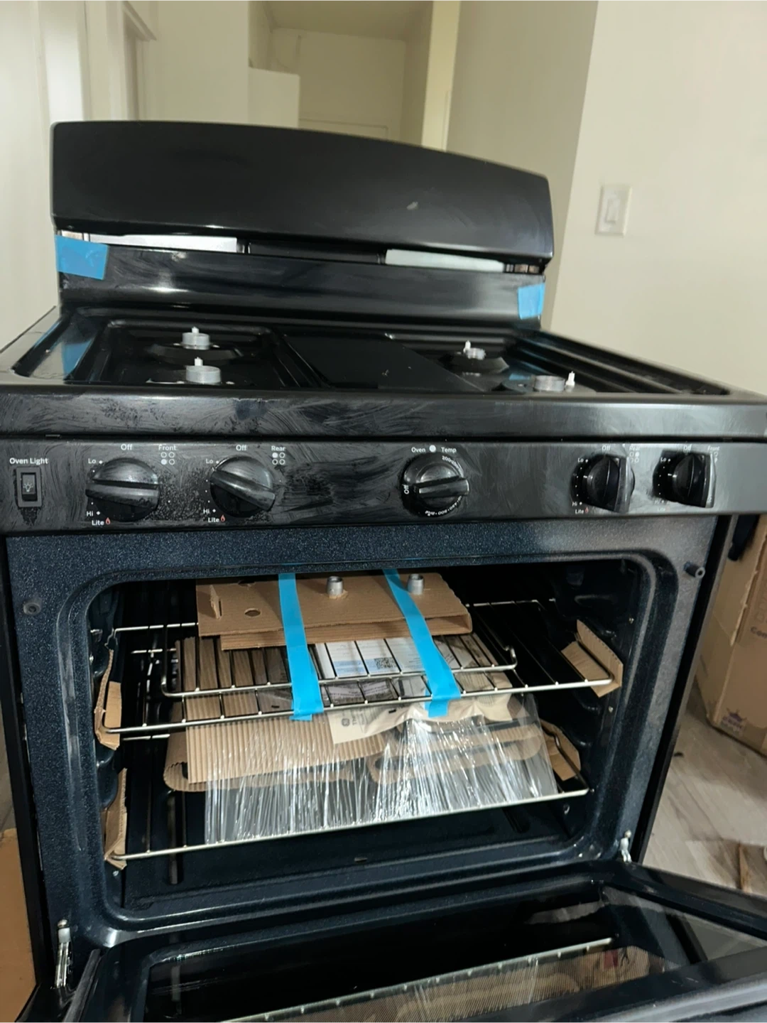 Selling a black gas range stove! It's still wrapped in its protective blue film and is ready for a new kitchen. Great for cooking up your favorite meals!