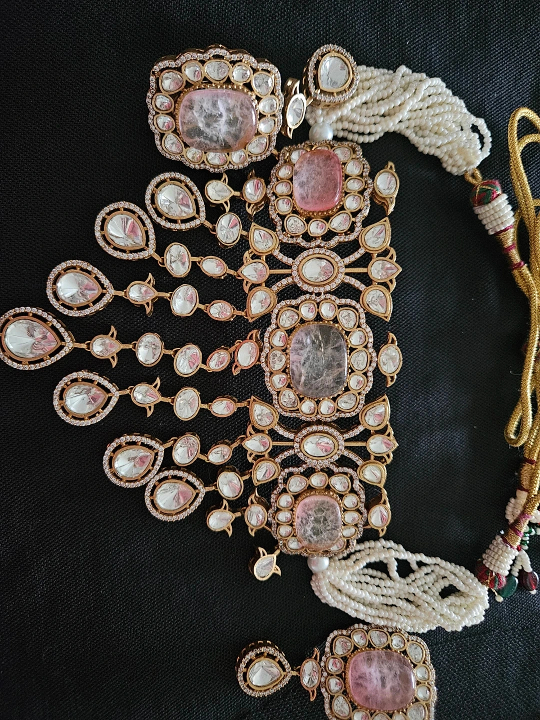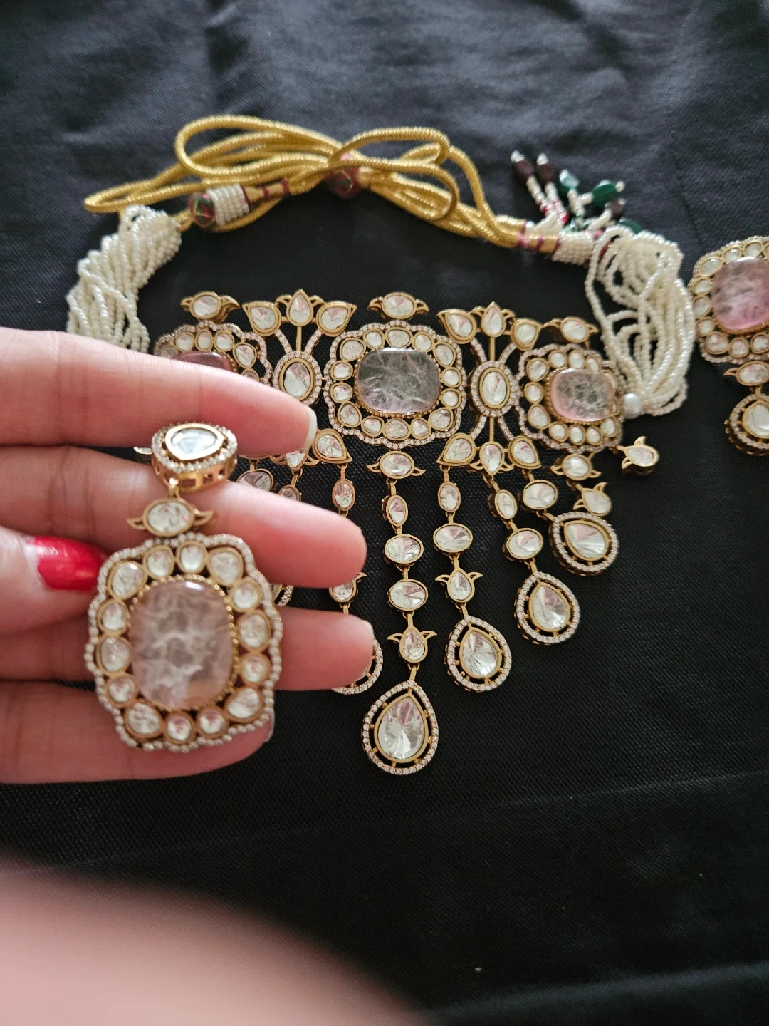 Beautiful necklace and earring set with intricate detailing. The set features stones in various shapes and sizes, with a mix of white and pinkish precious stones. The necklace has a pearl-like strand detail. Perfect for special occasions!