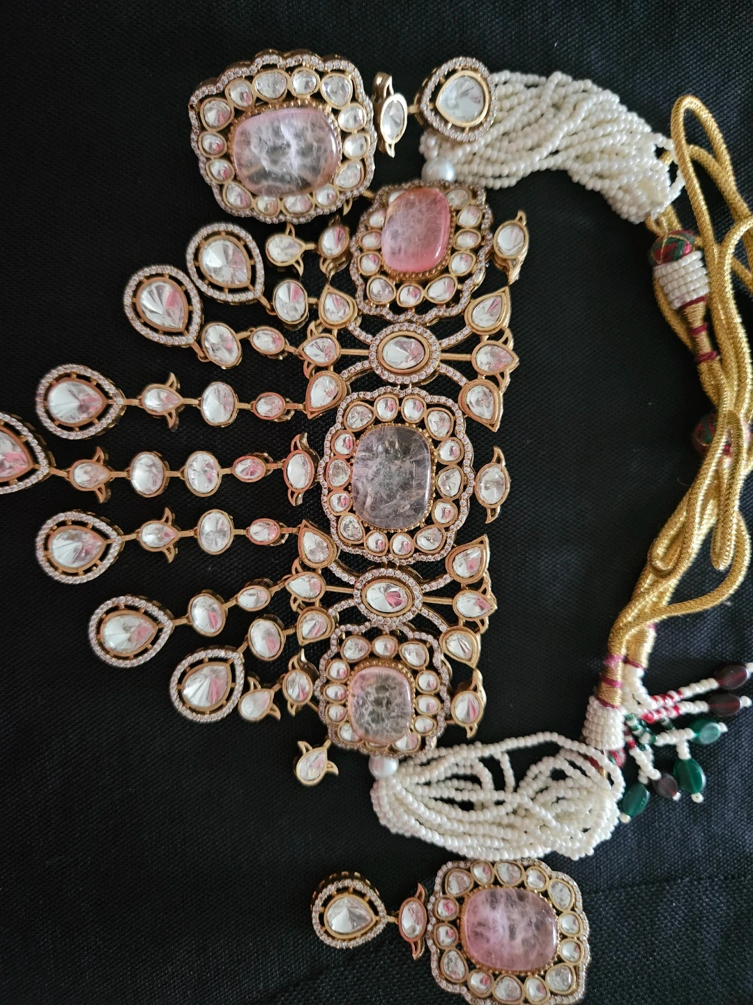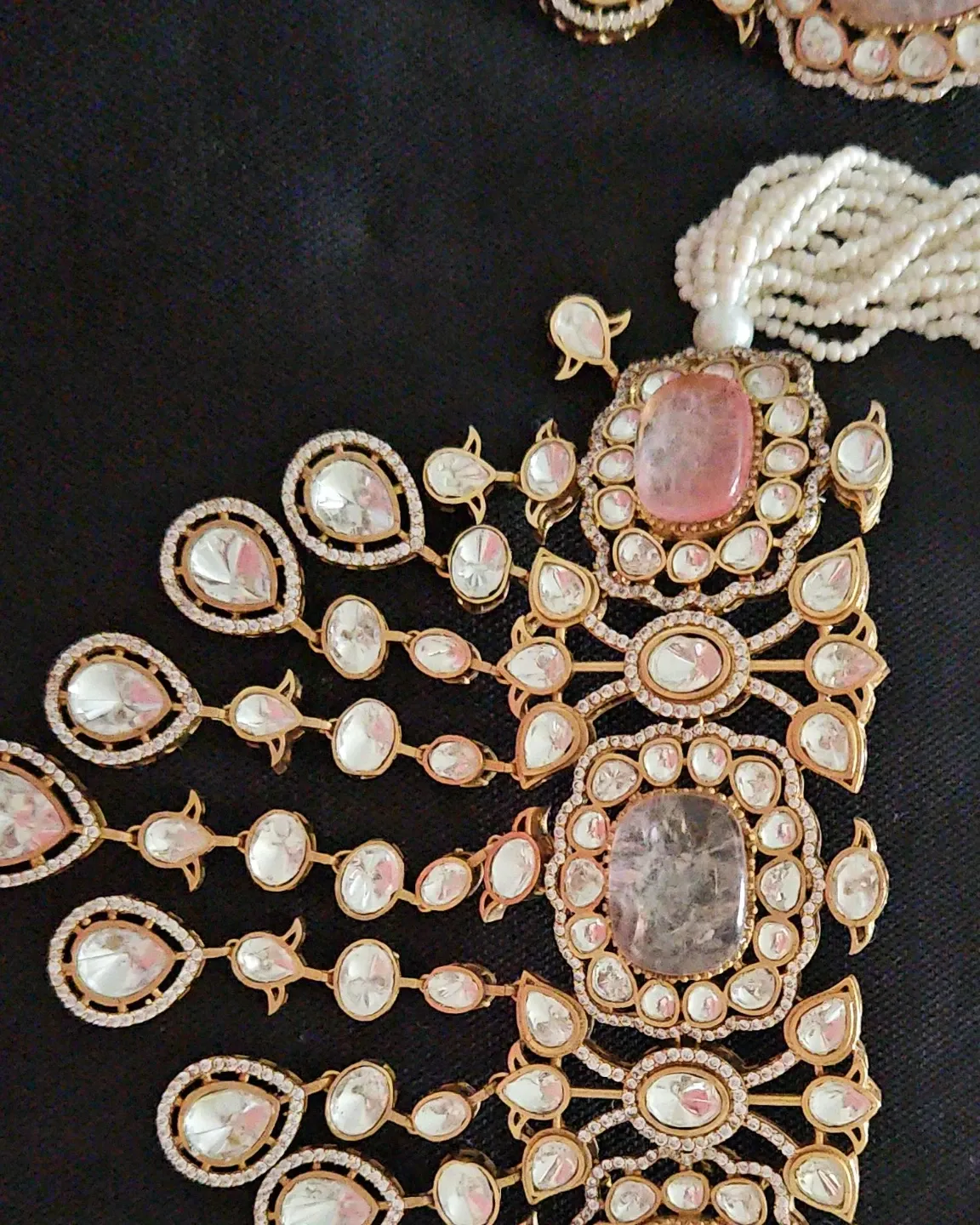 Beautiful necklace and earring set with intricate detailing. The set features stones in various shapes and sizes, with a mix of white and pinkish precious stones. The necklace has a pearl-like strand detail. Perfect for special occasions!