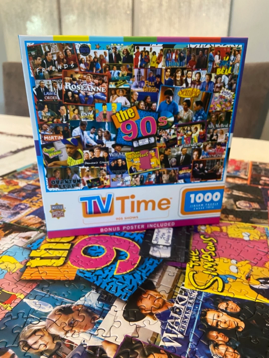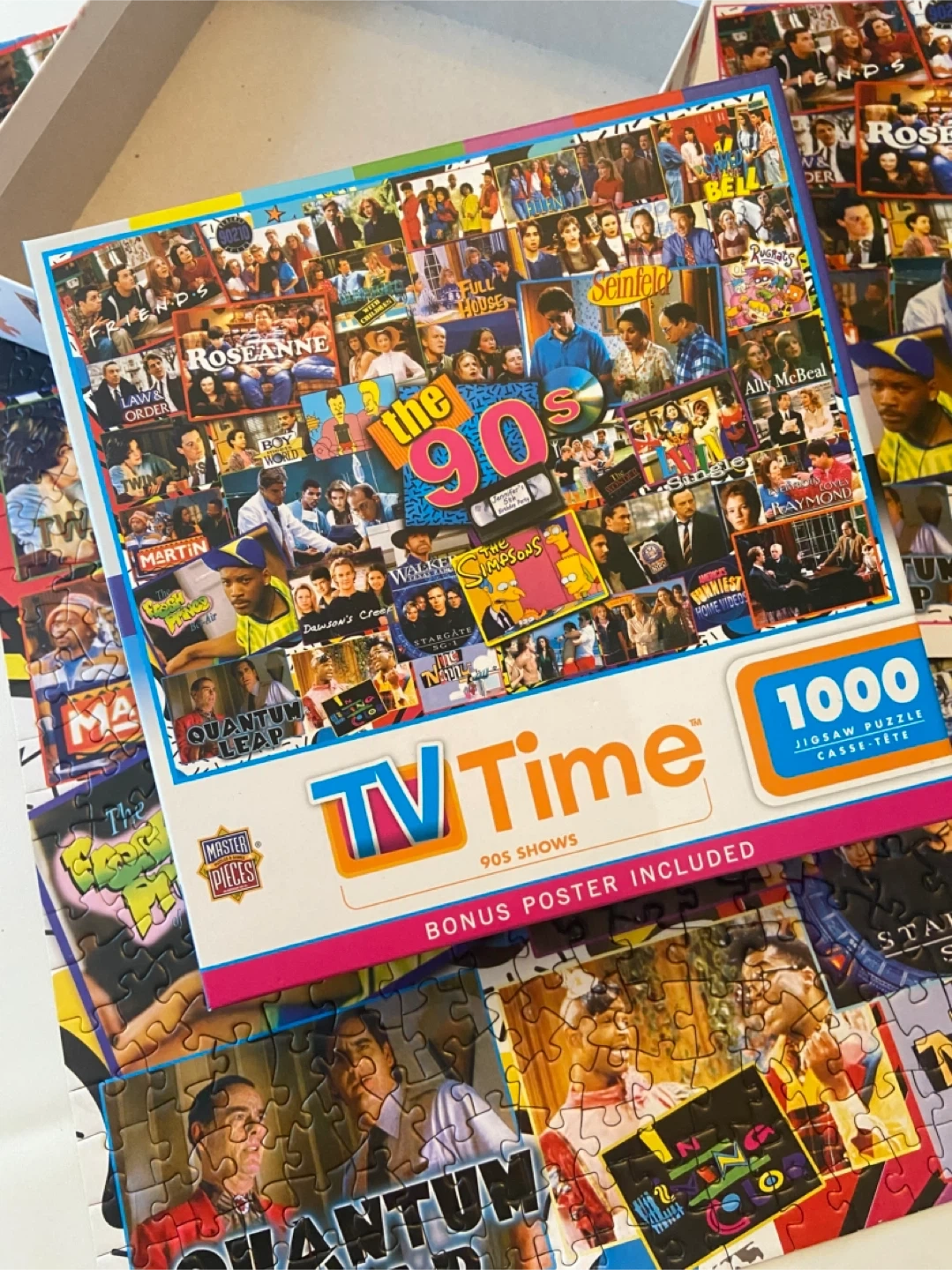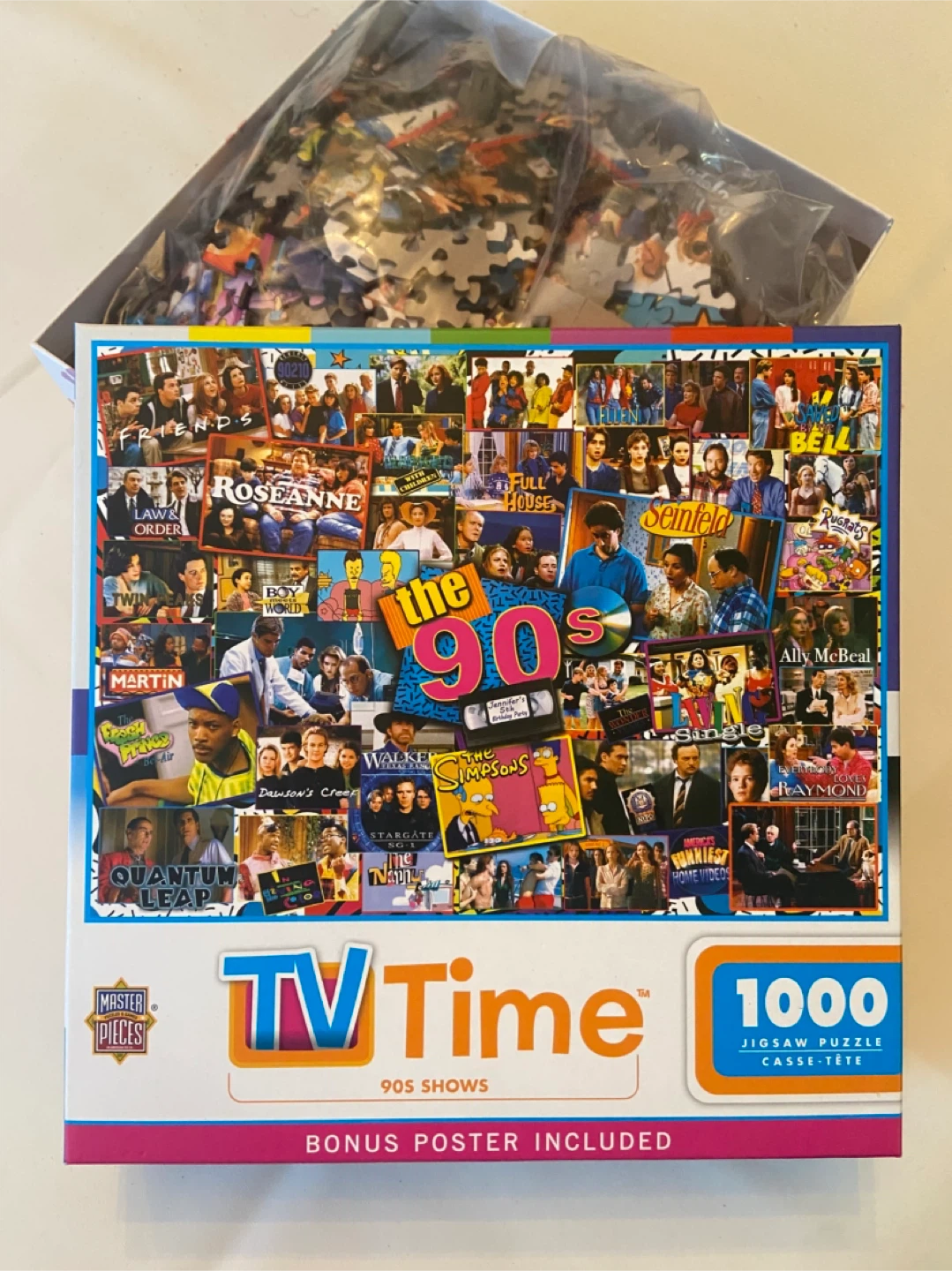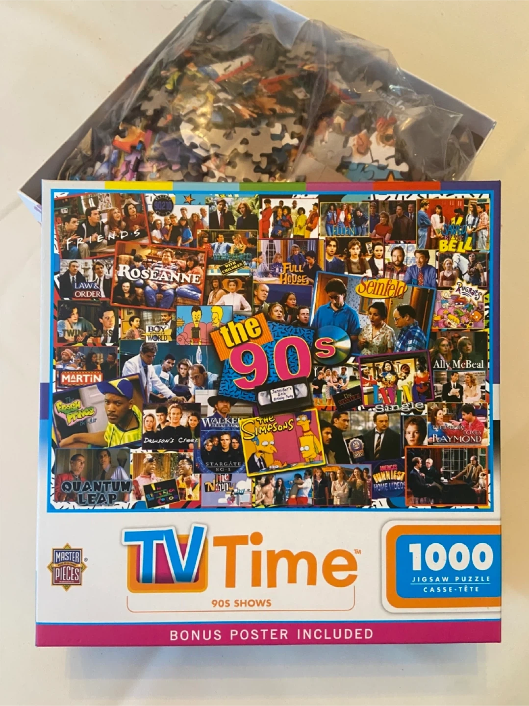 This is a Master Pieces TV Time 1000-piece jigsaw puzzle featuring 90s shows! It includes a bonus poster and comes with the box in perfect condition. 1 single piece missing (see photo). Smk-free home. Pick up north end St Catharines