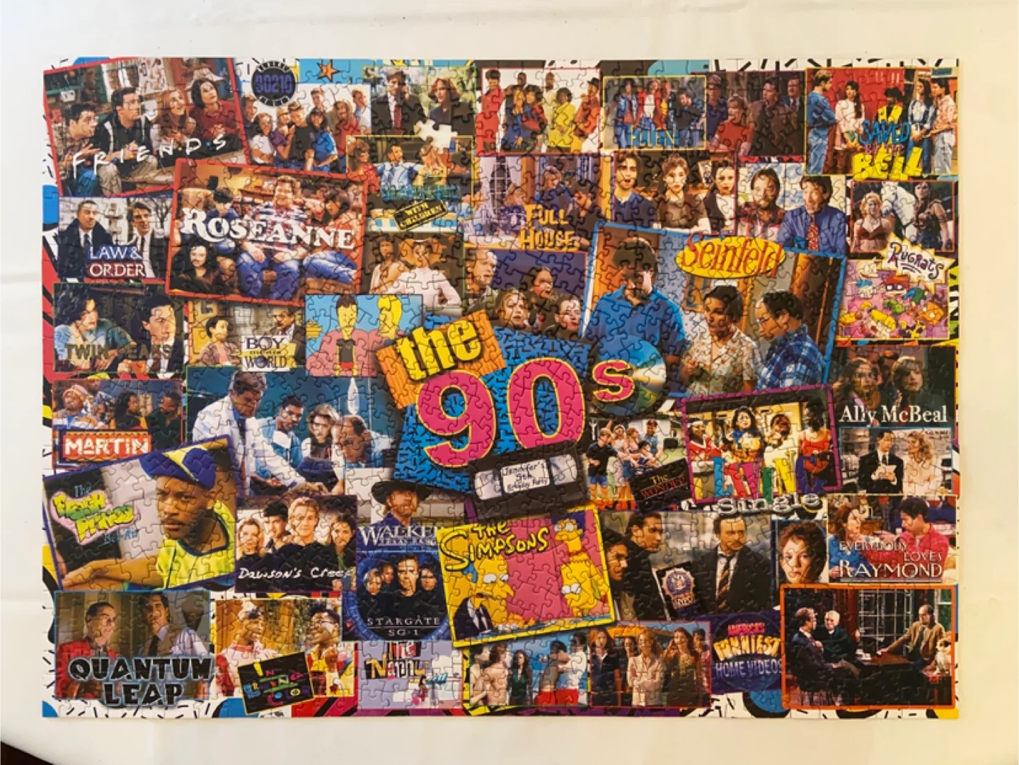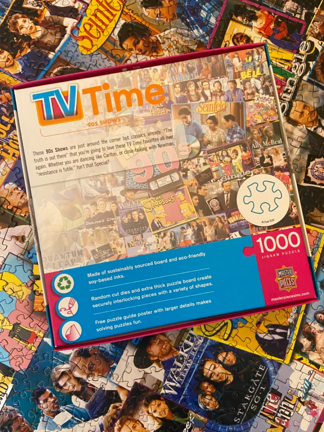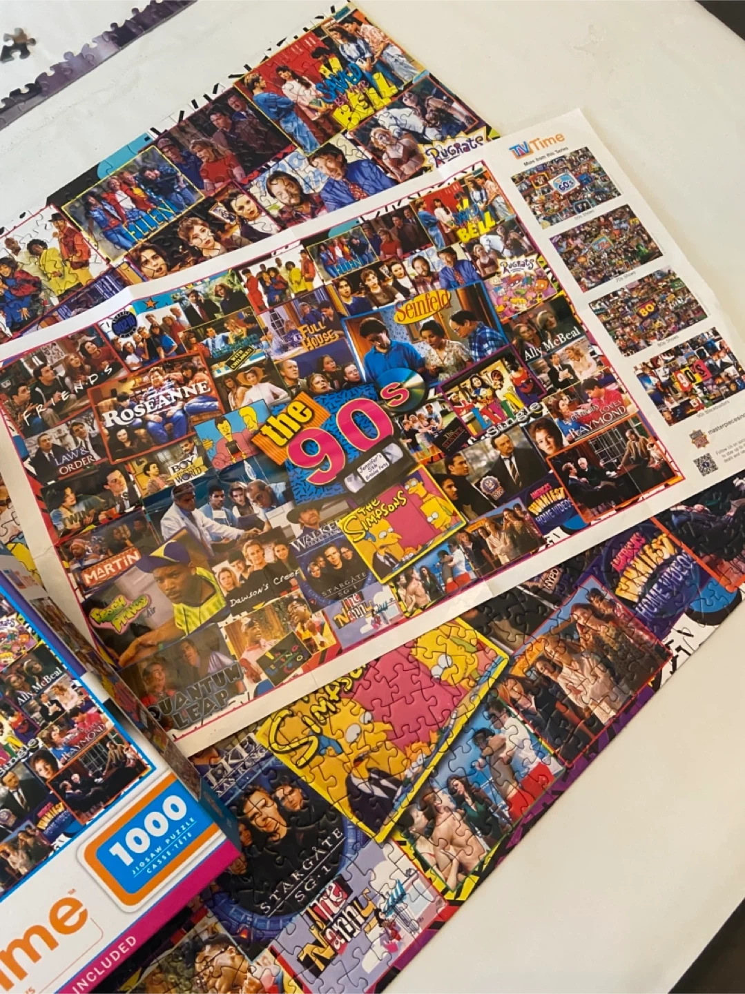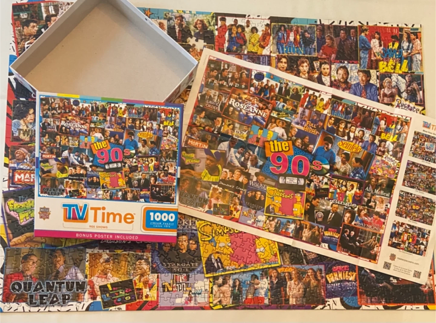 This is a Master Pieces TV Time 1000-piece jigsaw puzzle featuring 90s shows! It includes a bonus poster and comes with the box in perfect condition. 1 single piece missing (see photo). Smk-free home. Pick up north end St Catharines