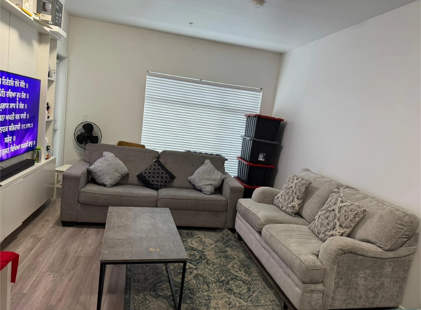 Selling a living room set that includes two sofas and a coffee table. The sofas are in a neutral grey colour and come with decorative pillows. The coffee table has a concrete-like top and a black metal frame. A great way to furnish your living space!