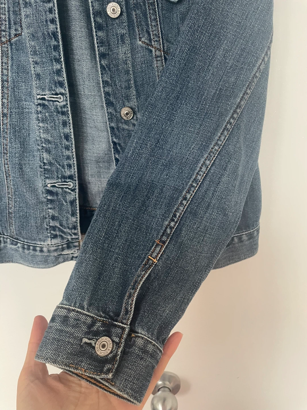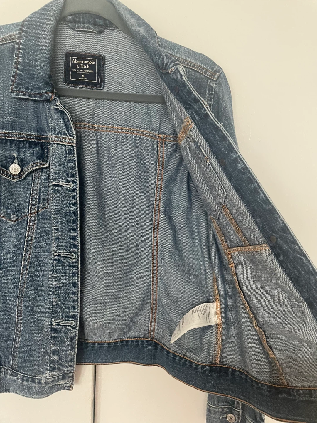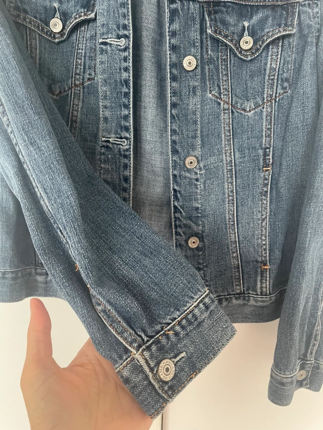 Here's a classic denim jacket from Abercrombie & Fitch! It's in great condition and ready for a new wardrobe. The size is M.