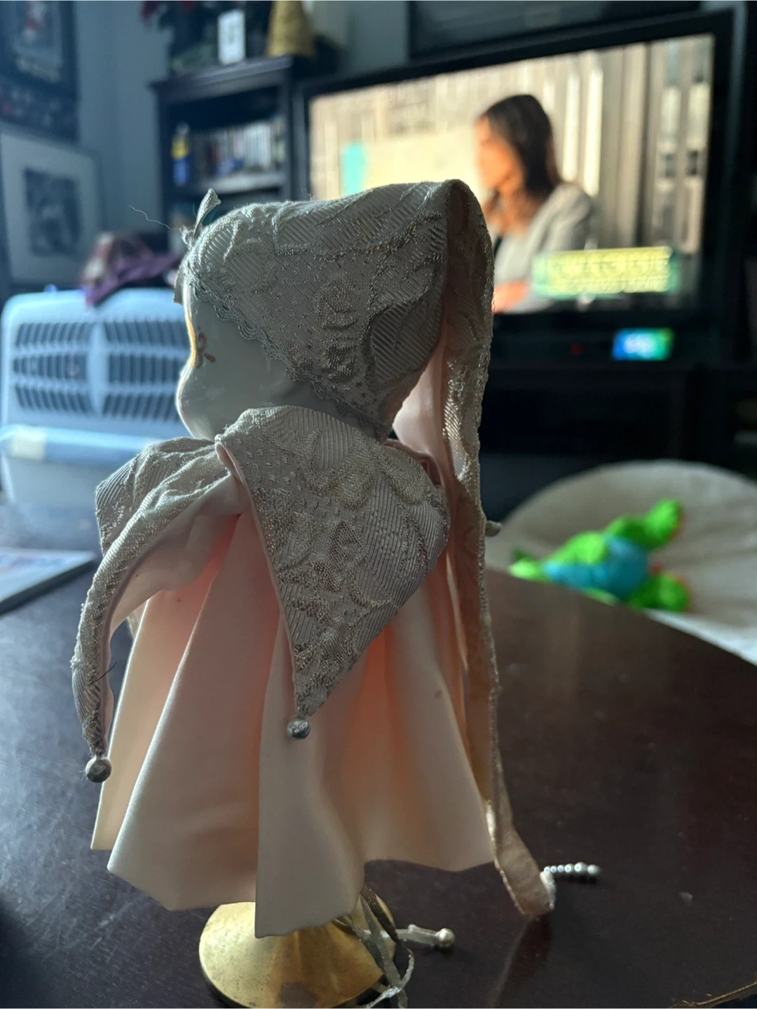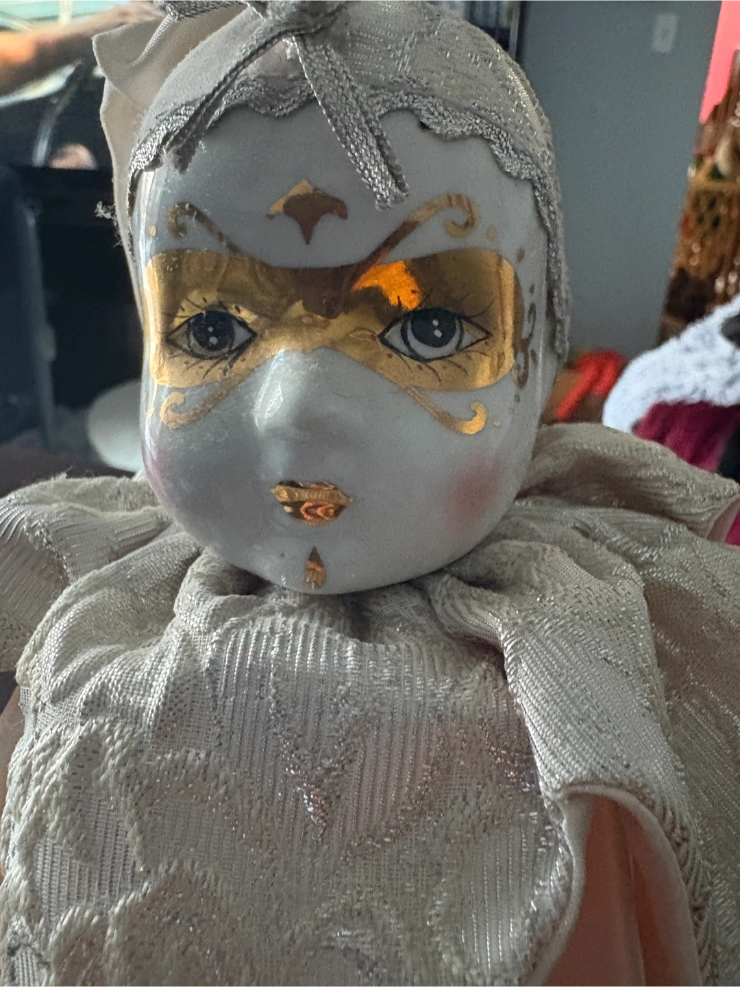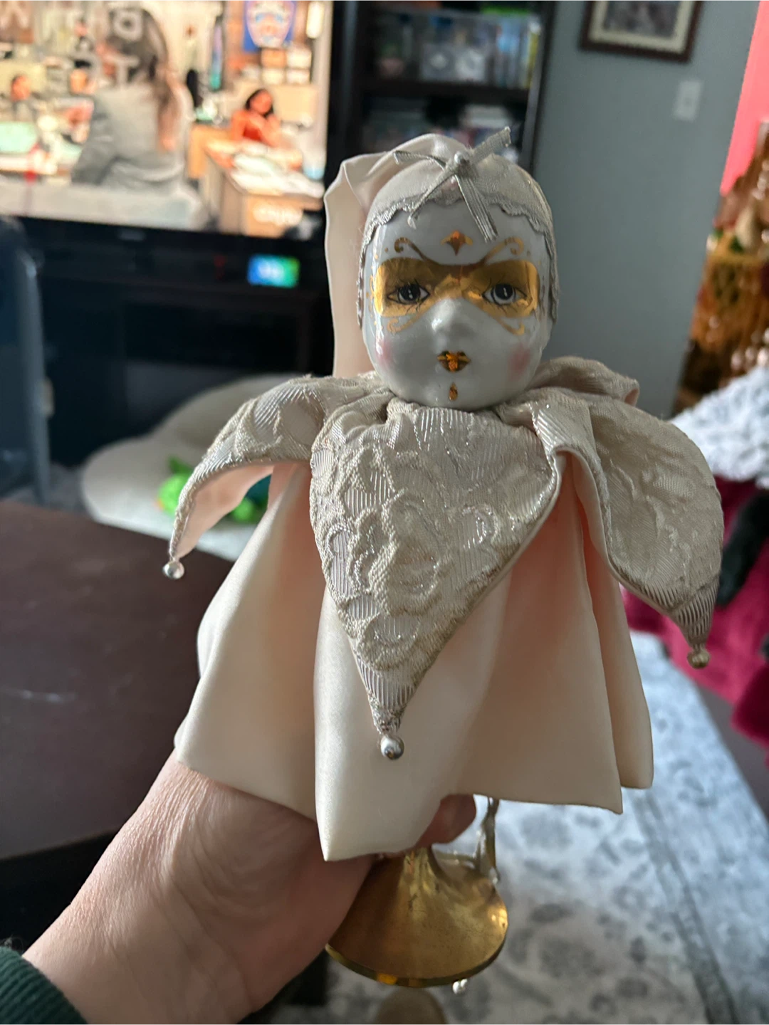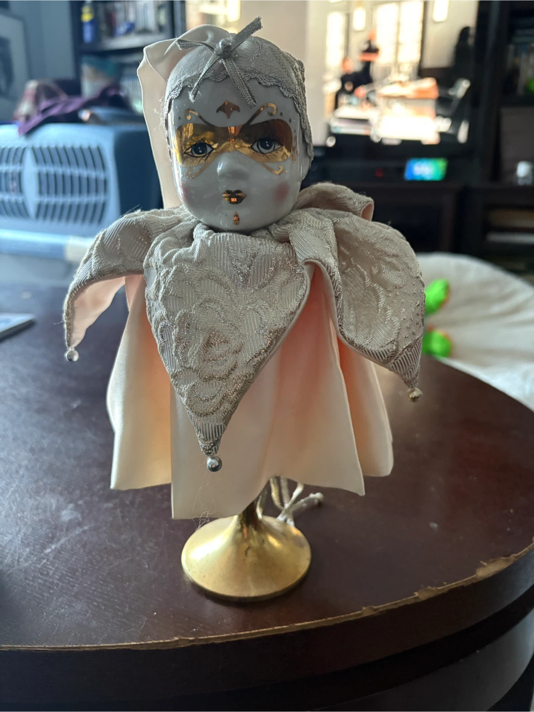 Selling a Harlequin porcelain doll. It has a gold mask and a white and gold outfit. It stands on a gold stand. It is in great condition!