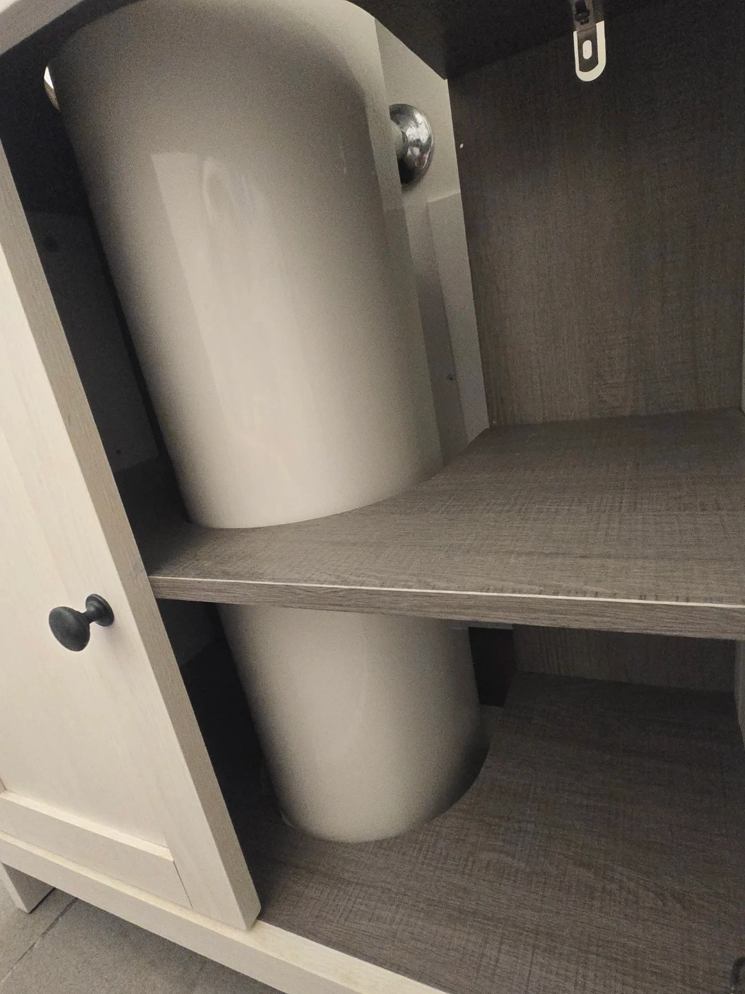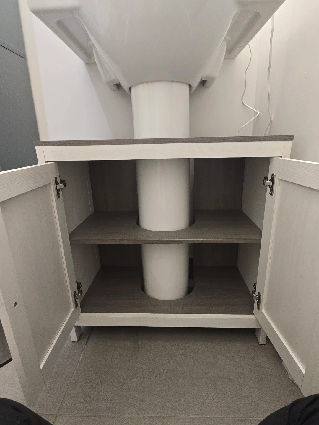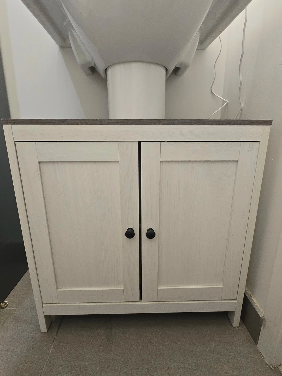 Selling a bathroom vanity. It features a white cabinet with a grey countertop and two shelves inside. The cabinet doors have black knobs. It's in good condition and ready to be installed in your bathroom!