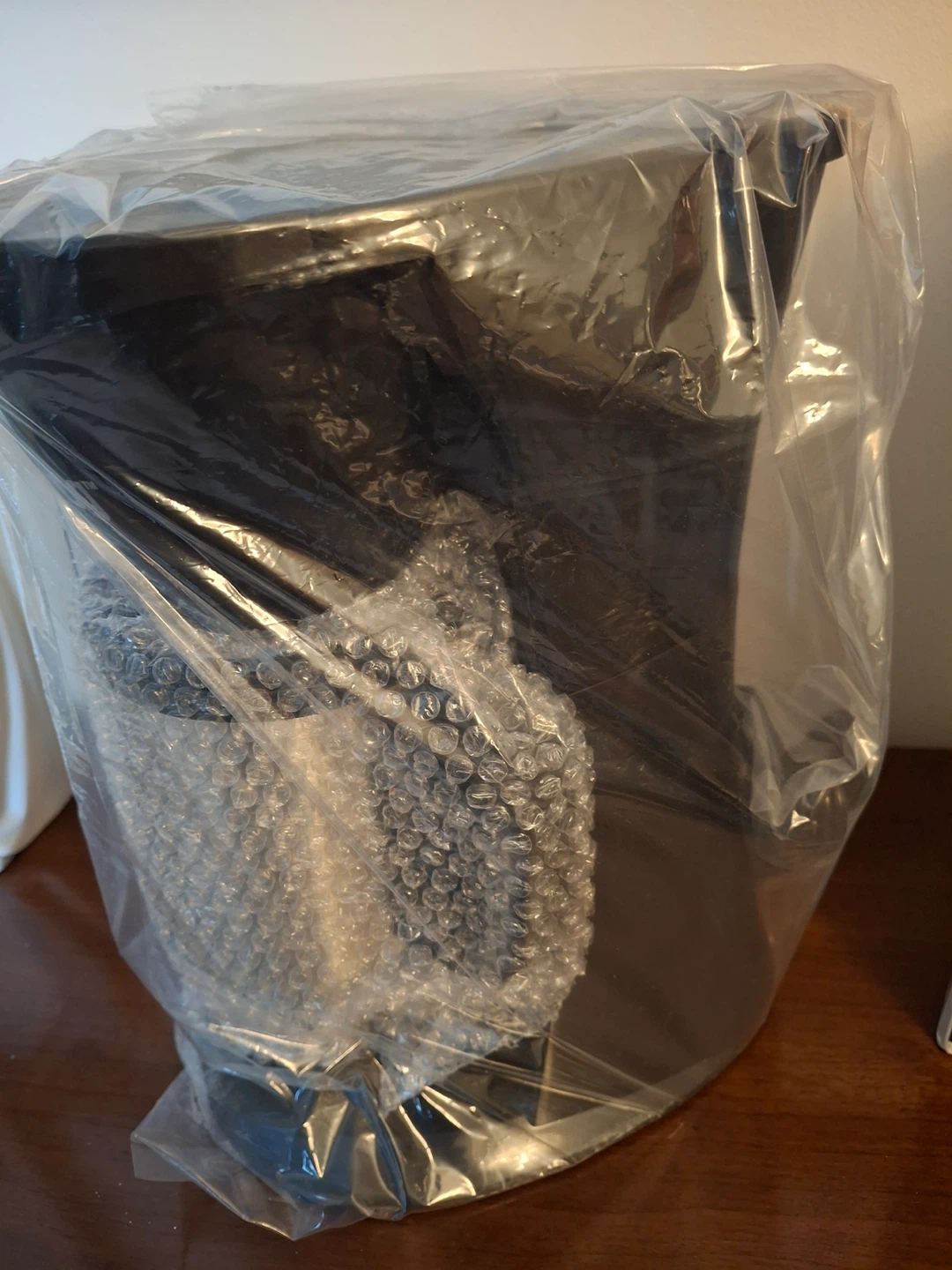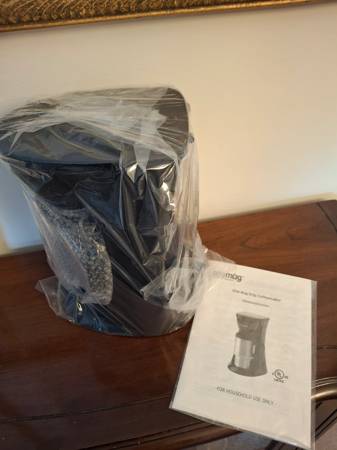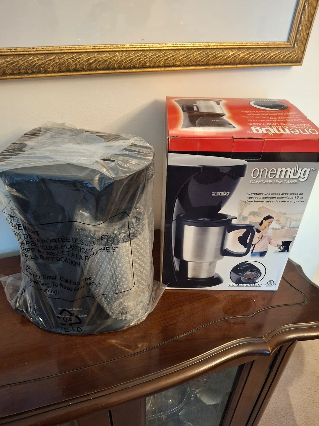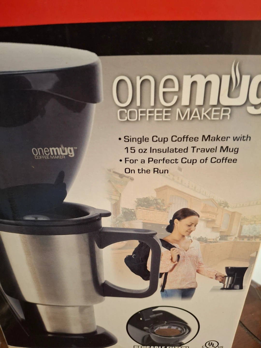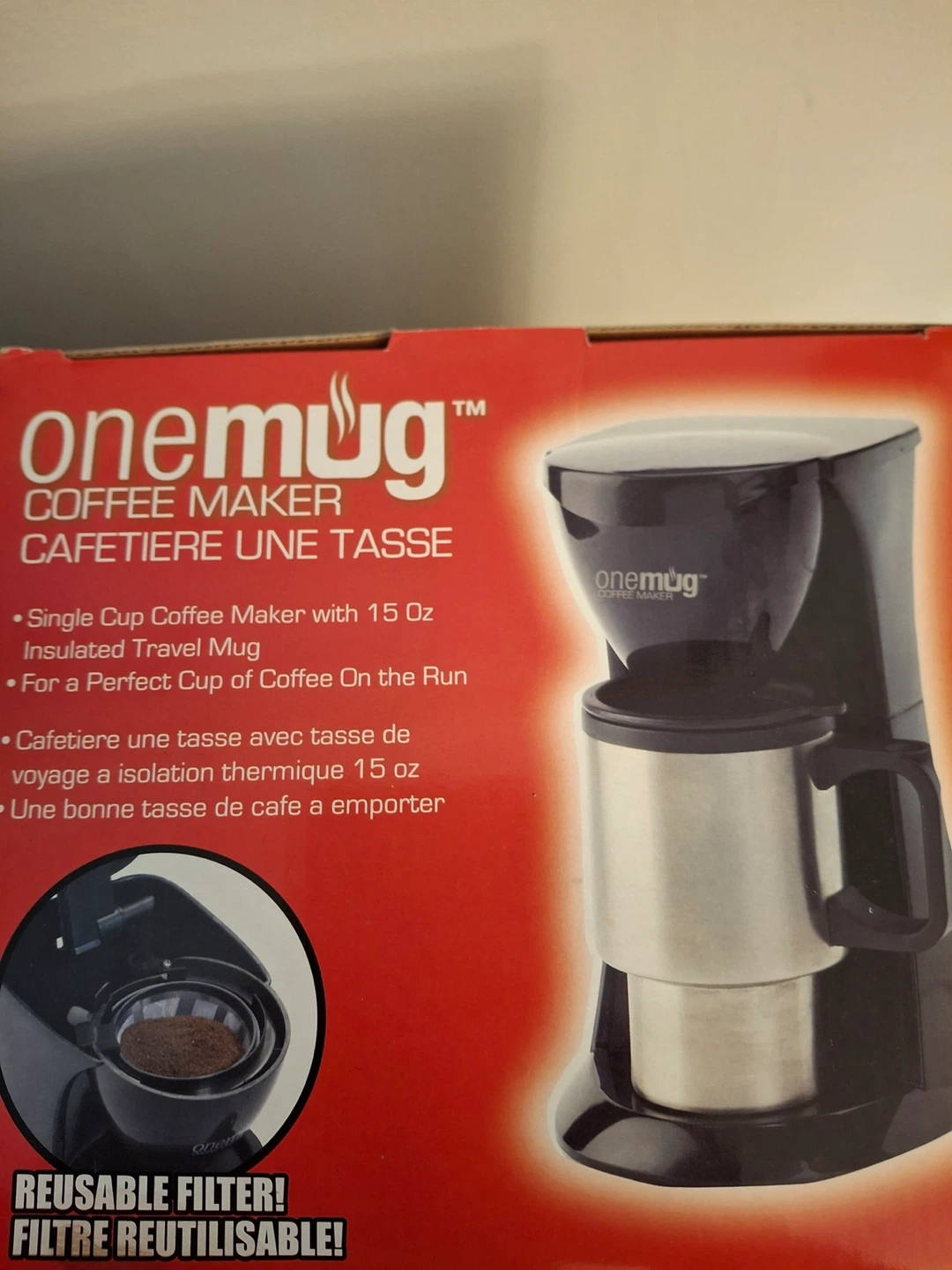 One Mug single cup coffee maker, still in original packaging with instructions. Has a reusable filter and comes with an insulated travel mug. Some stains/marks on the bottom of the box but machine has never been used.