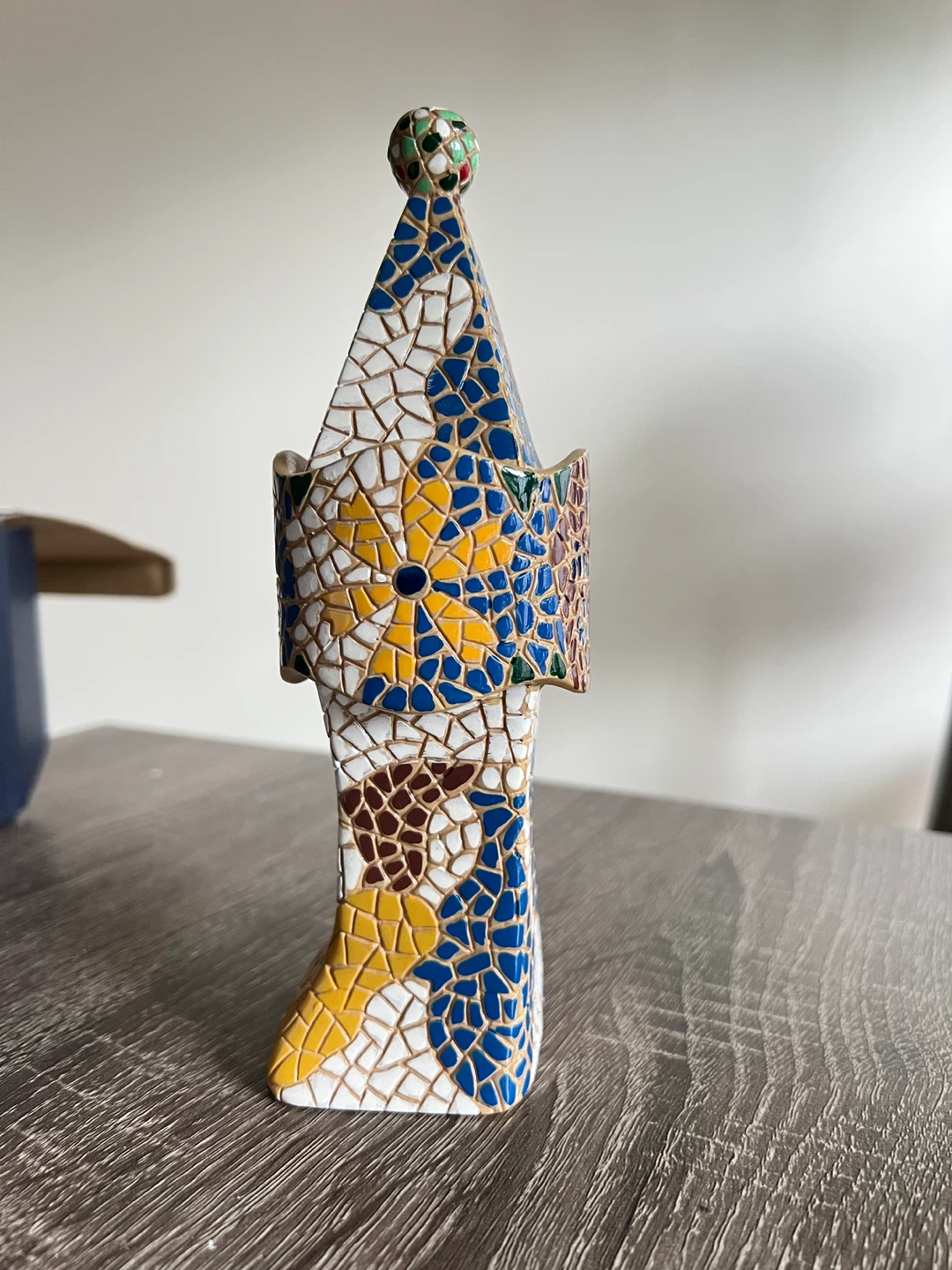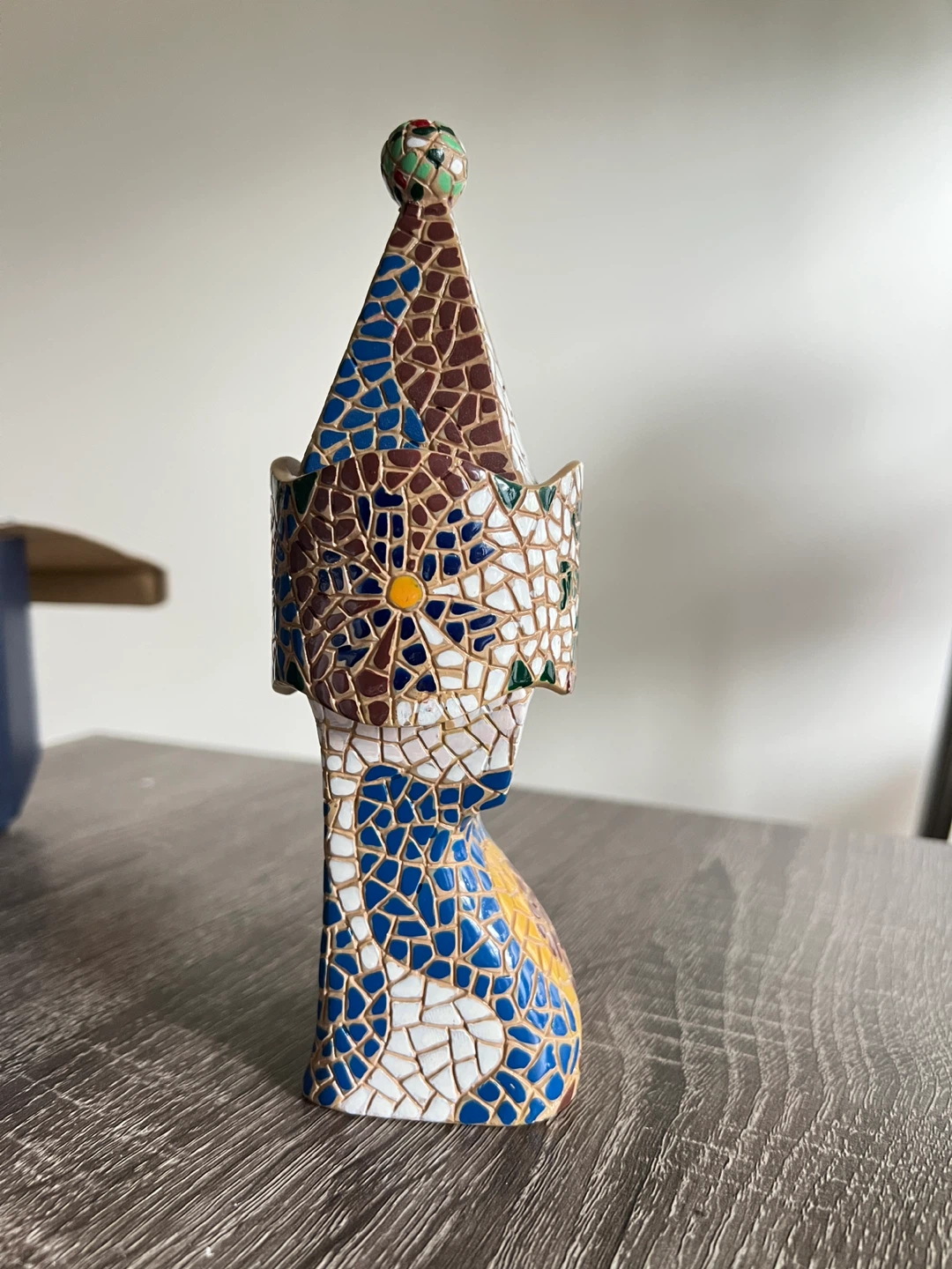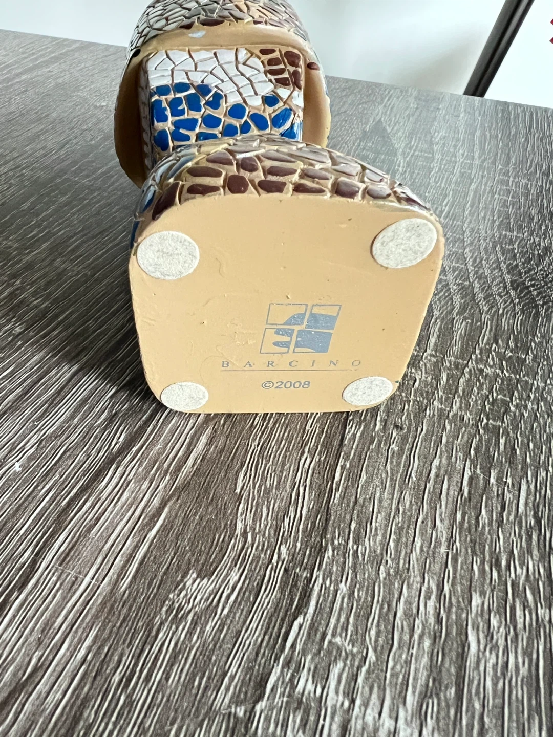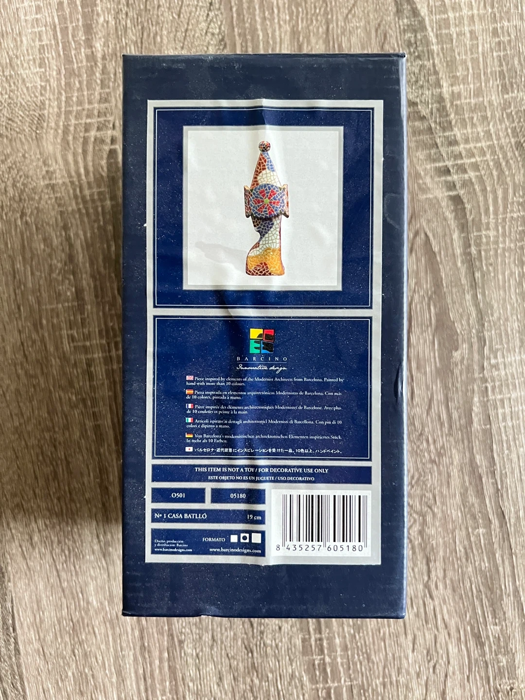 Barcino Casa Batllo piece. It's approximately 19cm in height and comes in its original box with styrofoam packaging. Features a unique mosaic design inspired by the architectural masterpieces of Gaudi. This was purchased in Barcelona many years ago, around 2013. The bottom shows it was made in 2008. It was around $70 CAD. It is in great condition. No damage.