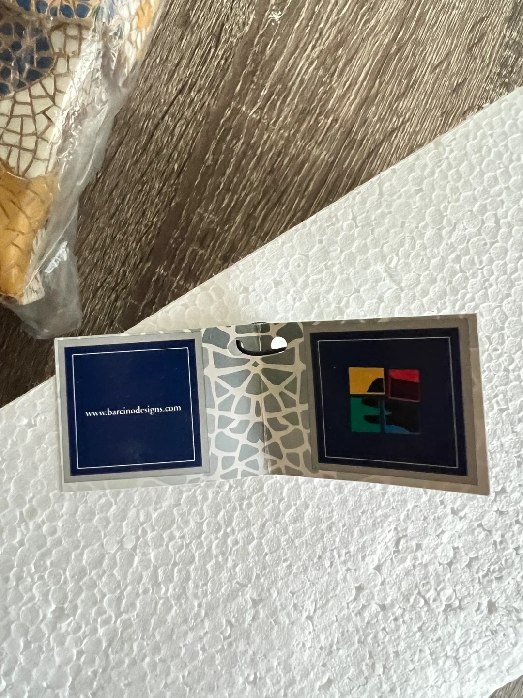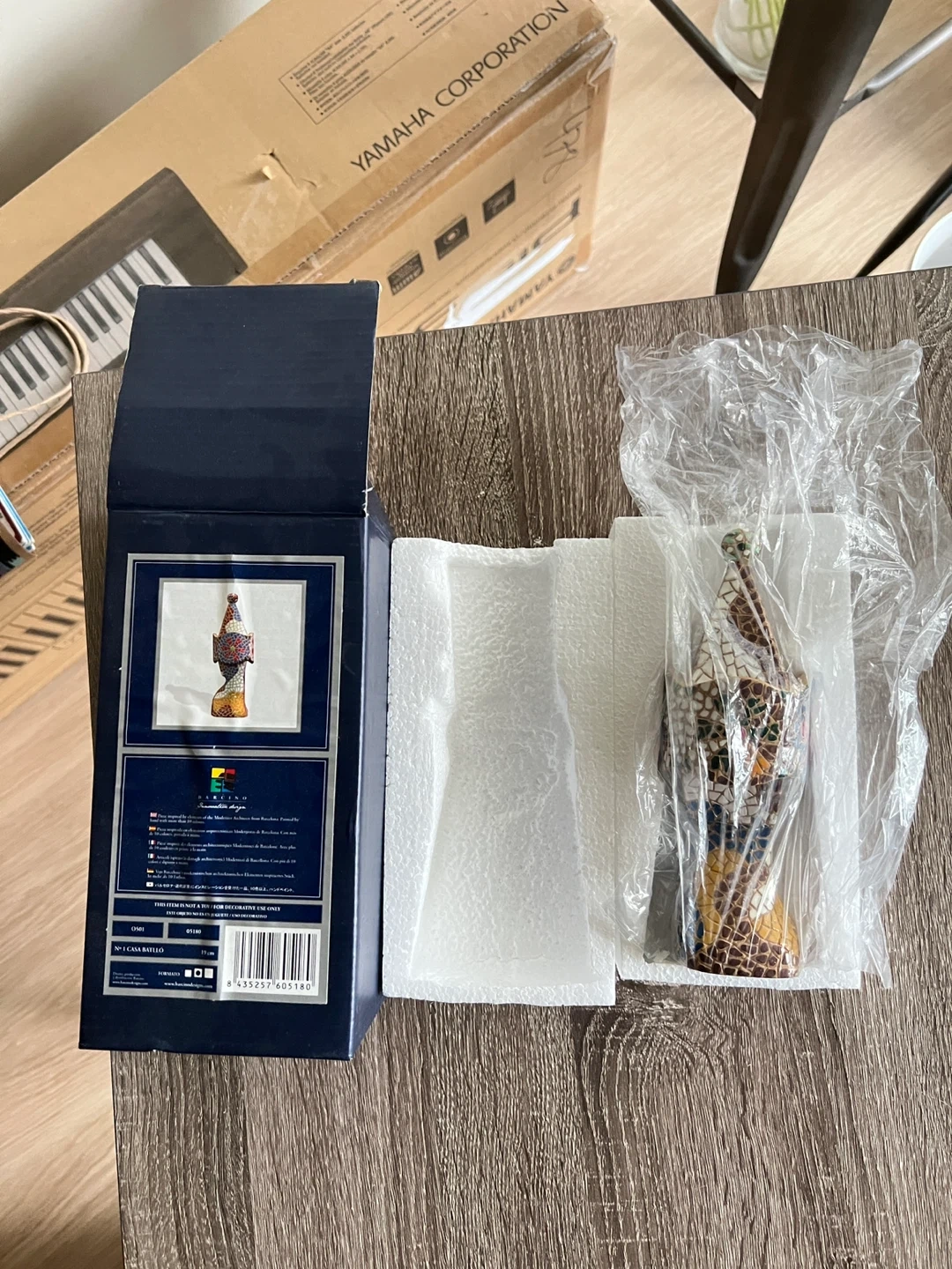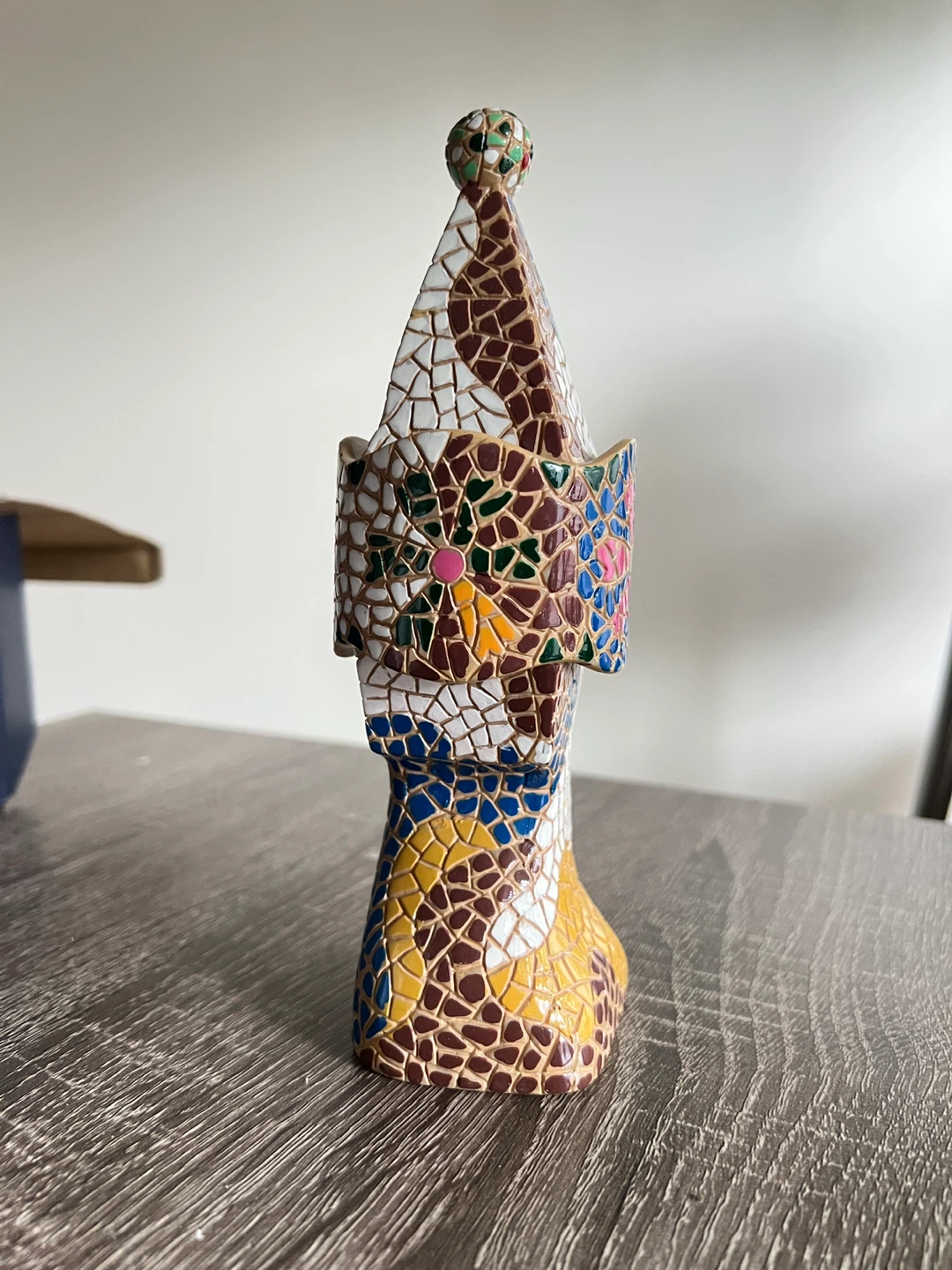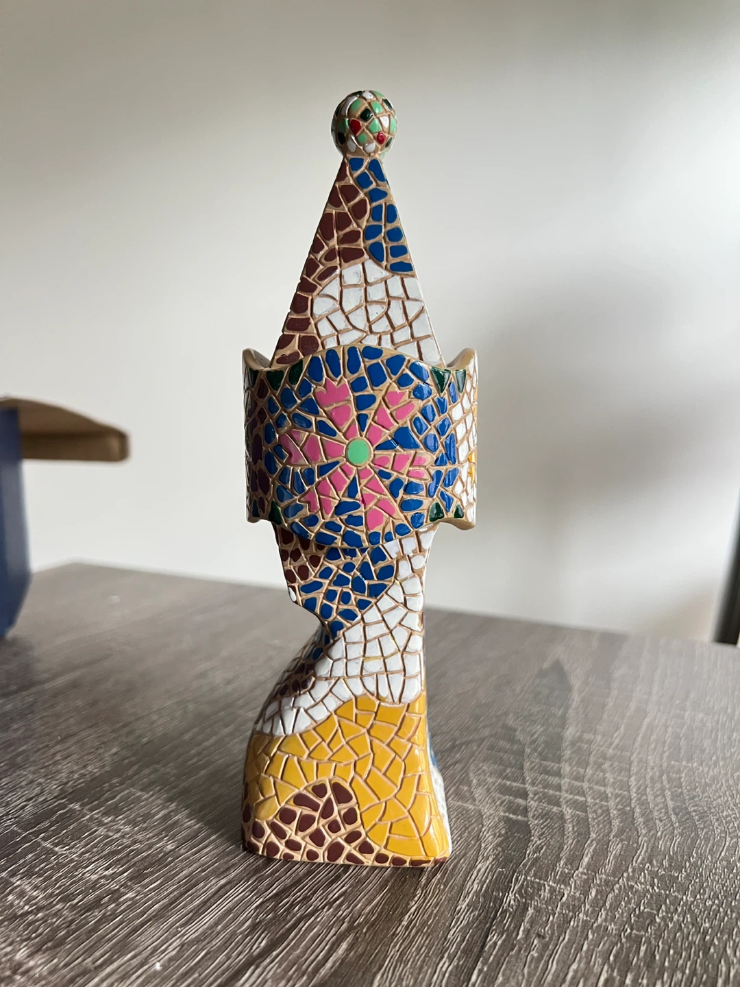 Barcino Casa Batllo piece. It's approximately 19cm in height and comes in its original box with styrofoam packaging. Features a unique mosaic design inspired by the architectural masterpieces of Gaudi. This was purchased in Barcelona many years ago, around 2013. The bottom shows it was made in 2008. It was around $70 CAD. It is in great condition. No damage.