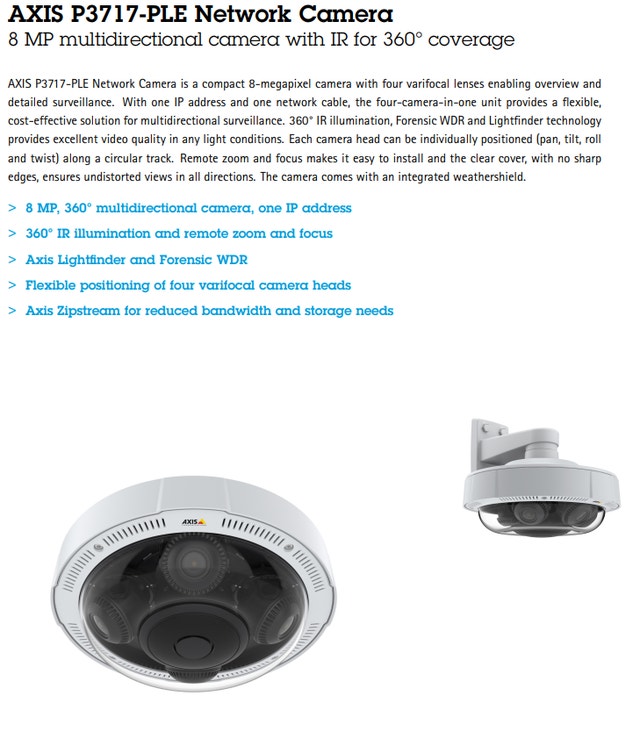 Key features Model: AXIS P3717‑PLE (01504‑001) with four individually adjustable 2 MP camera heads (8 MP total).