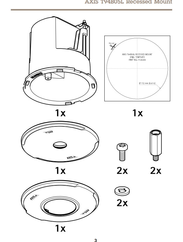 Recessed ceiling mount for Axis dome cameras, designed to provide a discreet, low-profile installation where only the camera dome is visible below the ceiling line. This mounting accessory is ideal for clean, professional surveillance setups in offices, retail, and other indoor environments where aesthetics and secure mounting both matter.