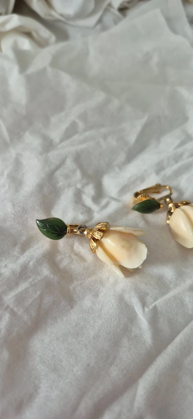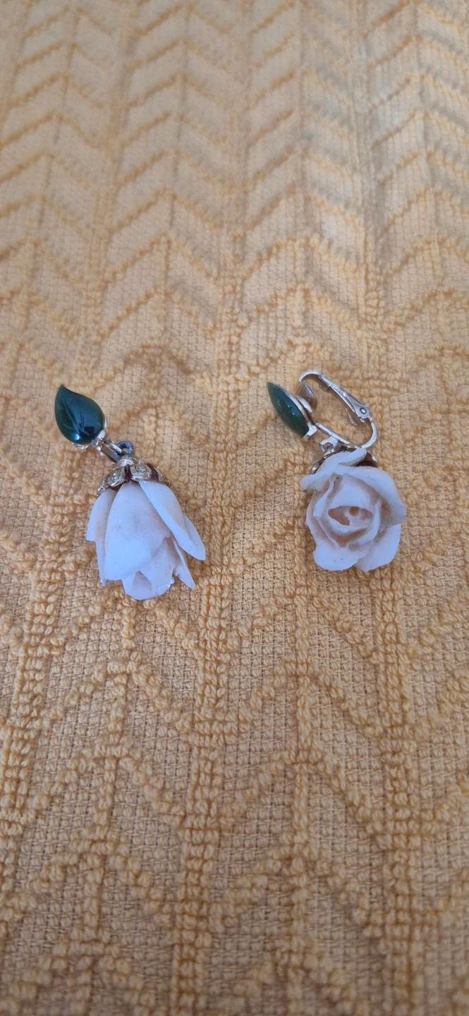 These are a pair of beautiful rose floral clip-on earrings. They feature a delicate rose design with green leaf accents. Perfect for adding a touch of elegance to any outfit!