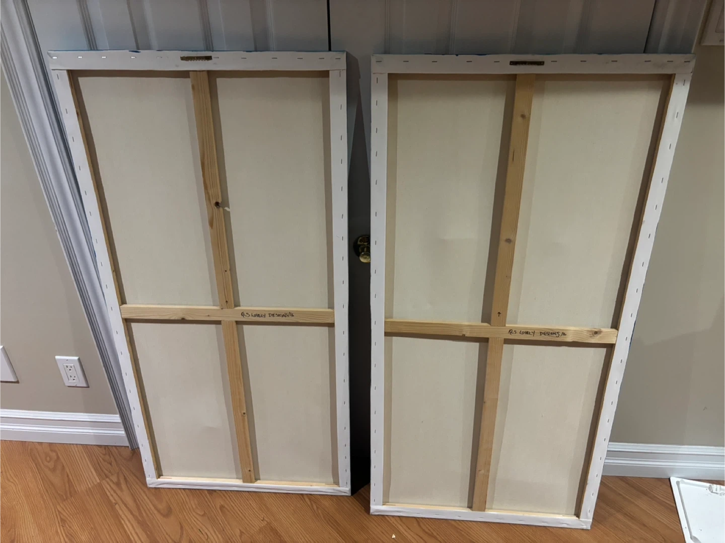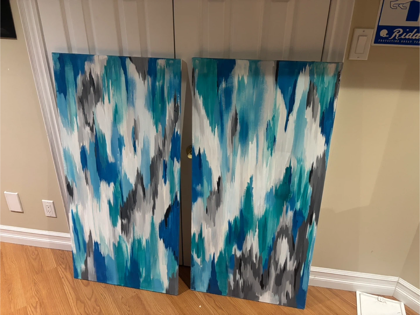 Selling two abstract canvas paintings, featuring a blend of blue, white, and grey hues. Perfect for adding a modern touch to any room. The artist is GS Lovely Designs.