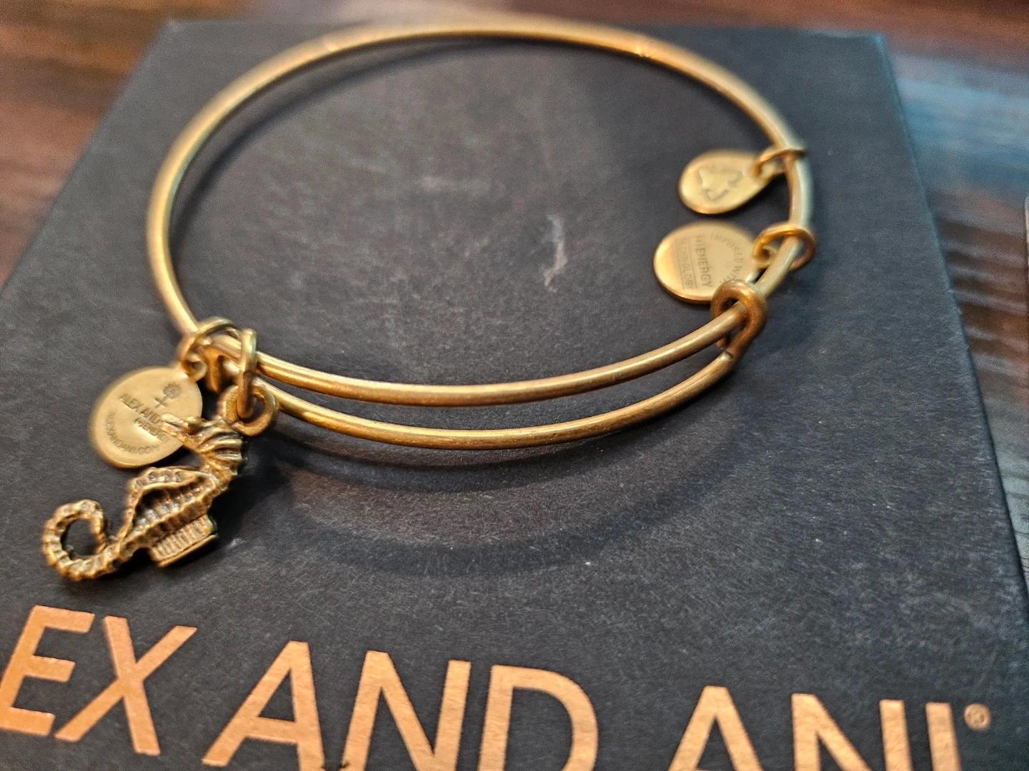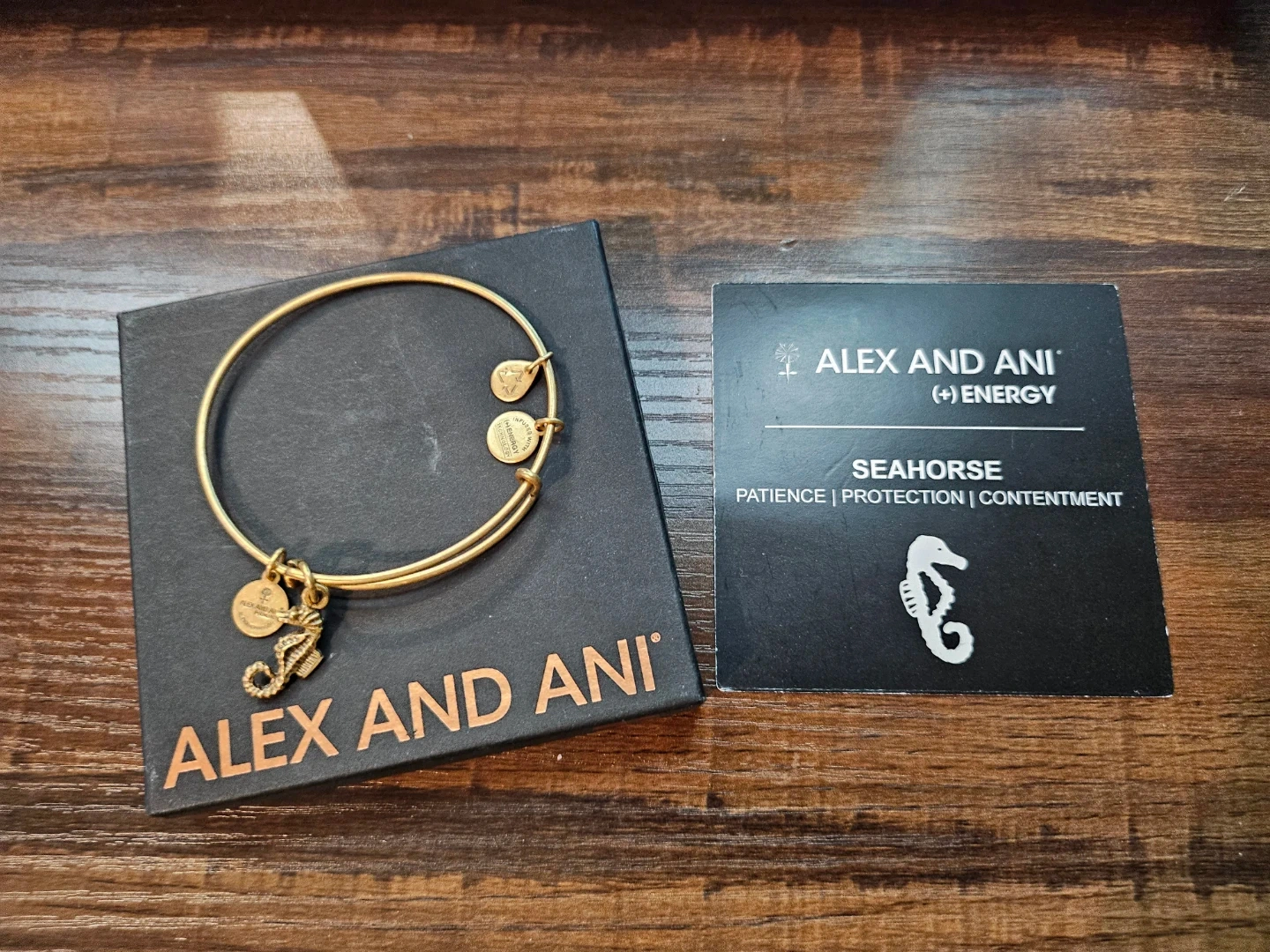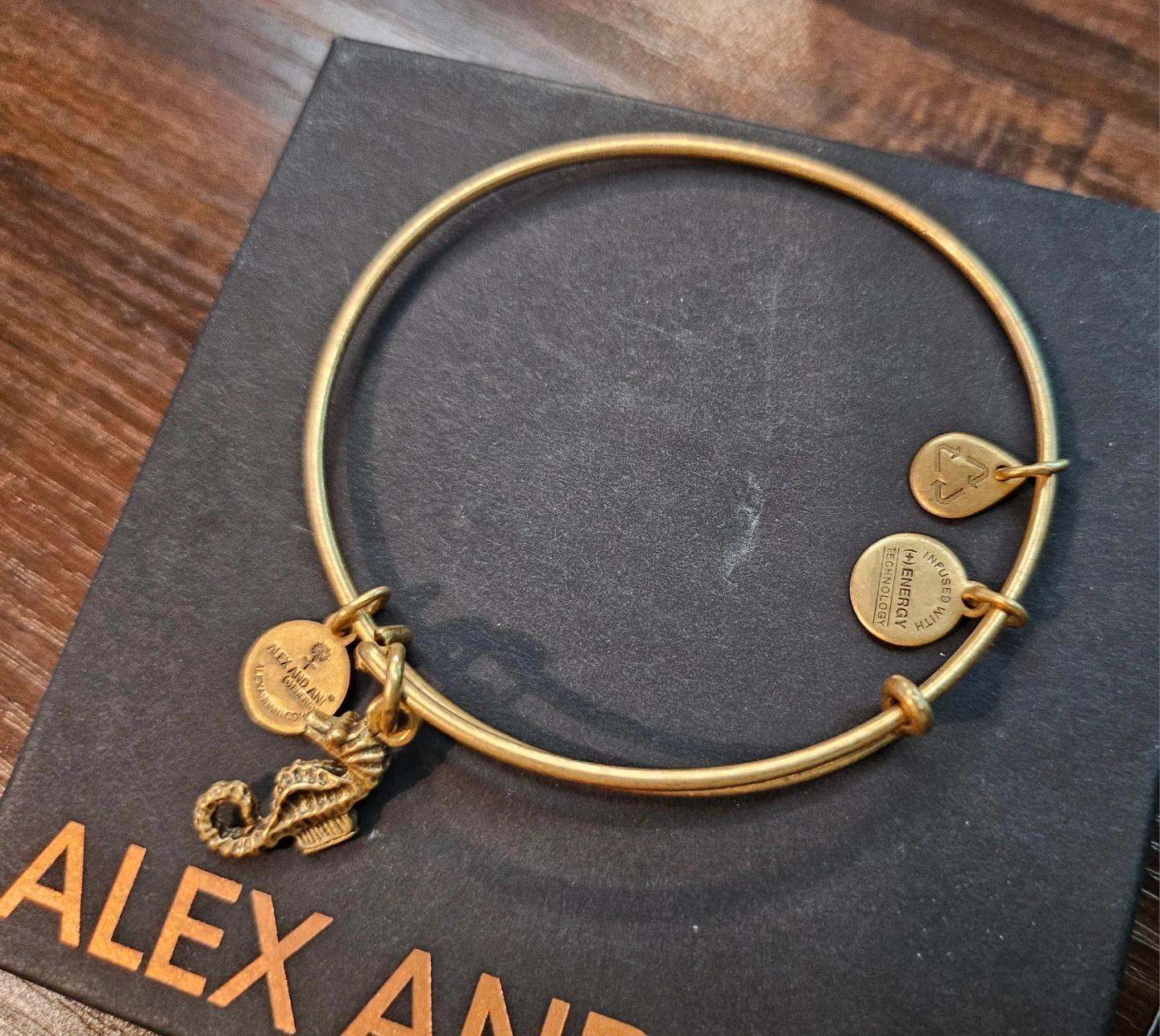 Selling an Alex and Ani bangle with a seahorse charm! It's in great condition and comes with the original box. The bangle is a lovely gold colour and would be a great addition to your jewellery collection!