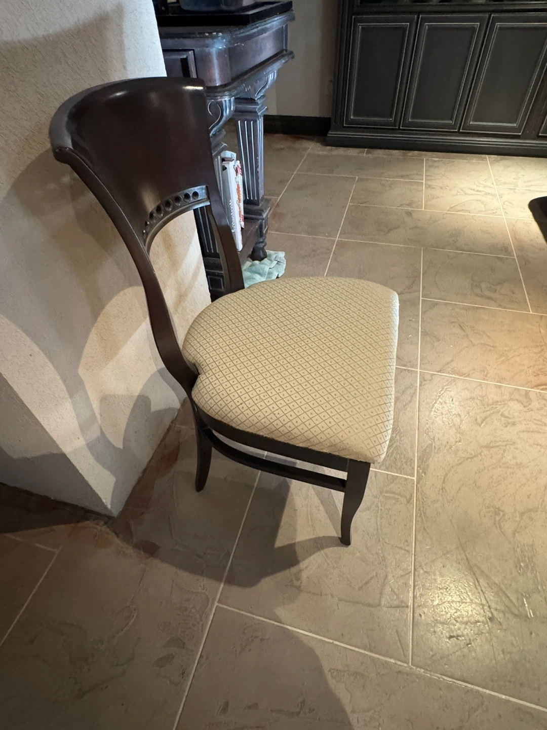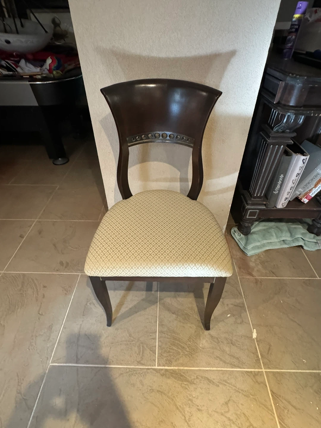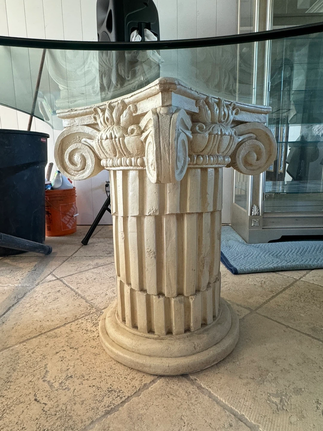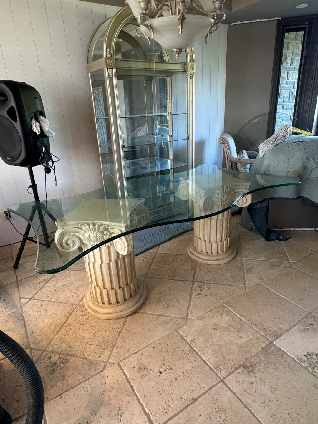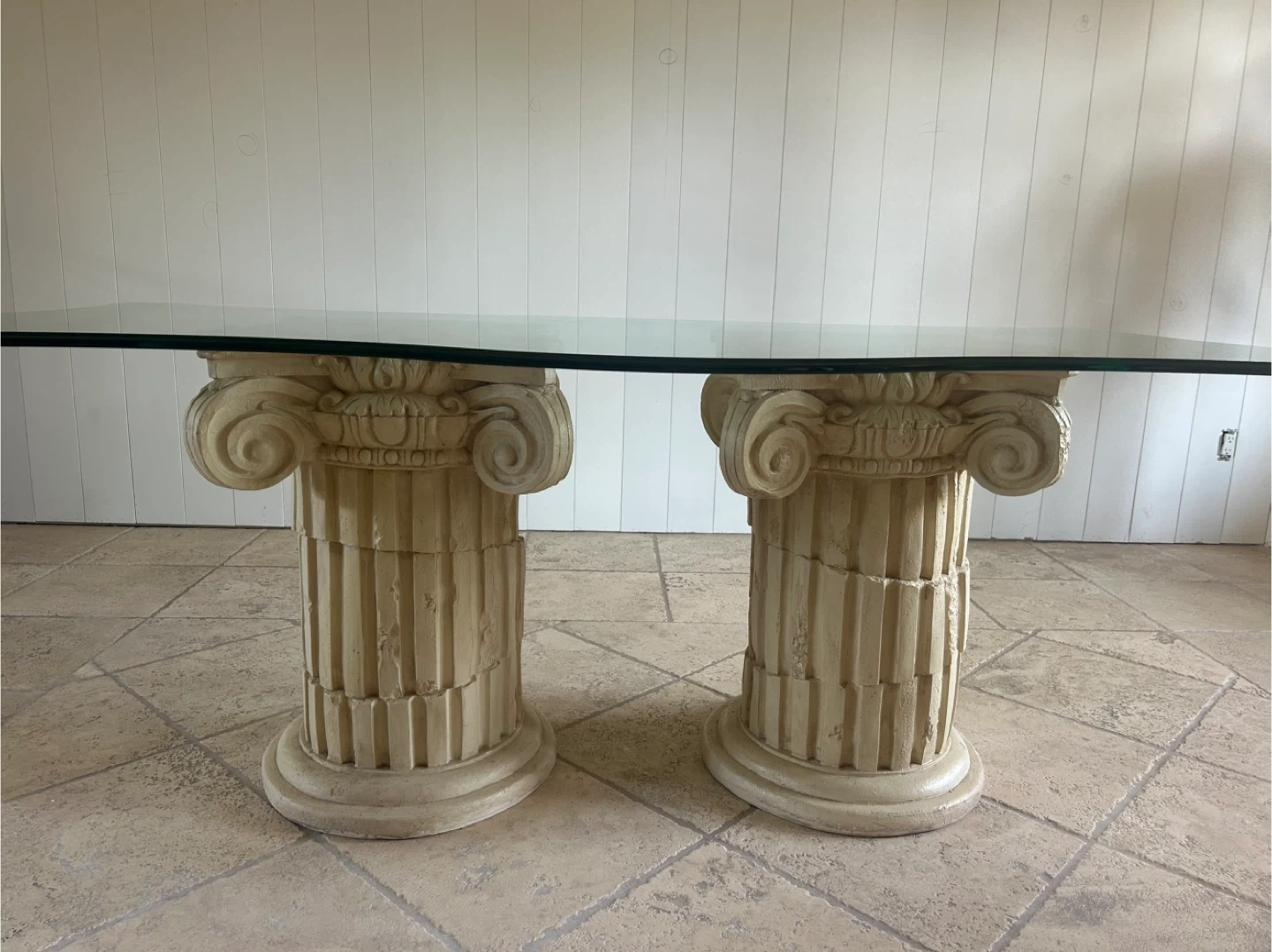 Selling a unique glass top dining table with a distinctive column base. The table features a clear glass top and a base made of two decorative columns. It would make a great addition to any dining room! Come with 7 chairs