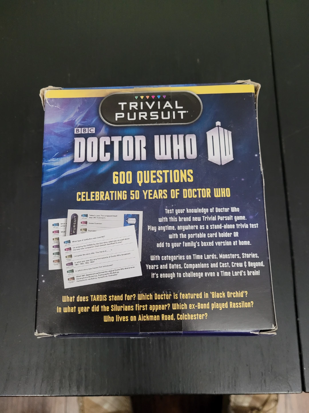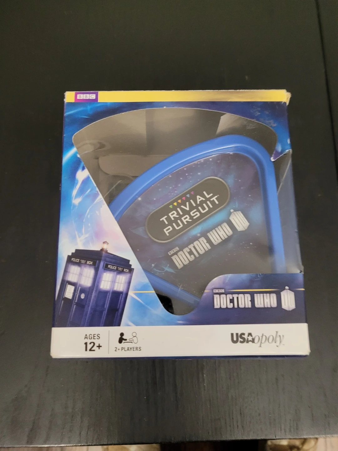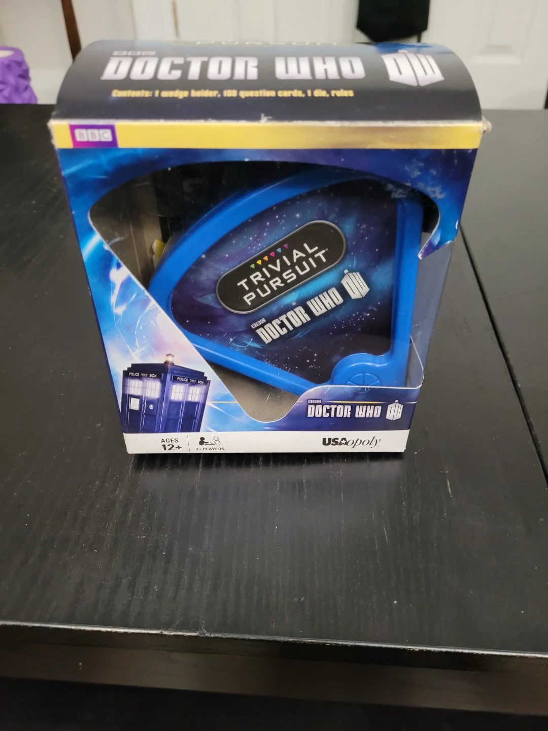 Selling a Trivial Pursuit Doctor Who edition game! It has 600 questions celebrating 50 years of Doctor Who. It can be played anytime, anywhere as a stand-alone trivia test with the portable card holder, or add to your family's boxed version at home. The box indicates it's for ages 12+ and for 2+ players. Included are 1 wedge holder, 100 question cards, 1 die, and rules