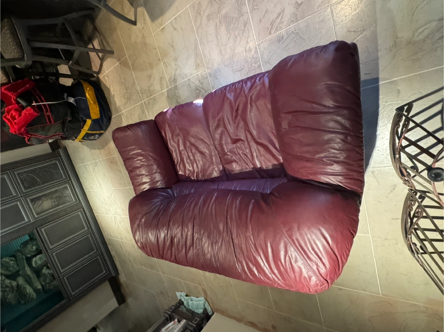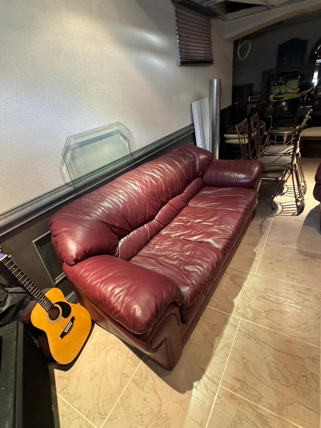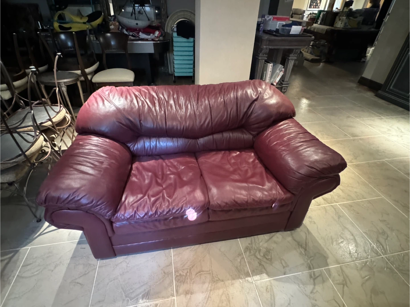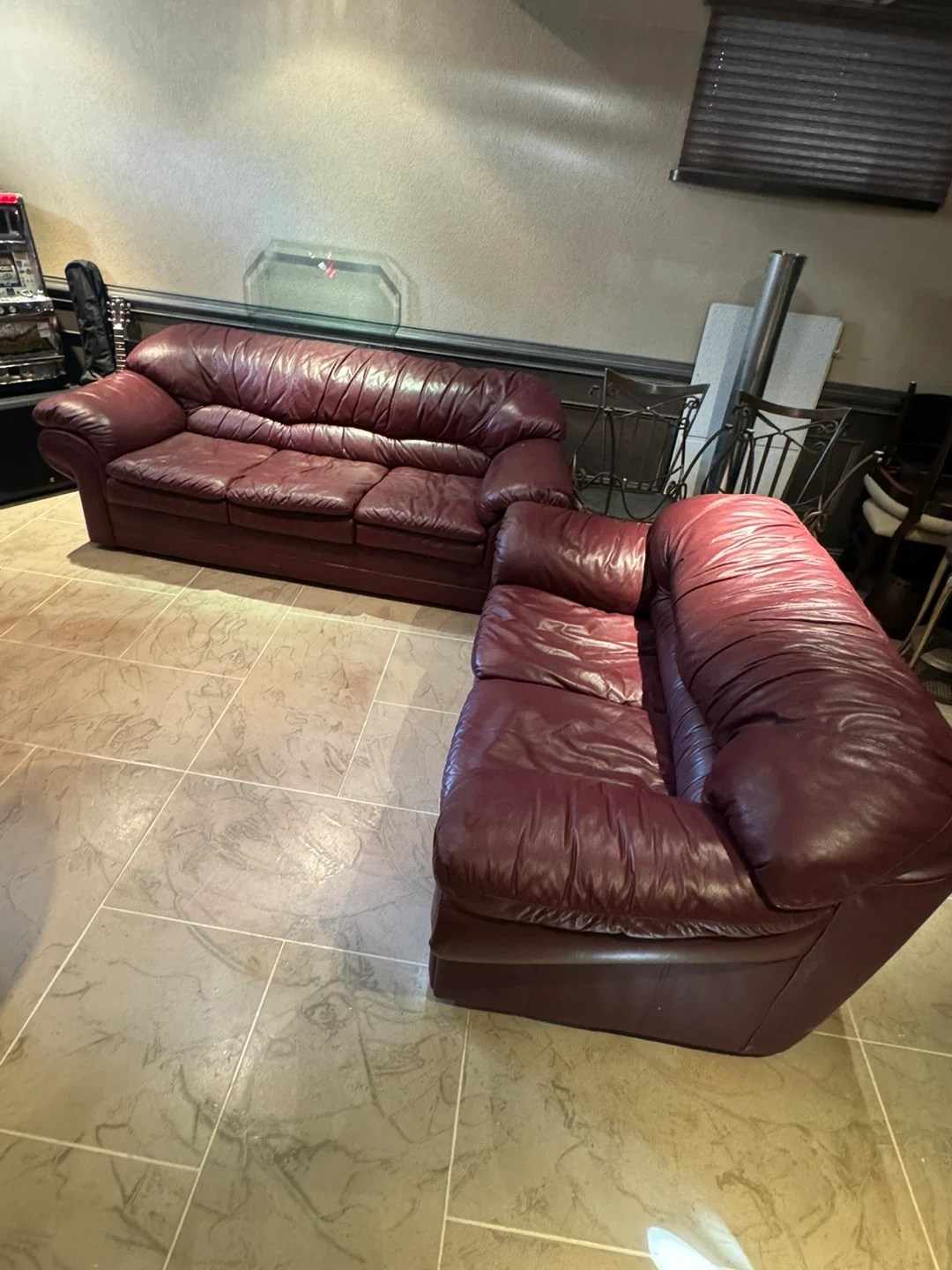 Selling a burgundy leather sofa set. The set includes a three-seater sofa and a loveseat. They're well-loved and ready for a new home!