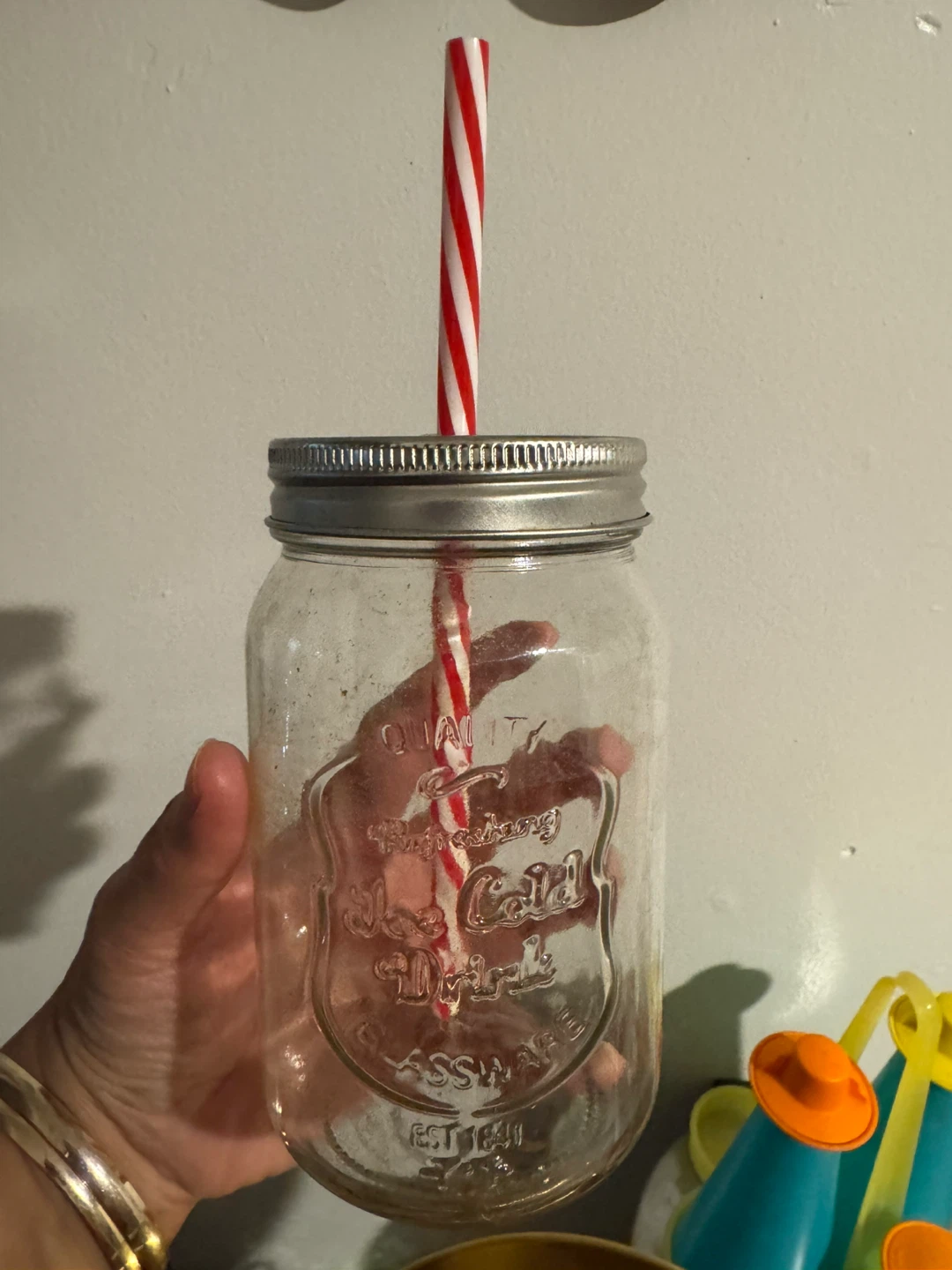 $2 each Selling a glass mason jar with a straw! The jar has a cute embossed design that says "Ice Cold Drink". It's perfect for summer beverages or just adding a bit of vintage charm to your kitchen