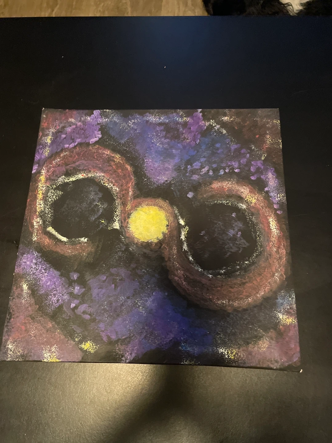 Selling a unique abstract art painting! The colours are really vibrant, with purples, yellows, and reds creating an interesting visual. It's in great shape and would look lovely in any room