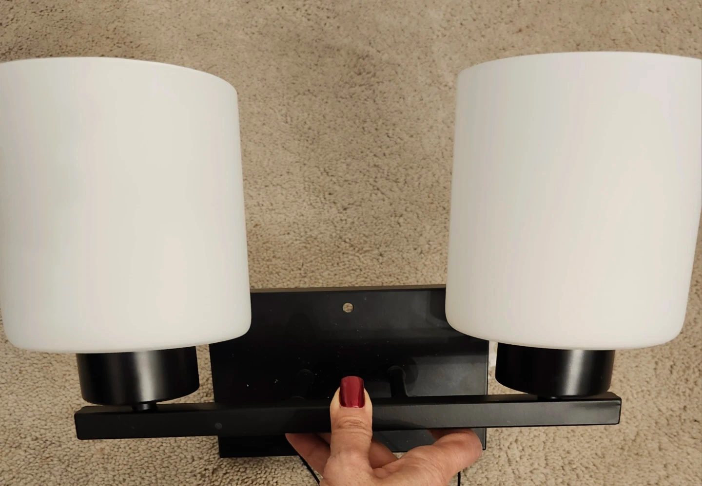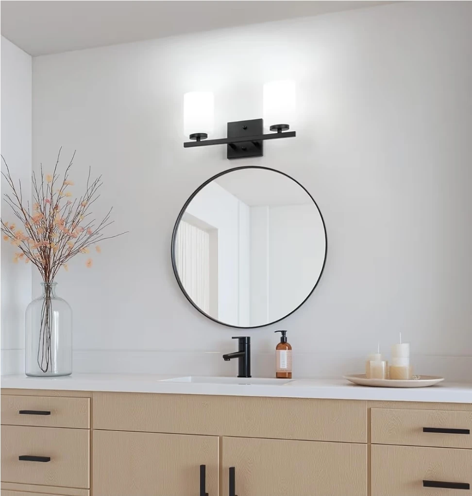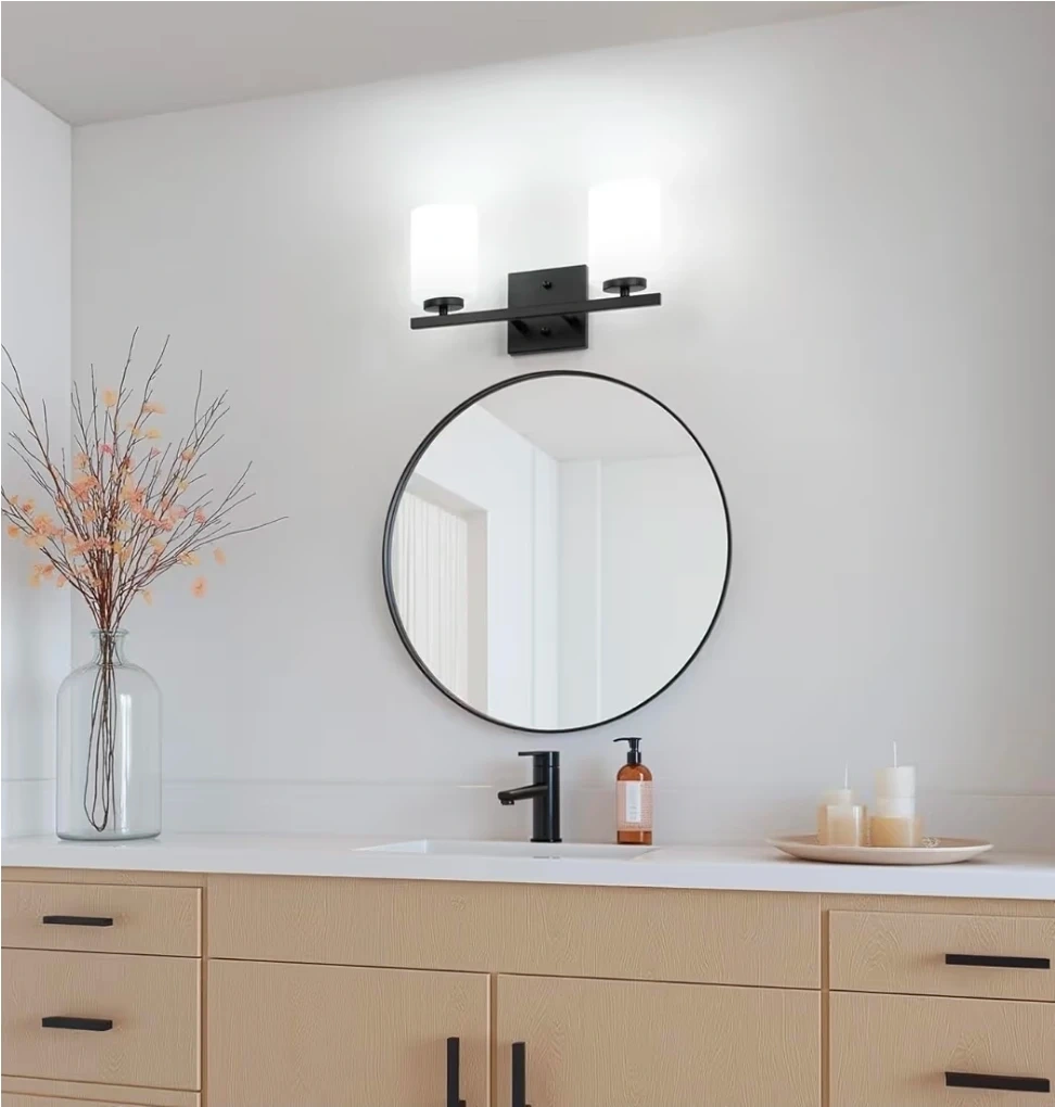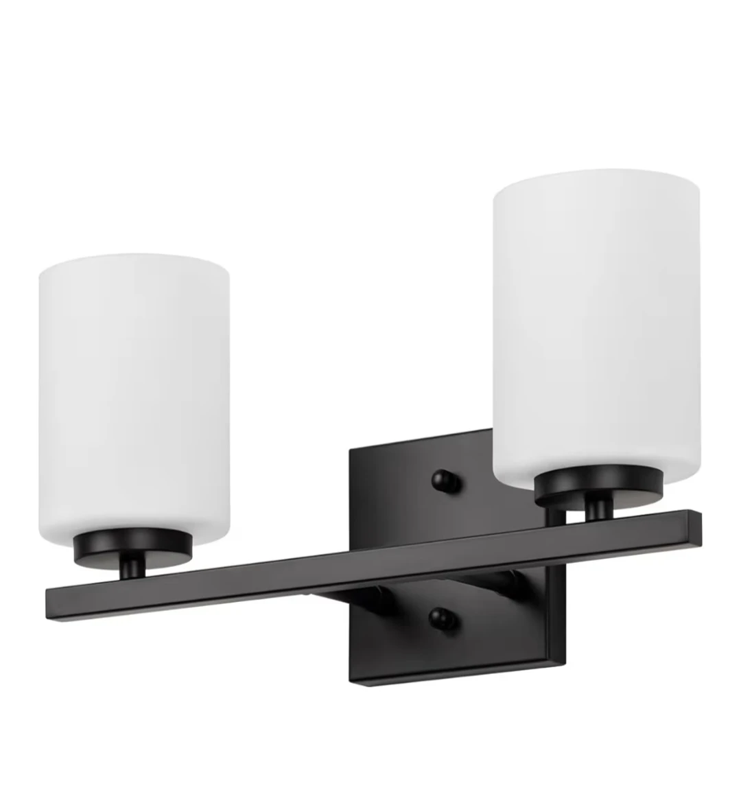 Selling a modern bathroom vanity light. It features a sleek black finish and two cylindrical white glass shades.