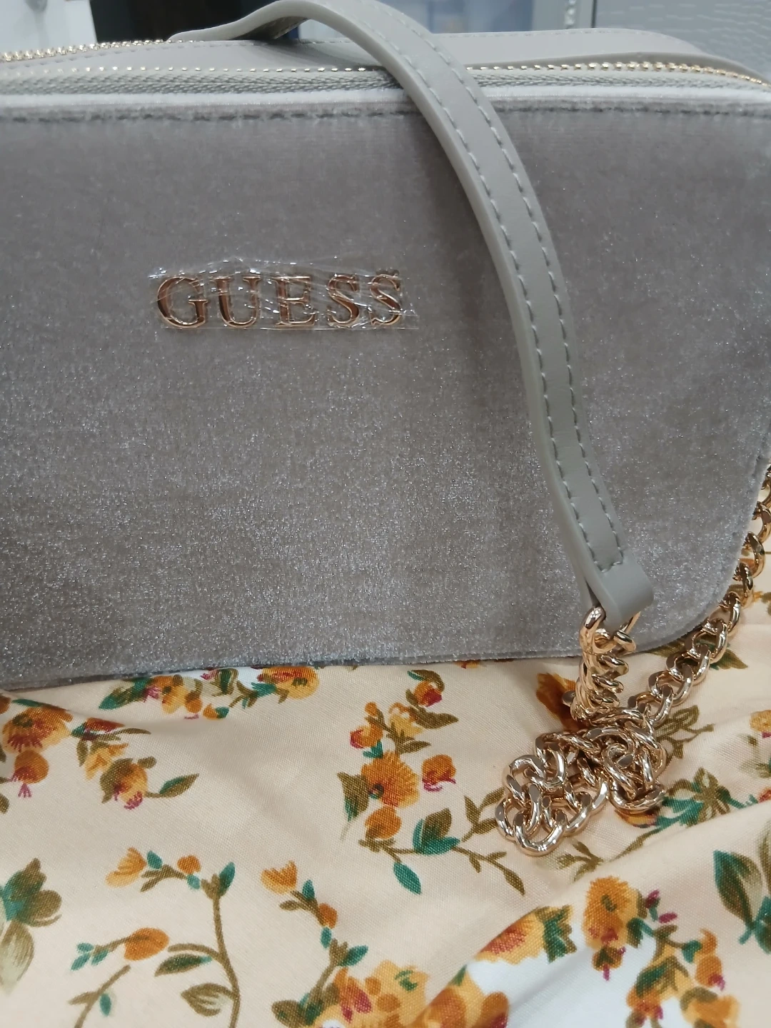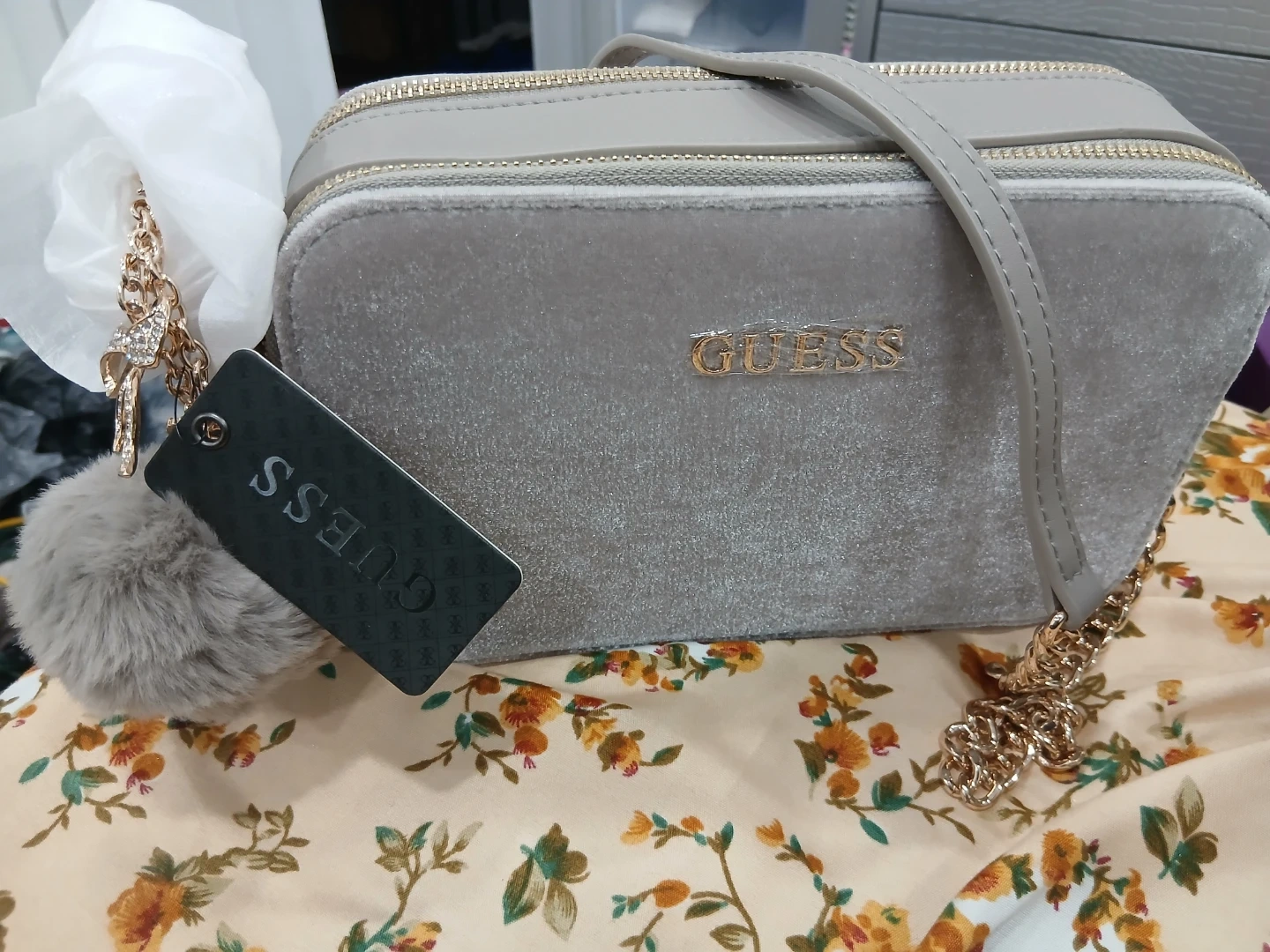 Selling a cute Guess crossbody bag in a soft grey velvet! It has a gold-tone chain detail and a fluffy pompom charm. Perfect for adding a touch of elegance to any outfit