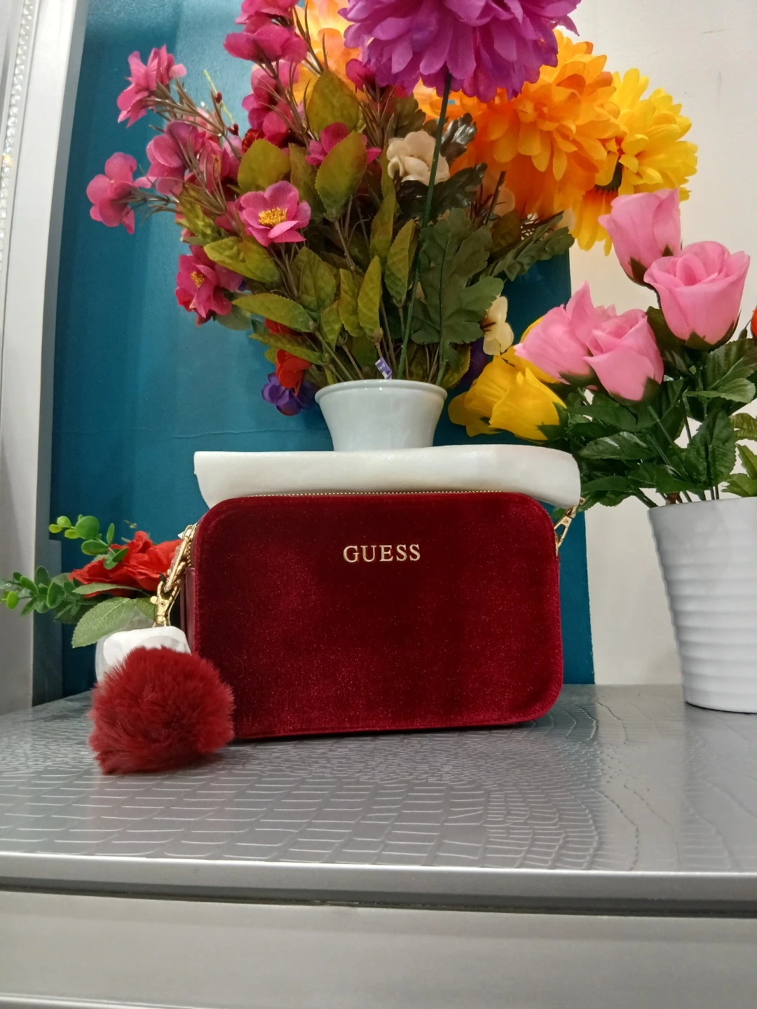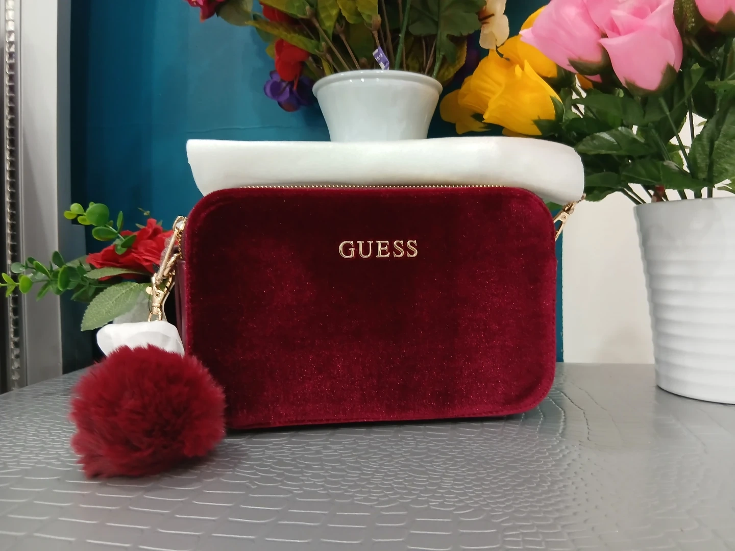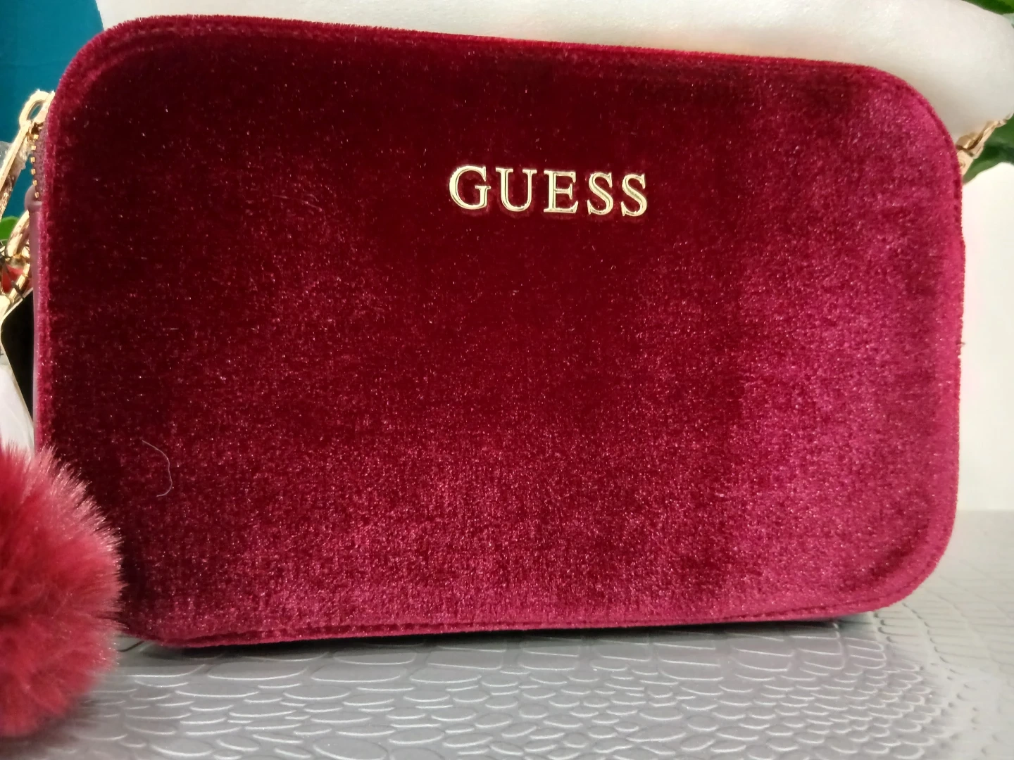Here's a beautiful Guess crossbody bag in a rich burgundy velvet! It's perfect for adding a touch of elegance to any outfit. The bag features the Guess logo in gold lettering and a cute pom-pom detail. It's in great condition and ready for a new owner!