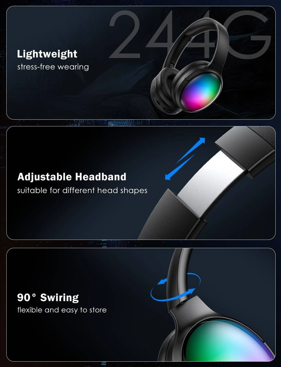 【Cool RGB Lighting】Bluetooth headphones offer three lighting modes Breathing-Cycling-Pulse Mode. The cool lighting effects enhance the visual appeal, providing you with an immersive experience, perfect for the young who fashion style. Note*:Light only work in Bluetooth mode.